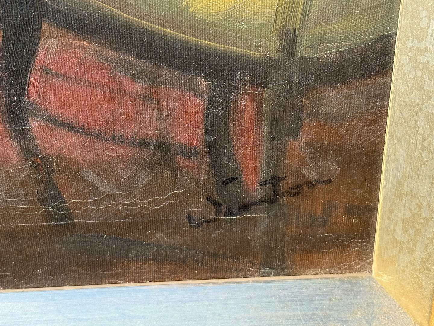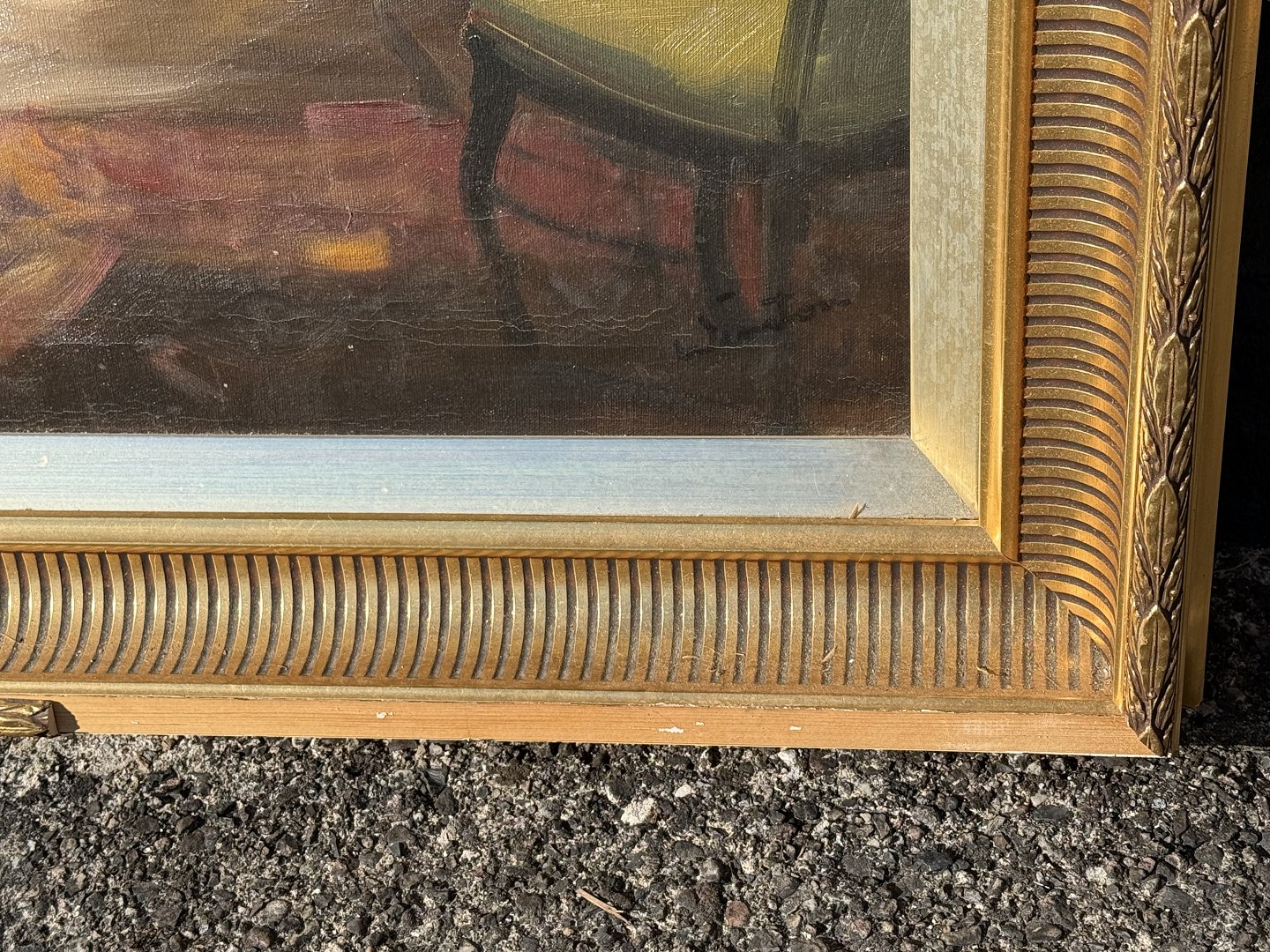 Kvinde i lyserød kjole ved pianette, oliemaleri på lærred, utydeligt signeret *fremstår med en del afslag på rammen ellers pæn stand*