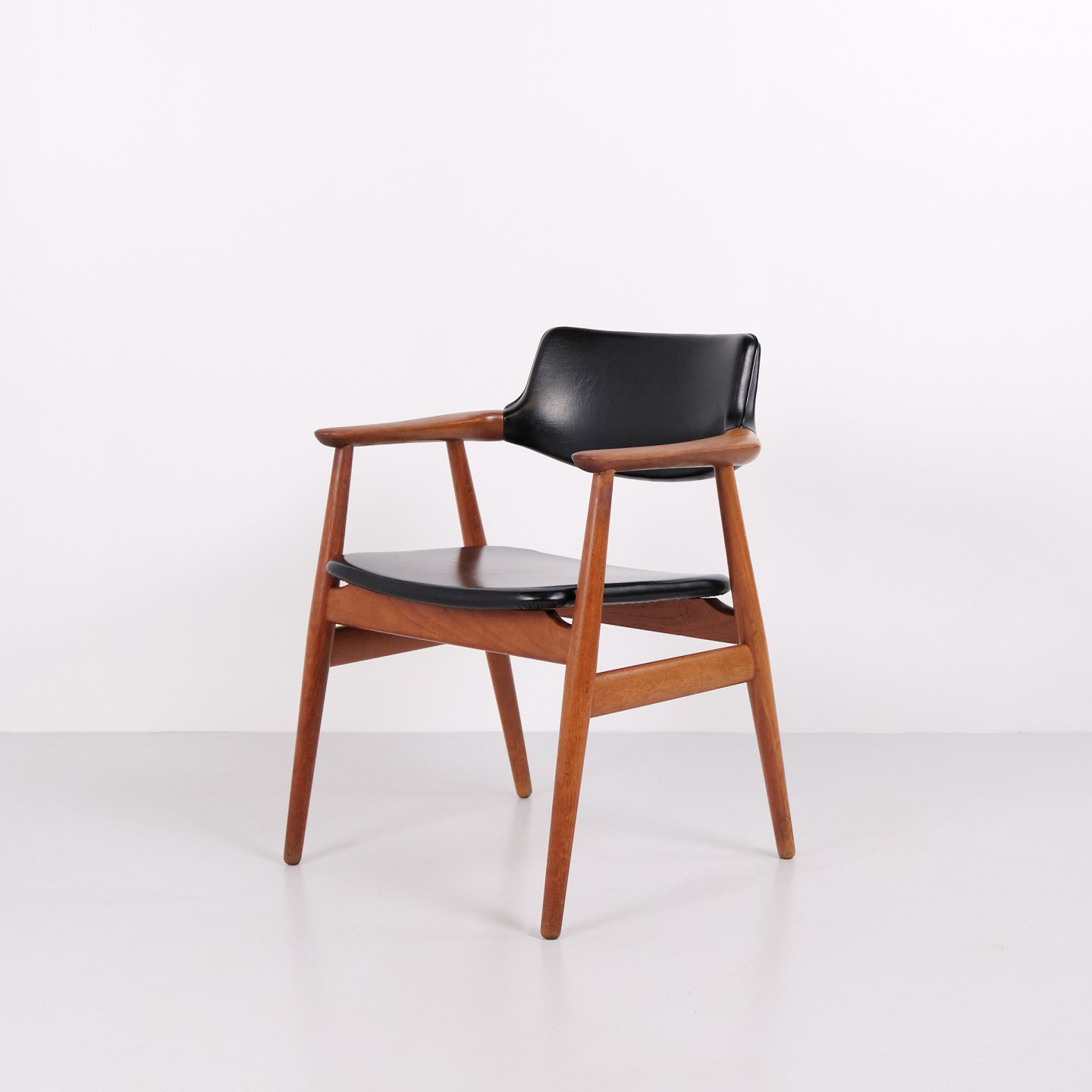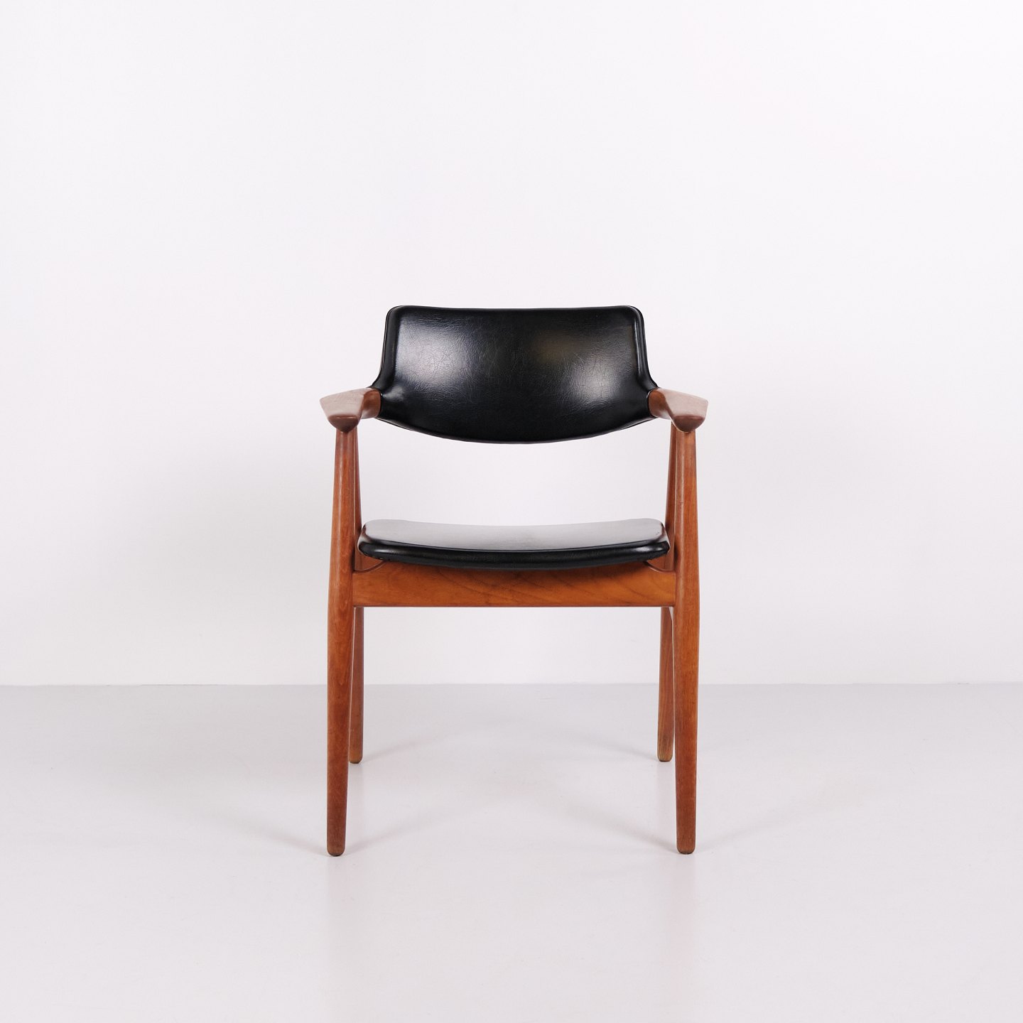 Sæt af 6 GM11 spisestuestole designet af Svend Aage Eriksen for Glostrup Møbelfabrik i 1960’erne. Stolene er udført i massiv teak med sort læder på sæde og ryg. Model GM11 er kendt for de organiske linjer, let svungne armlæn og høj siddekomfort. Et klassisk dansk design med elegant snedkerarbejde og flotte proportioner, velegnet til både spisebord og mødelokale. Sættet sælges kun samlet.
