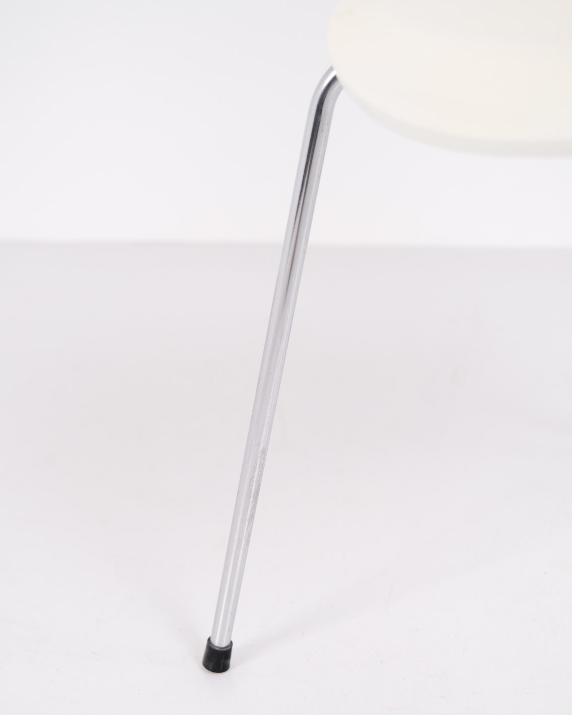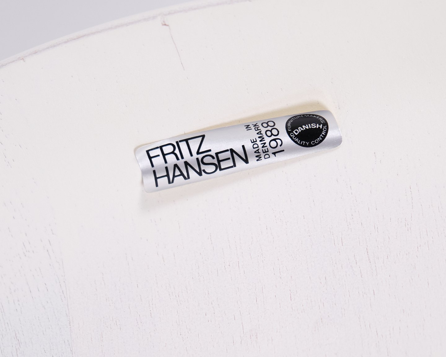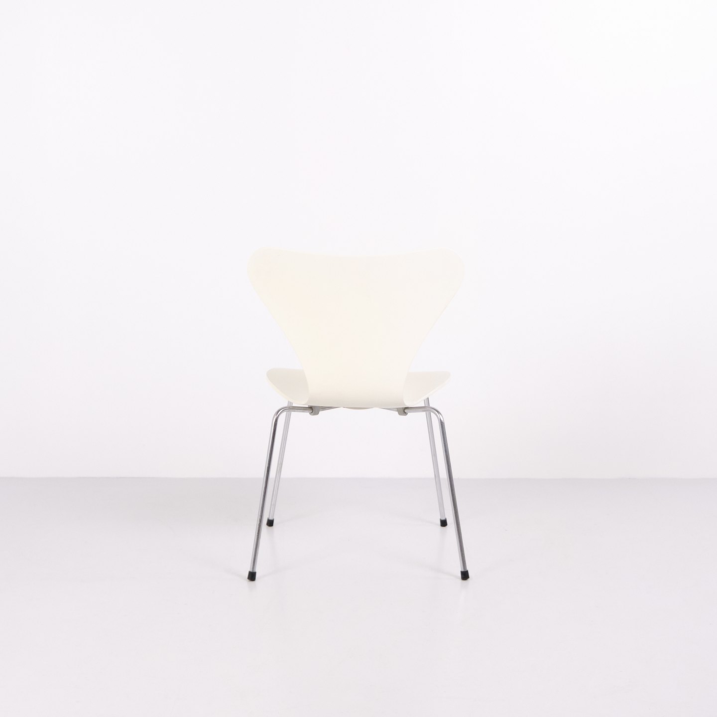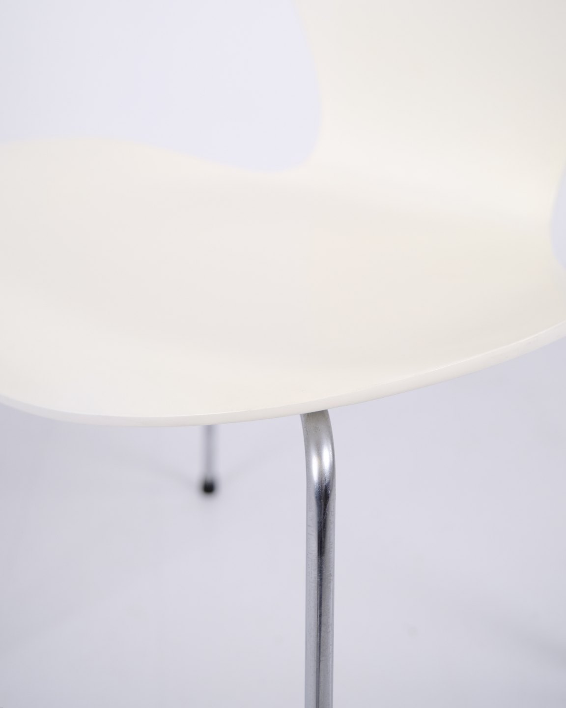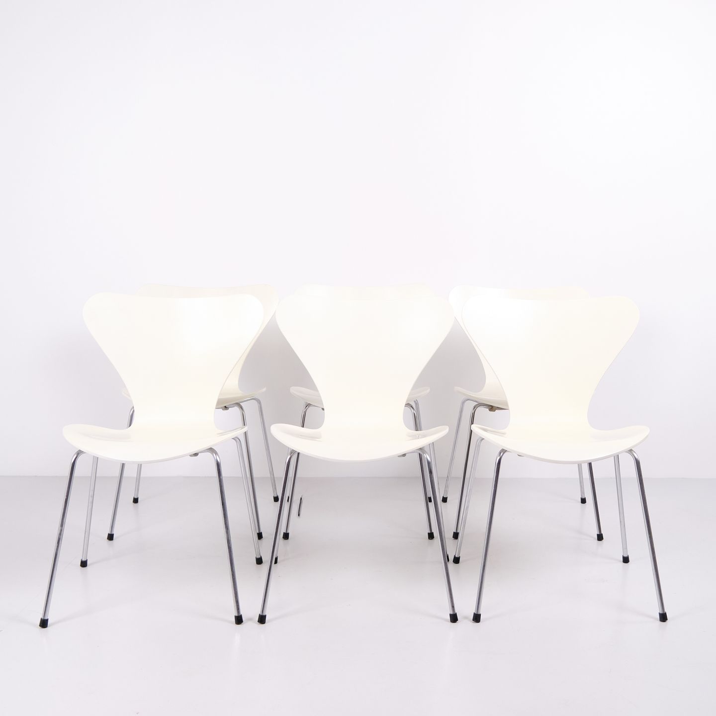 Sæt af 6 Syverstole model 3107 designet af Arne Jacobsen for Fritz Hansen. Modellen blev introduceret i 1955 og er en videreudvikling af Myren fra 1952. Stolen er udført i formspændt finér med hvidlakeret overflade og forkromet stålrørsstel. Den karakteristiske syvtalsform gjorde modellen til en af de mest producerede stole i dansk designhistorie. 3107 har været anvendt i private hjem, restauranter, kontorer og offentlige interiører verden over og produceres fortsat af Fritz Hansen. Sælges kun samlet.— Oprindelse: Danmark