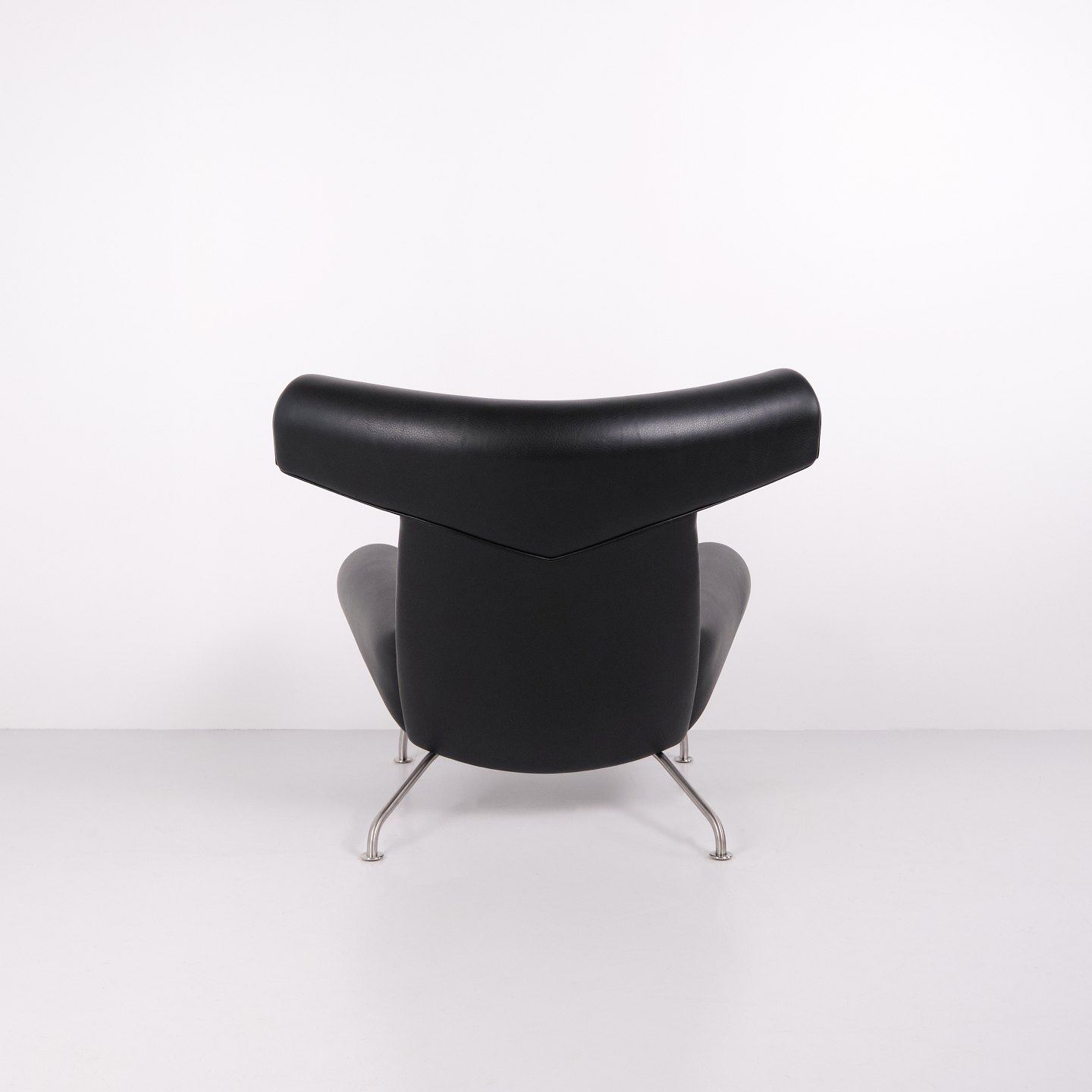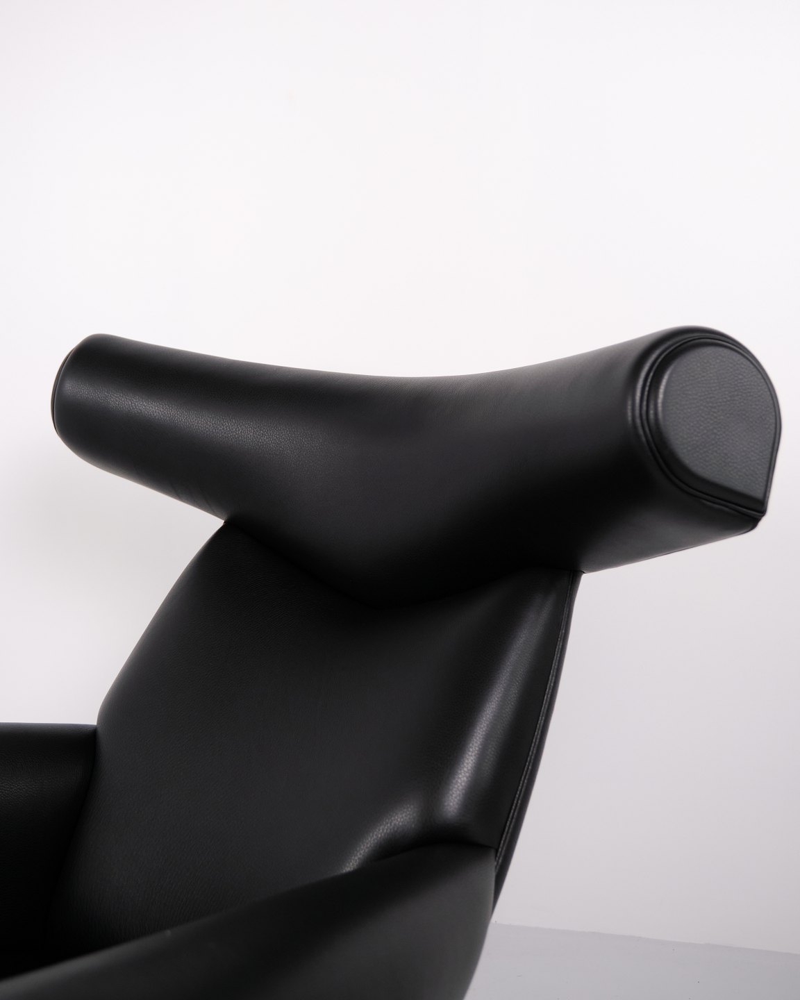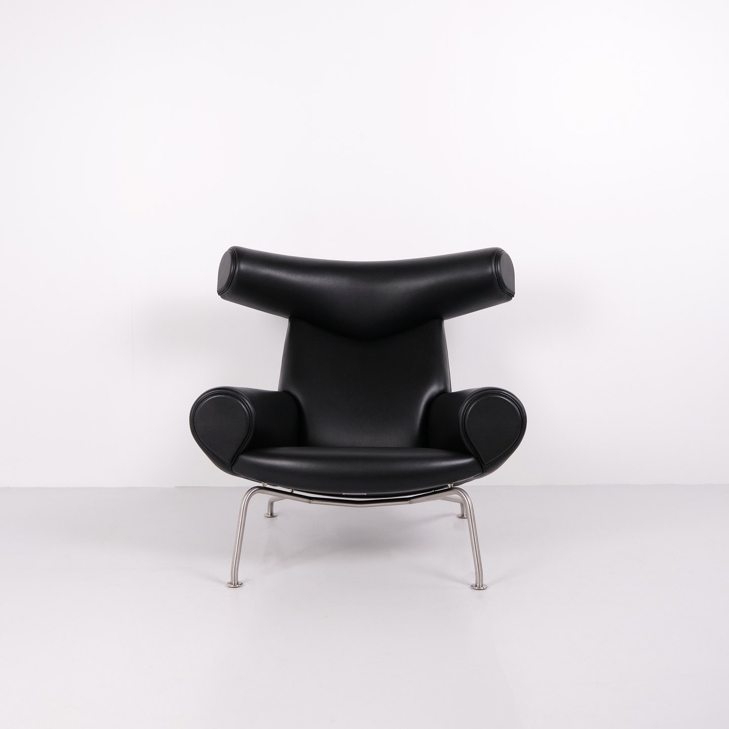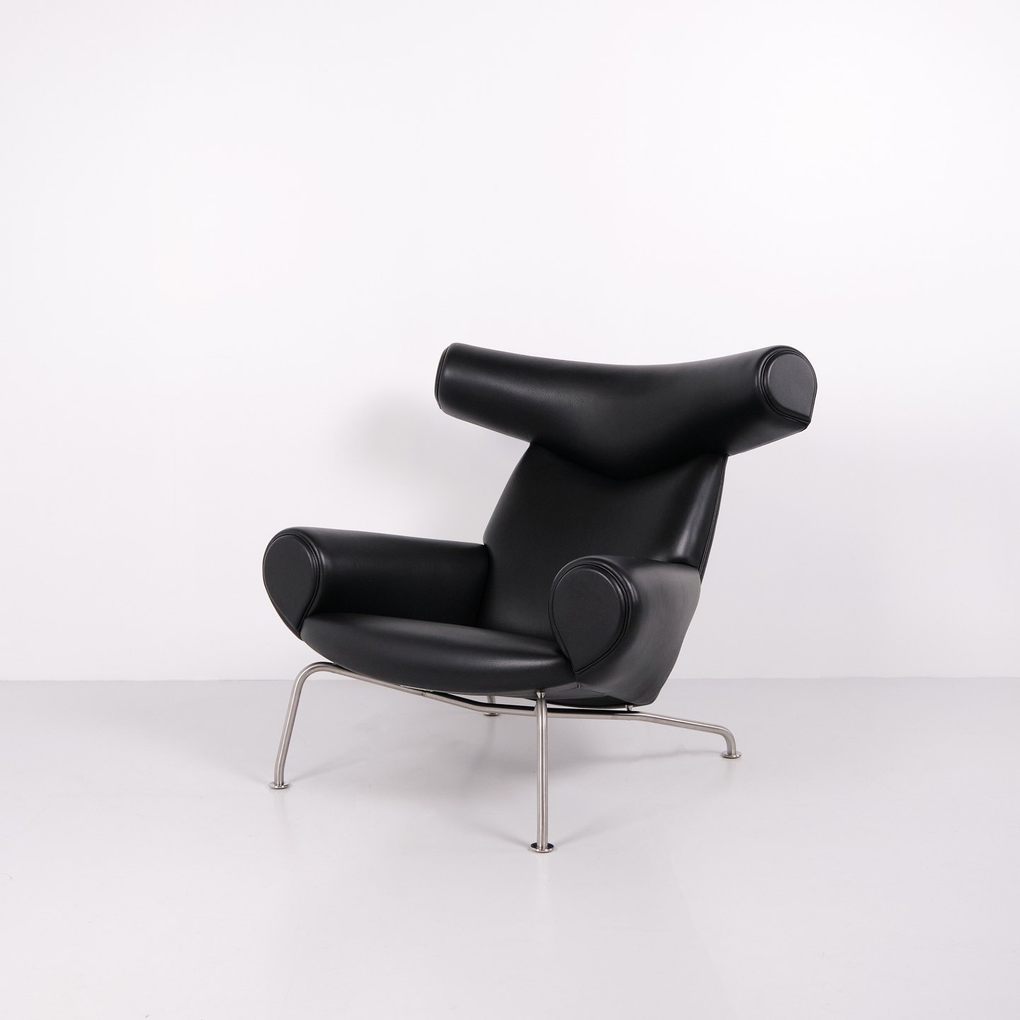Ox Chair model EJ100 med tilhørende skammel designet af Hans J. Wegner. Modellen blev tegnet i 1960 og produceres i dag af Fredericia Furniture efter overtagelsen af Erik Jørgensen. Stolen er udført i sort læder med stel i stål. Det markante ryglæn med “horn” gav modellen navnet Ox Chair. ´— Oprindelse: Danmark