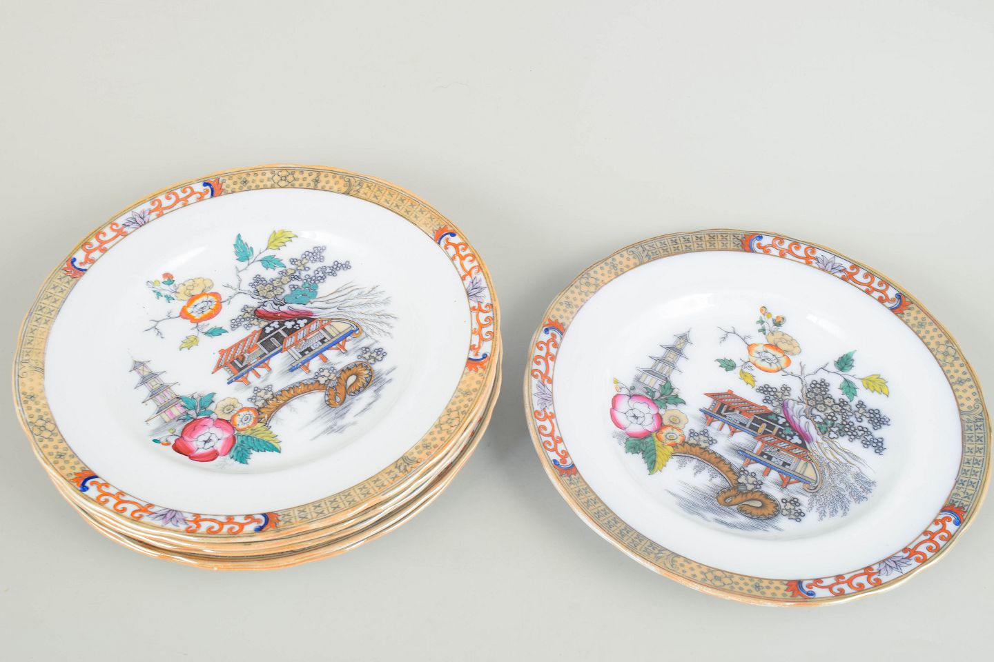 Rörstrand "Japan", sæt af seks middagstallerkener.Middagstallerkener i fajance med orientalsk inspireret dekoration i polykrome farver og detaljerig bemaling i japansk stil, karakteristisk for Rörstrands japanismeproduktion fra begyndelsen af 1900-tallet.