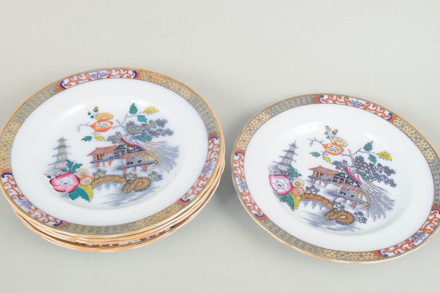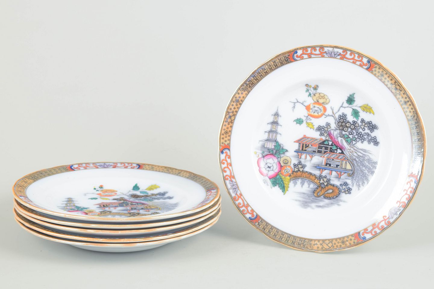 Rörstrand "Japan", sæt af seks middagstallerkener.Middagstallerkener i fajance med orientalsk inspireret dekoration i polykrome farver og detaljerig bemaling i japansk stil, karakteristisk for Rörstrands japanismeproduktion fra begyndelsen af 1900-tallet.