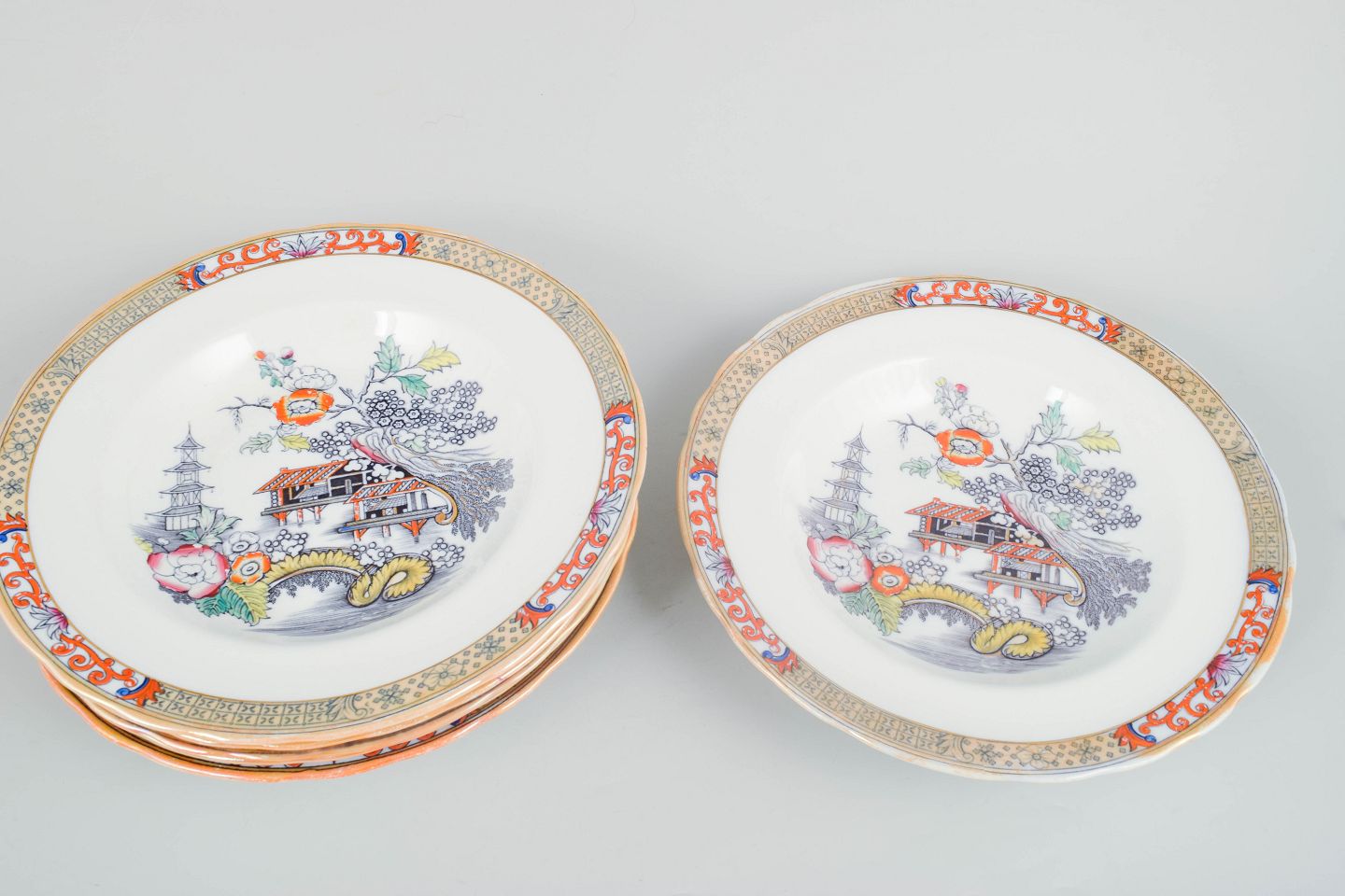 Rörstrand "Japan", sæt af seks dybe tallerkener.Dybe tallerkener i fajance med orientalsk inspireret dekoration i polykrome farver og detaljerig bemaling i japansk stil, karakteristisk for Rörstrands japanismeproduktion fra begyndelsen af 1900-tallet.
