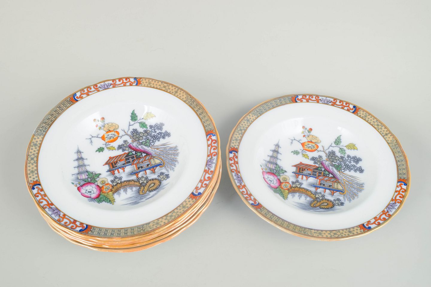 Dybe tallerkener i fajance med orientalsk inspireret dekoration i polykrome farver og detaljerig bemaling i japansk stil, karakteristisk for Rörstrands japanismeproduktion fra begyndelsen af 1900-tallet.