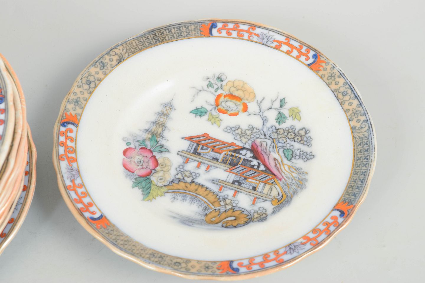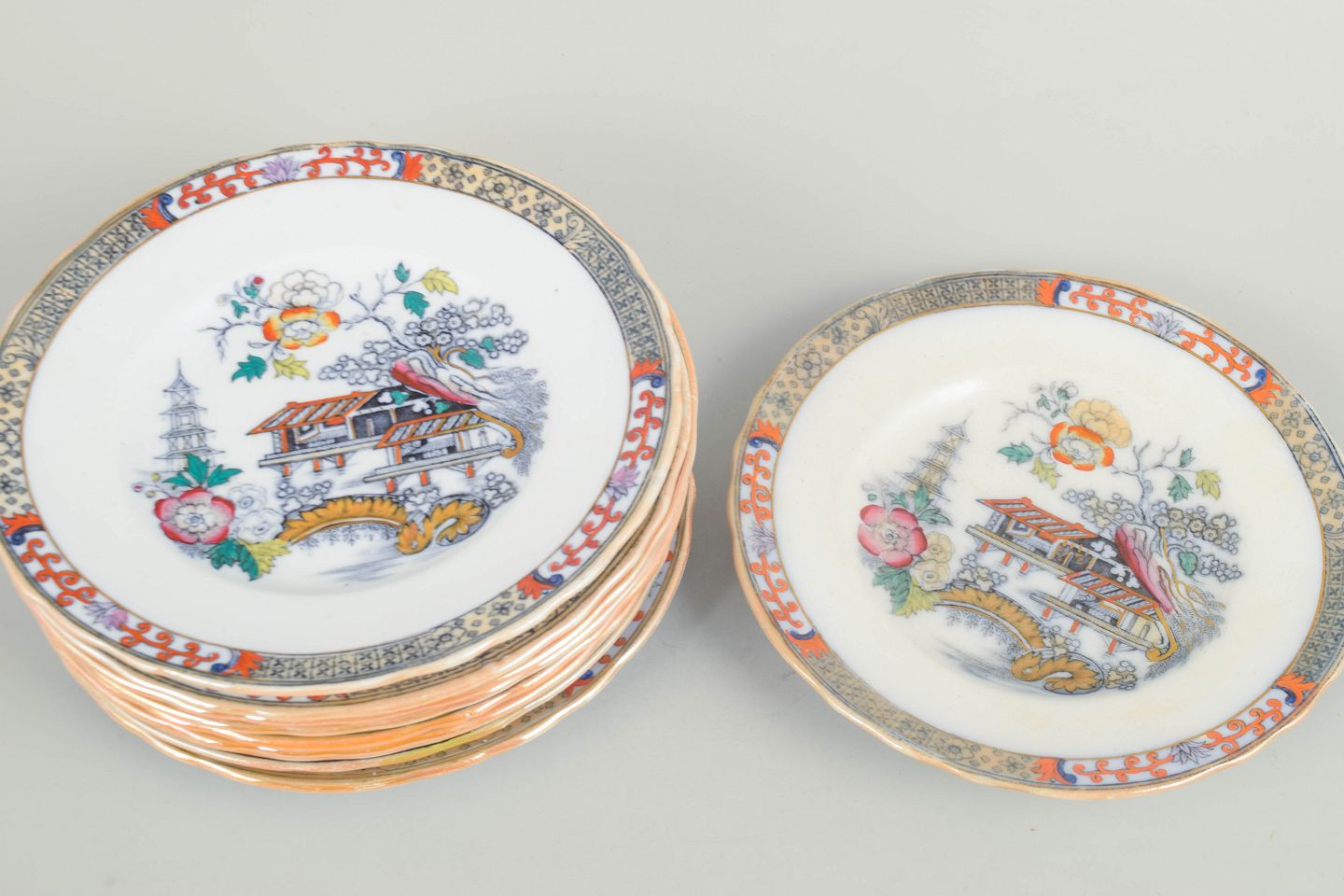 Rörstrand "Japan", sæt af ti flade tallerkener.Flade tallerkener i fajance med orientalsk inspireret dekoration i polykrome farver og detaljerig bemaling i japansk stil, karakteristisk for Rörstrands japanismeproduktion fra begyndelsen af 1900-tallet.