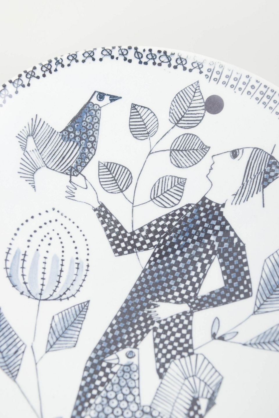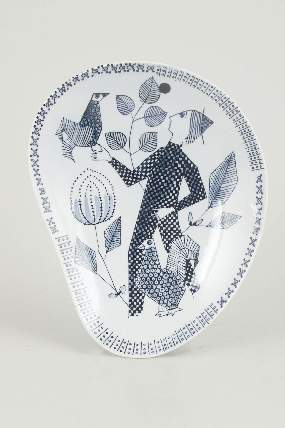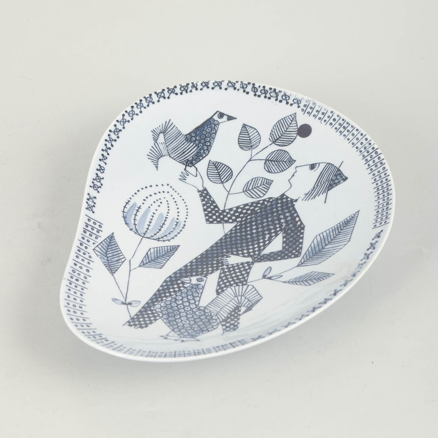 Sylvia Leuchovius for Rörstrand, fad.Dekorativt keramisk fad med stiliseret figur- og naturmotiv i sort på hvid bund, udført med grafisk præcision og karakteristisk for Leuchovius’ arbejde med fortællende dekorationer.