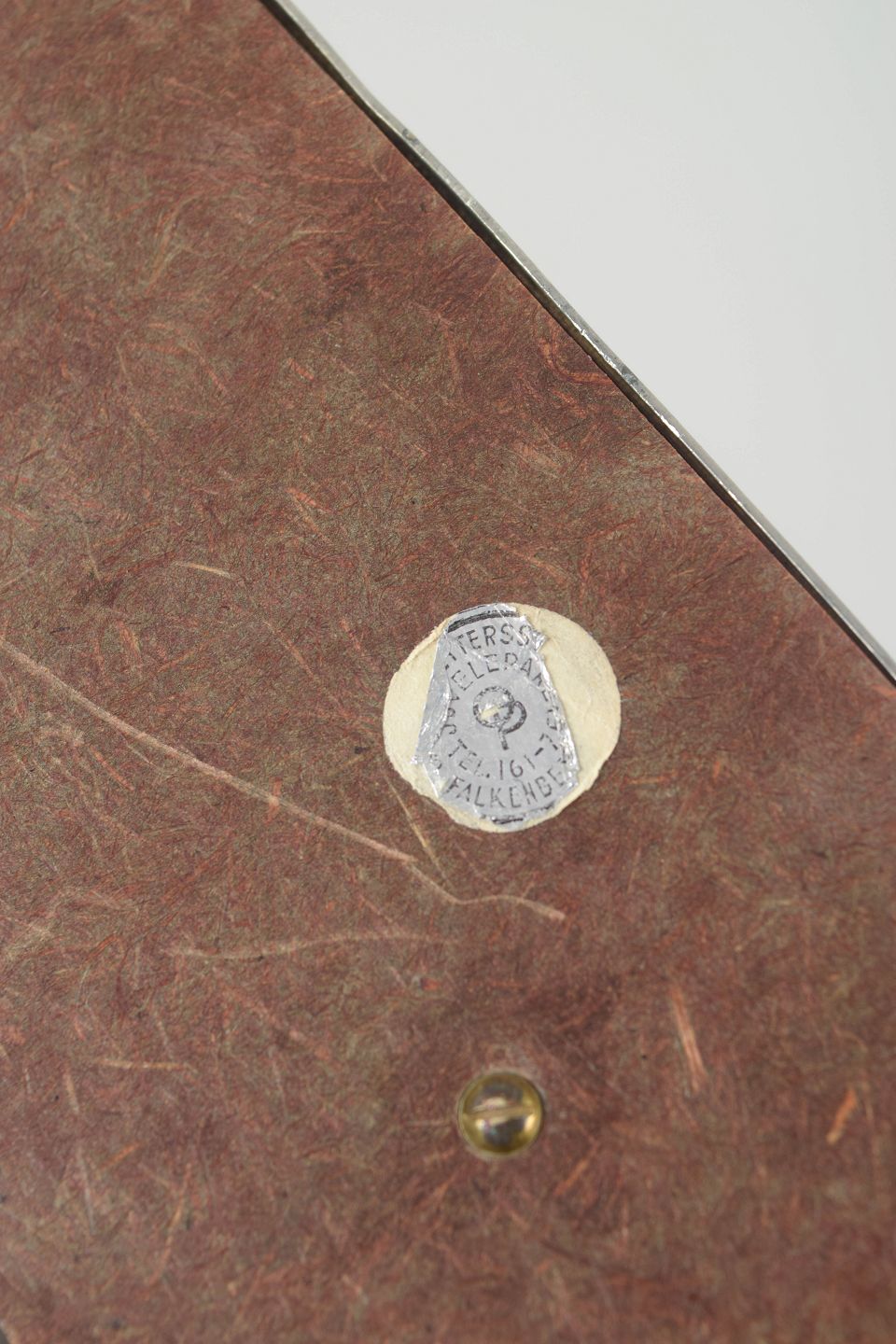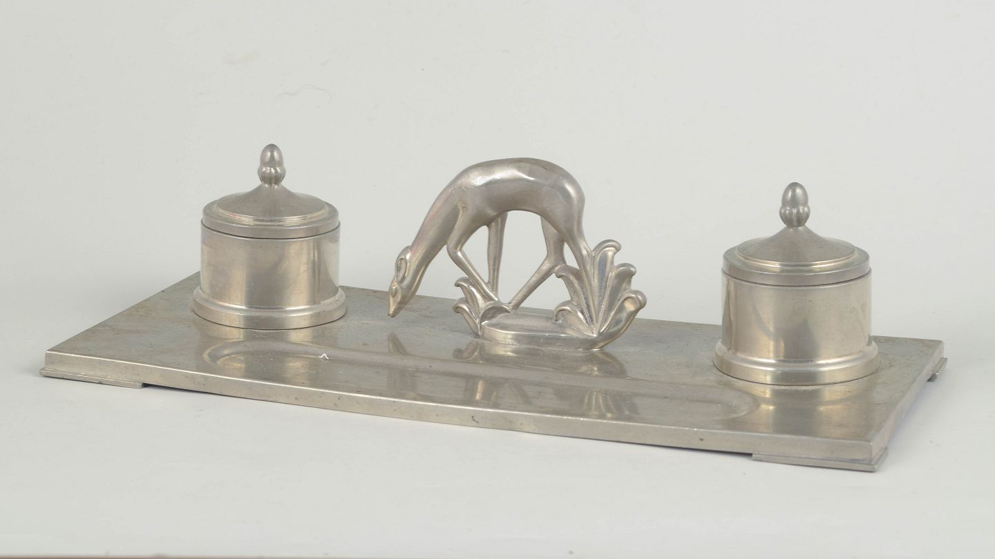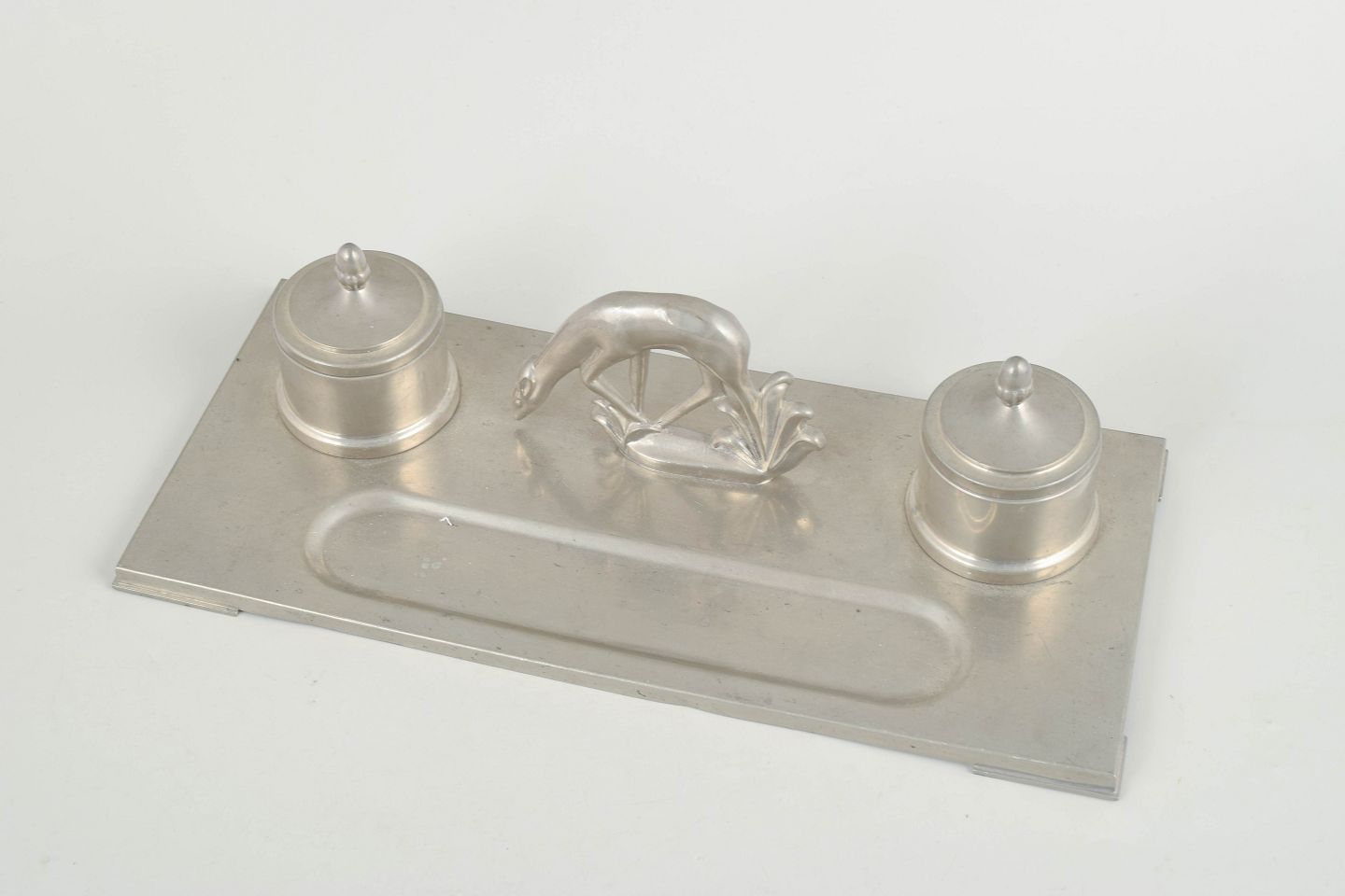 Carl Einar Borgström for Ystad Tenn, blækhus i tin.Rektangulært blækhus i tin med to beholdere og dekorativ hjortefigur i midten. Den ene glasindsats mangler. Stemplet under bunden.
