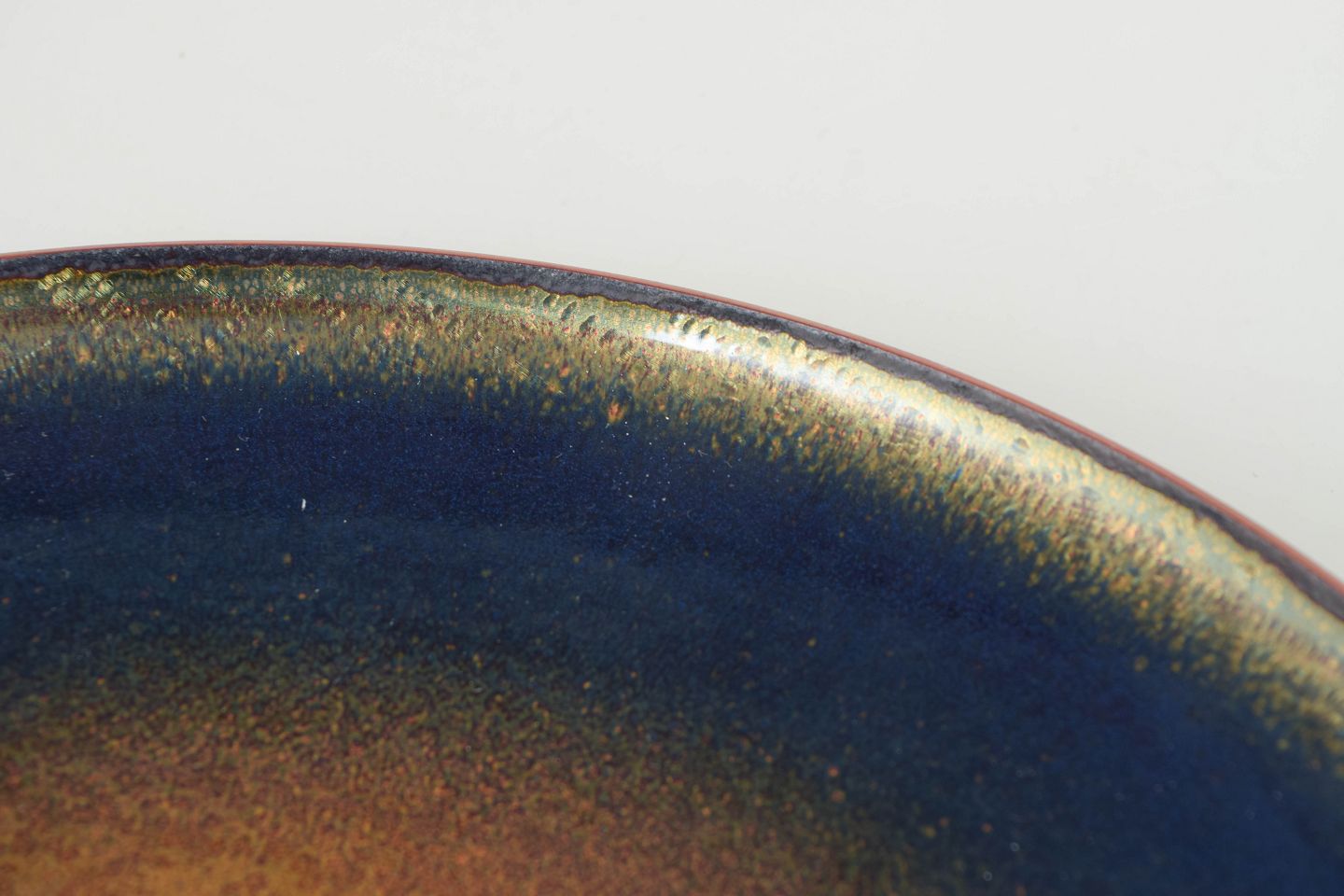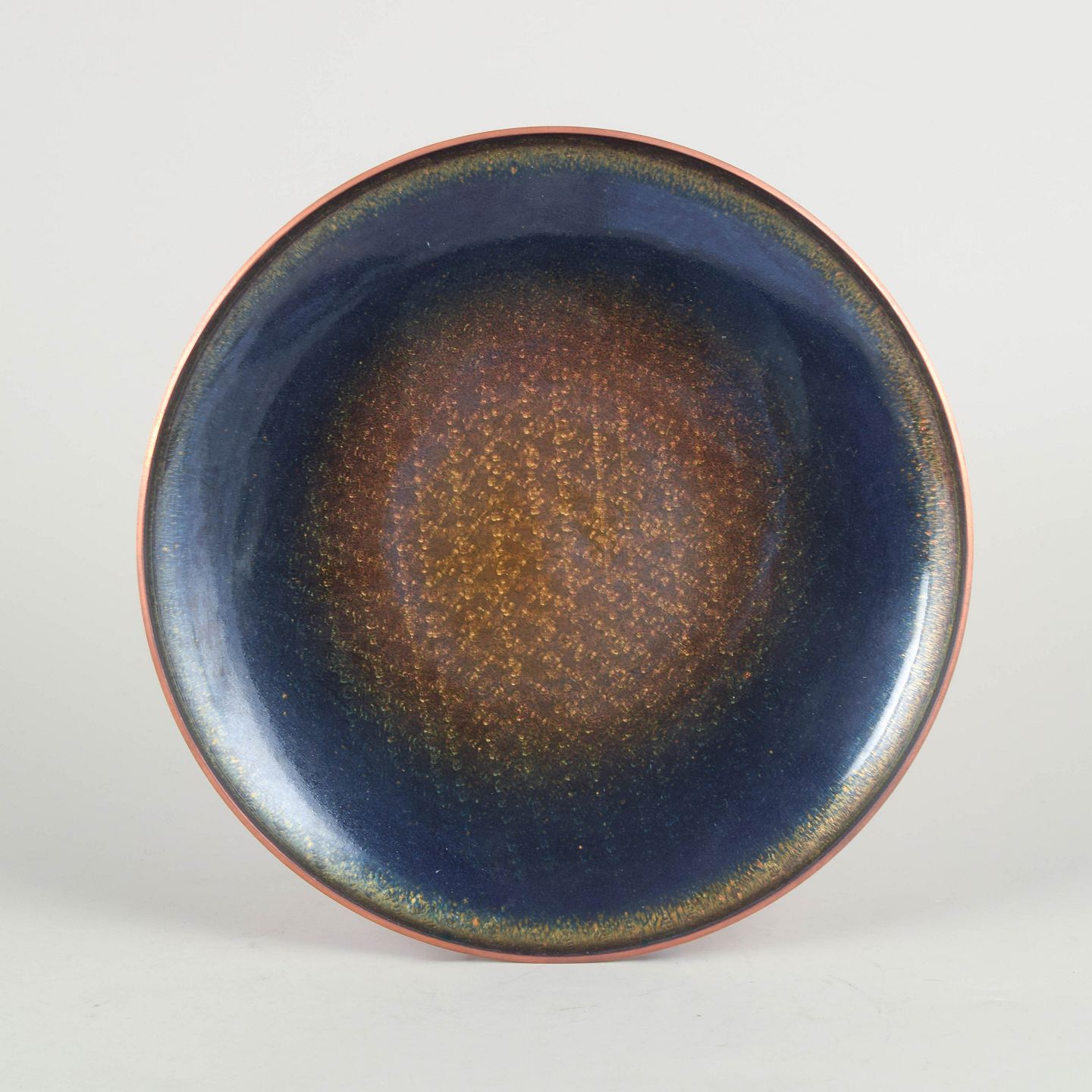 Håndlavet fad i emalje på kobber med dyb blå glasur og gyldent spil i midten, karakteristisk for skandinavisk emaljekunst fra perioden. Stemplet i bunden.