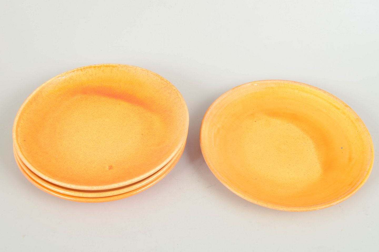 Fire keramiske tallerkener med uranholdig glasur i varme gyldne toner, fremstillet hos Kähler i 1930’erne.