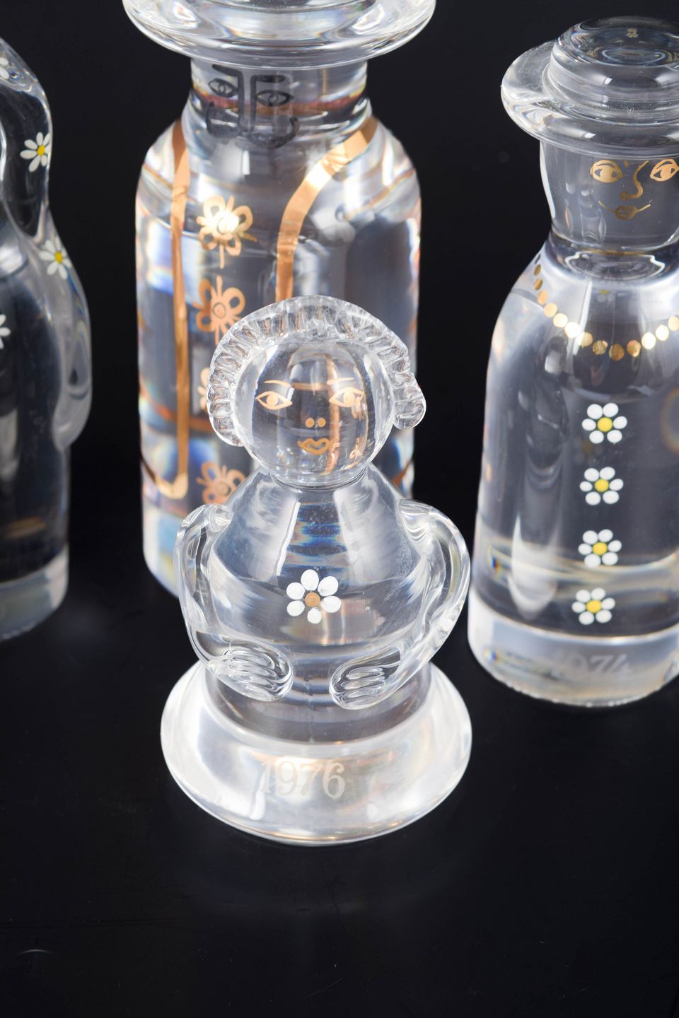 Kosta Boda, sæt af fem “Family” glasfigurer.Håndlavede kunstglasfigurer i klart glas med enkle, stiliserede former og dekorative hvide og gyldne blomstermotiver, der repræsenterer en familiegruppe.