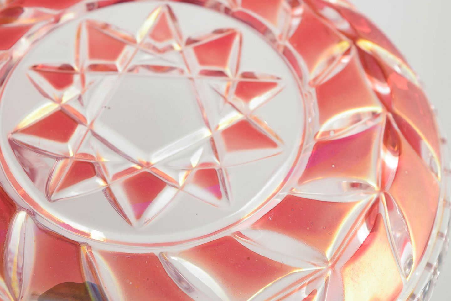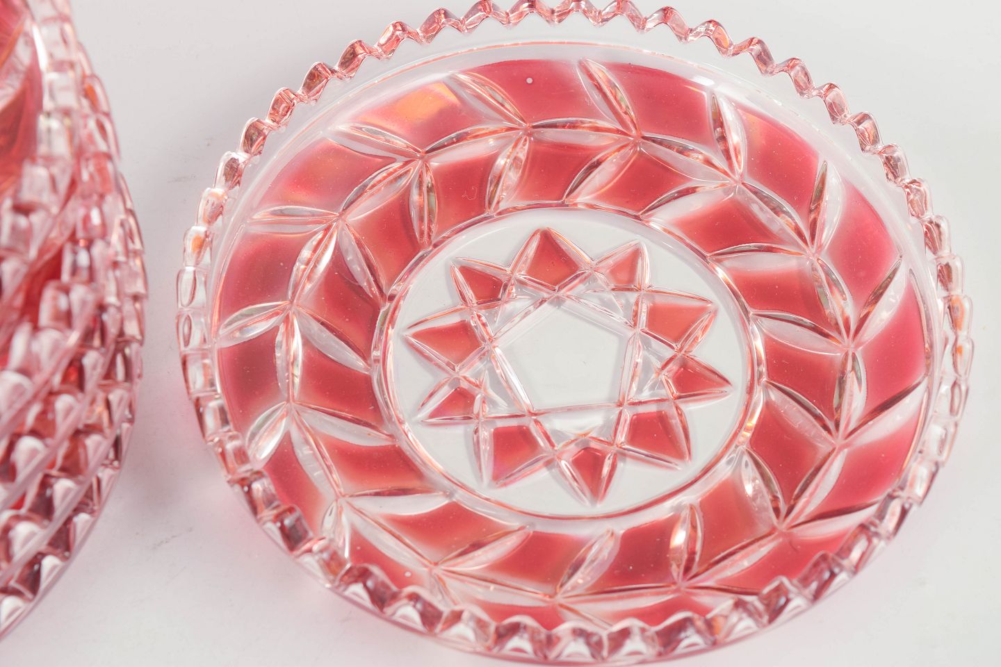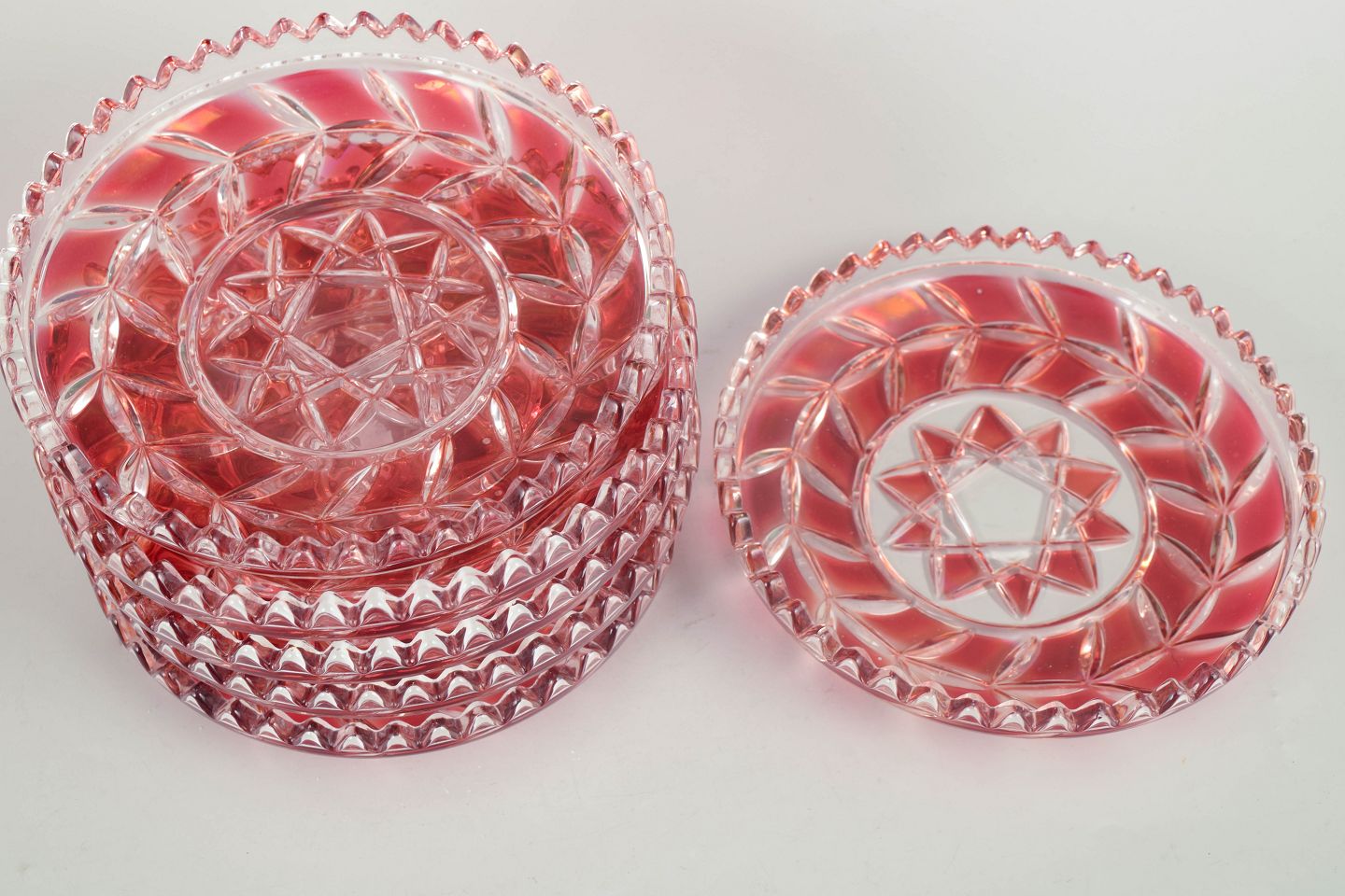 Bøhmisk krystalglas, sæt af seks tallerkener.Pressede og slebne glasfade i klart og rosa tonet krystal med geometrisk stjernedekor og facetslebne kanter.
