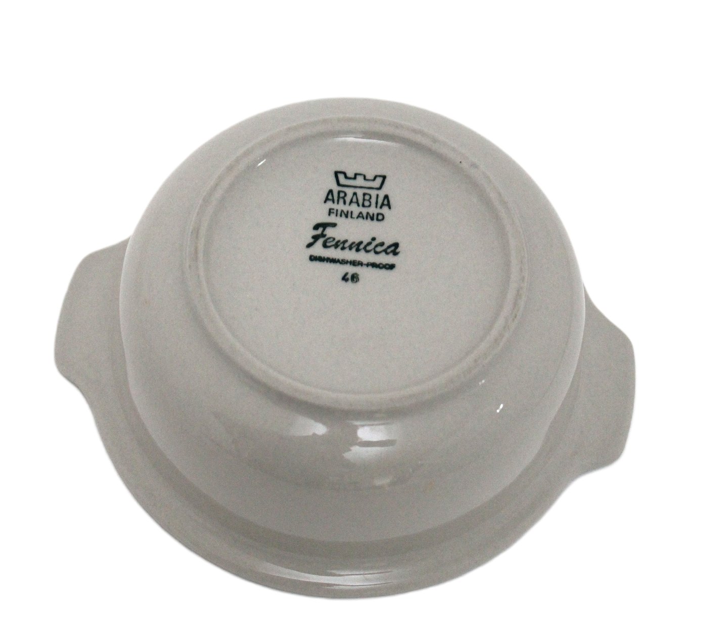 Arabia, Fennica. Skål med ører, boullionkop eller morgemadsskål. Højde 5,5 cm. Diameter 14,5 cm. Længde 16 cm. Fin stand. Pris: 125 kr. stk. Lager: 3 Udstiller