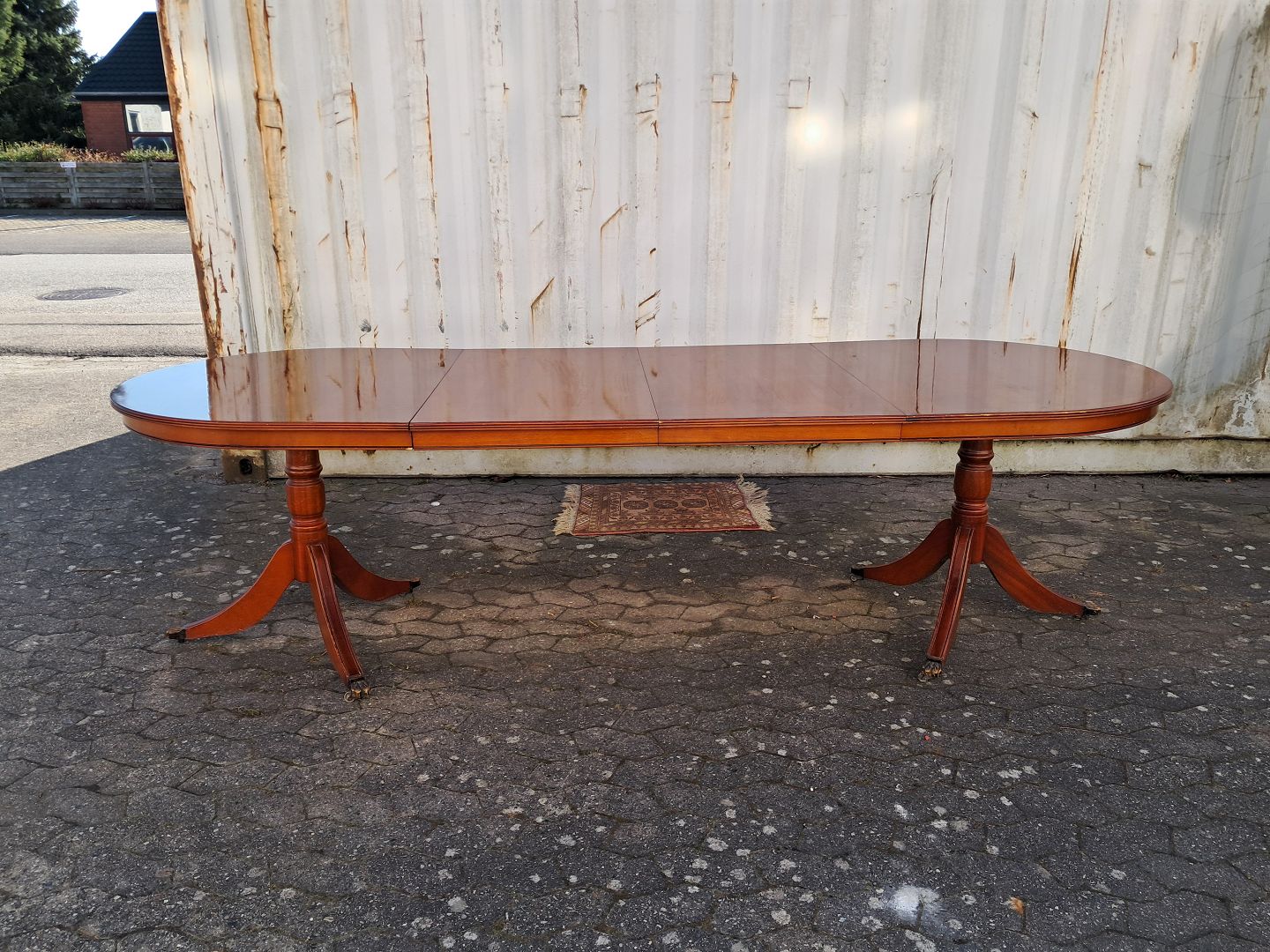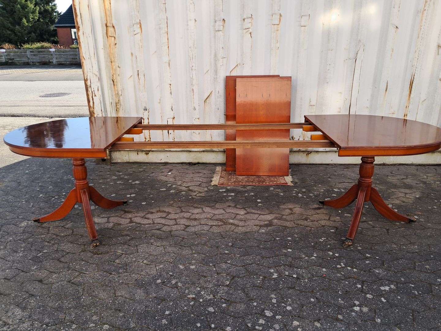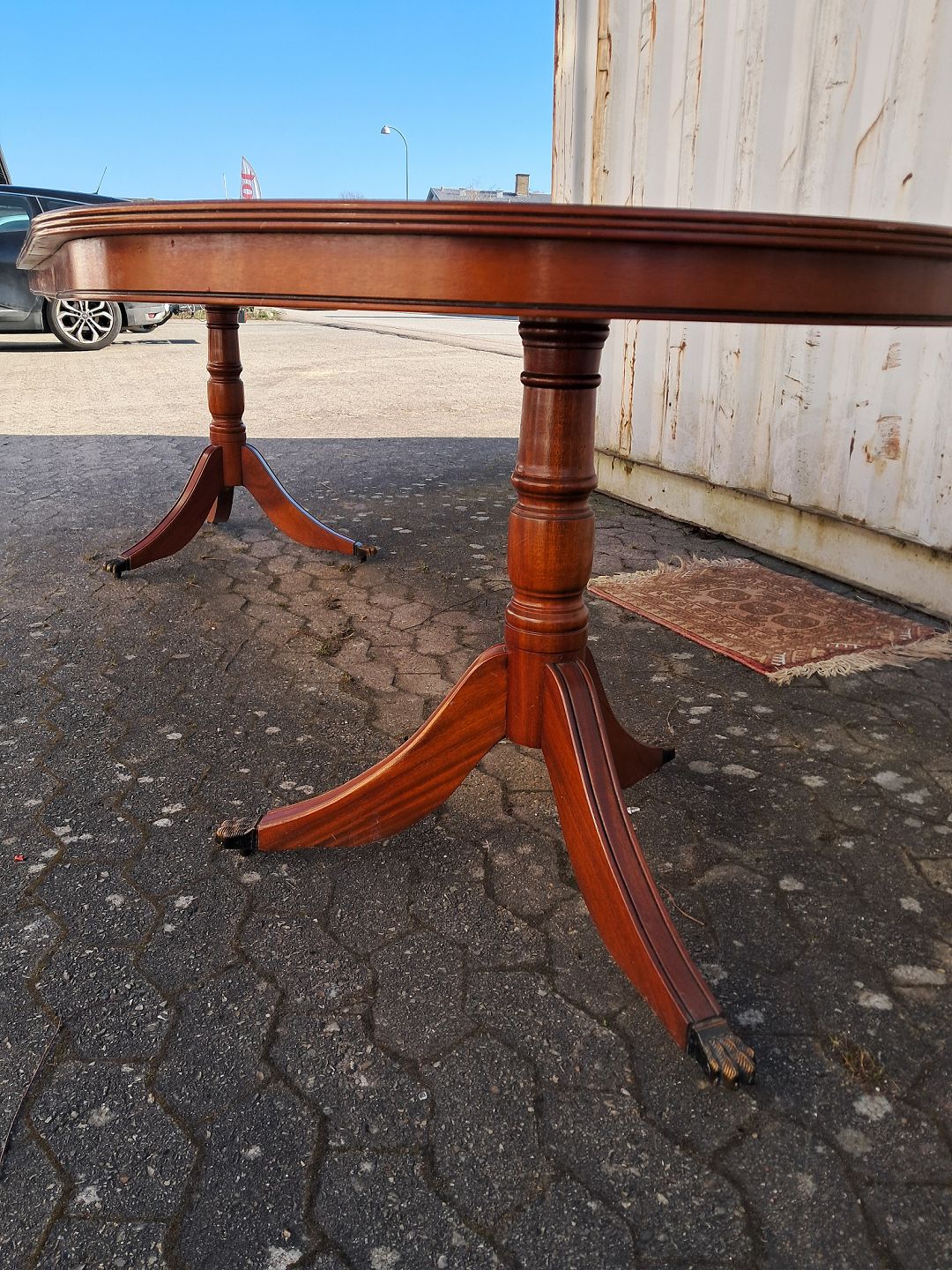 Two pillar table i fineret mahogni, fra 1990erne.Det har brugsspor og der medfølger 2 tillægsplader.