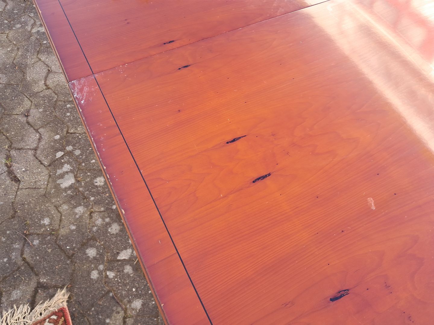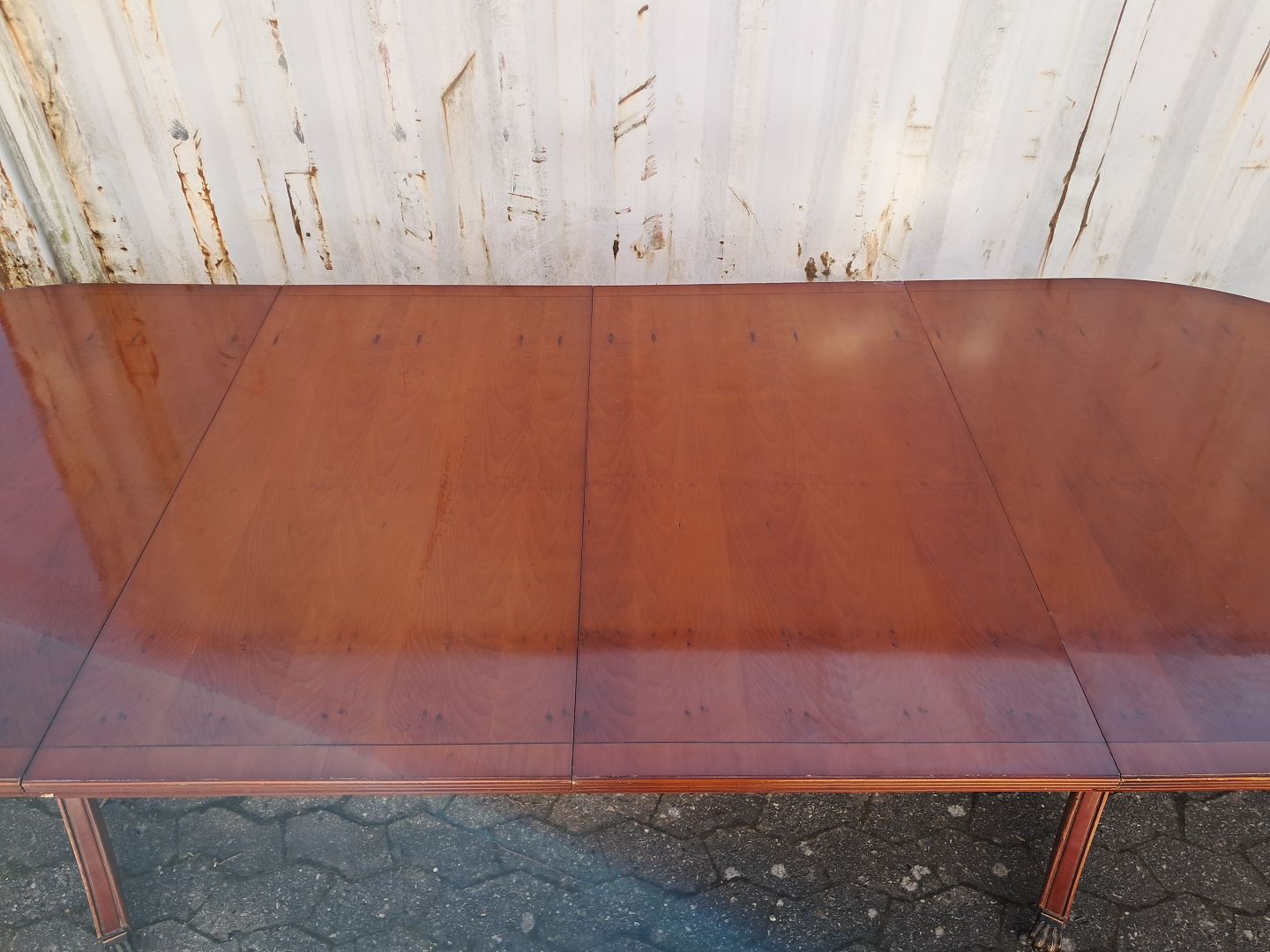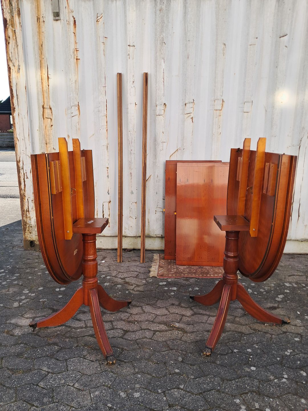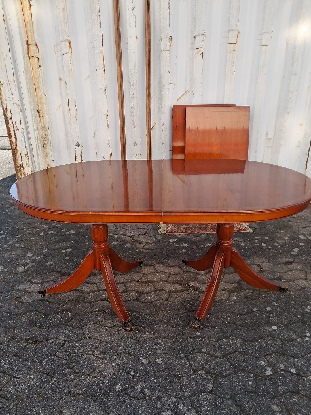 Two pillar table i fineret mahogni, fra 1990erne.Det har brugsspor og der medfølger 2 tillægsplader.