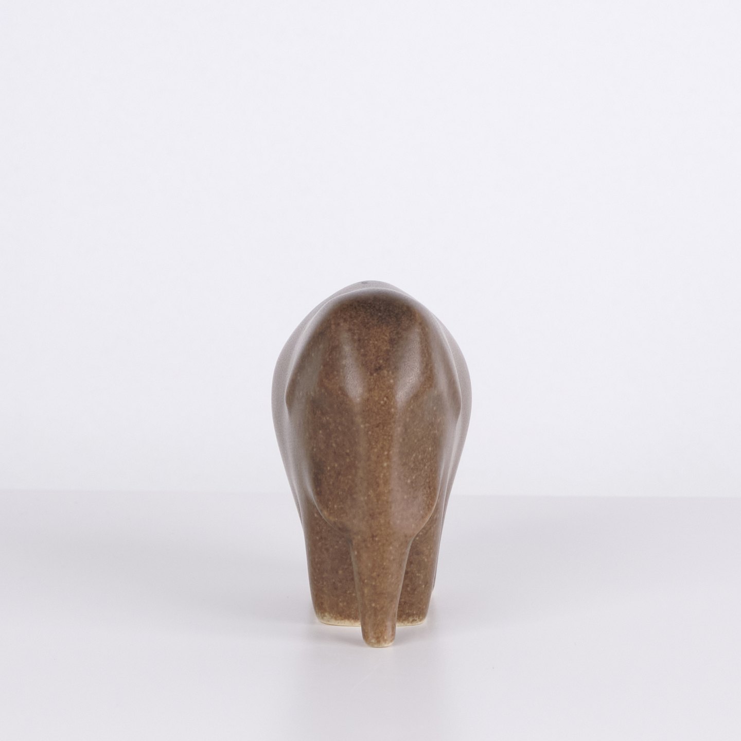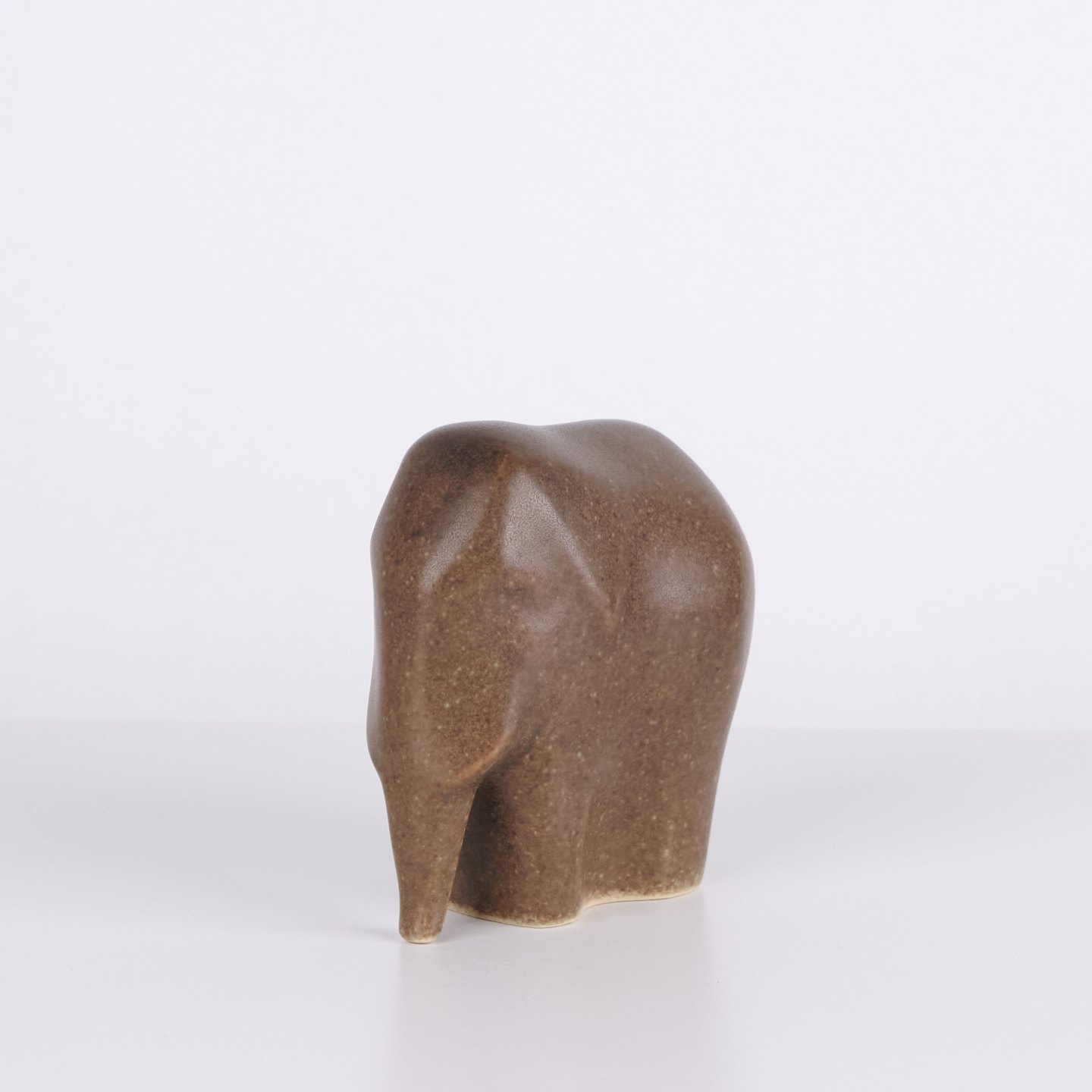 Elefantfigur af Knud Basse udført i brun glaseret keramik. Figuren er modelleret i enkel kompakt form med nedadbøjet snabel og afrundede sider. Minimalistisk model fra Knud Basses serie af dyrefigurer, produceret i Danmark i 1960’erne.