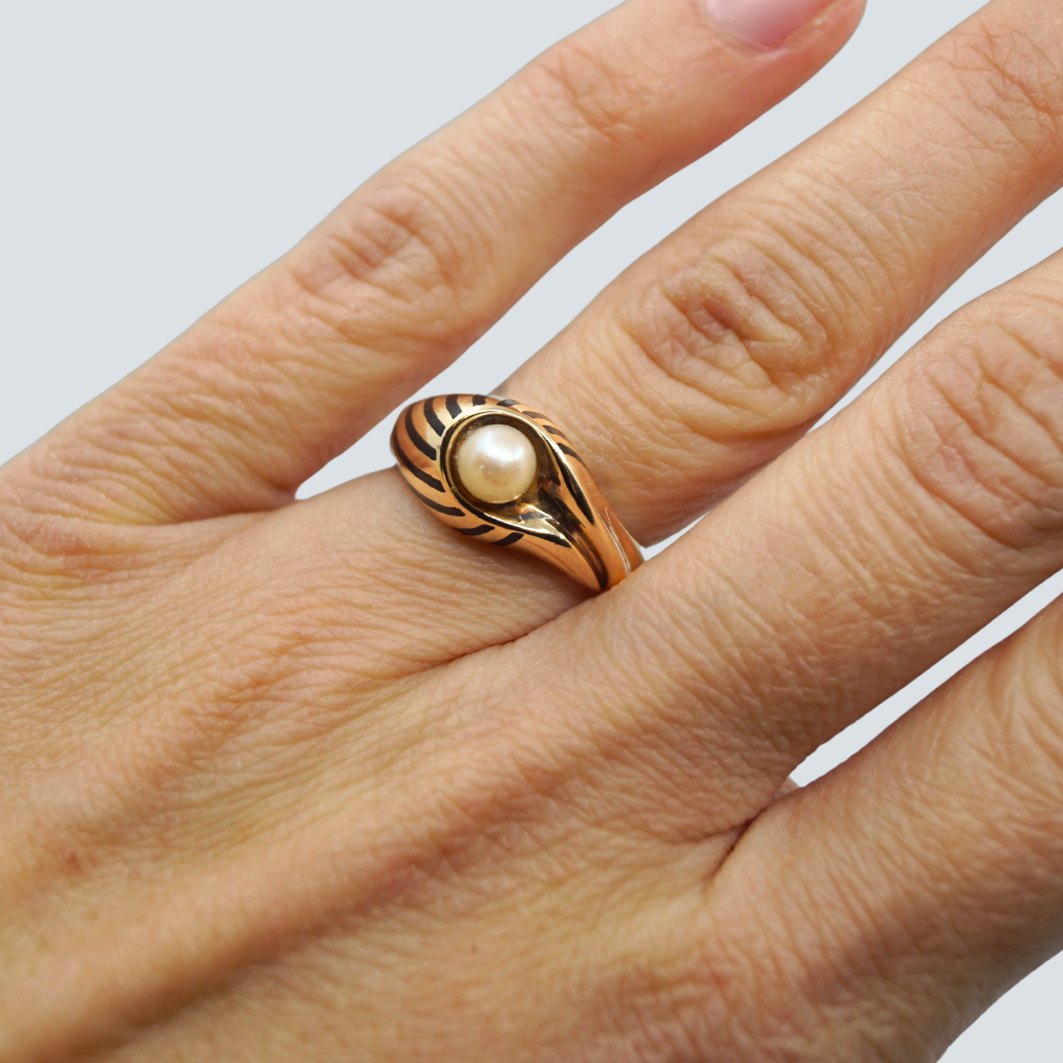 Bernhard Hertz; Ring i 14 kt. guld med emalje og perle.Ring str. 54.