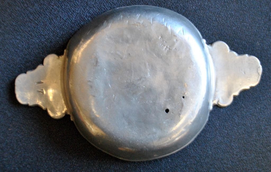 Barok øre skål i tin. 18. årh. Danmark. Madskål. Med glatte, buede sider. Støvte ører med barokmønstre. På undersiden af det ene øre, stemplet: 17. Dia: 16 cm. Længde med ører: 24,5 cm. H.: 4 cm. Ingen mesterstempler.Antagelig øreskål fra dansk militærhospital.