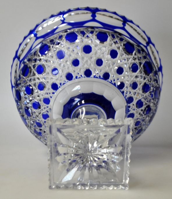Stor krystalopsats, 20. årh. Med blåt overfang. På firkantet fod. H.: 21 cm. Dia.: 24 cm.Emne nummer: 29048
