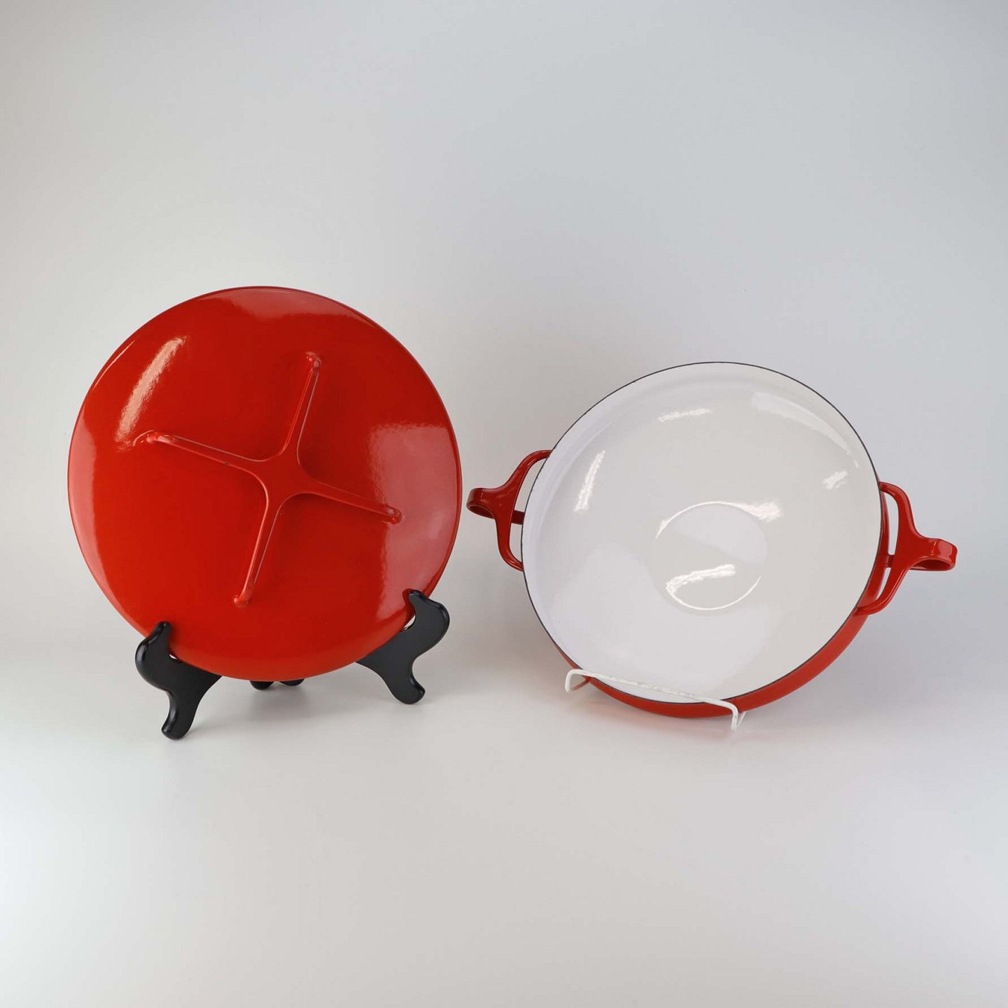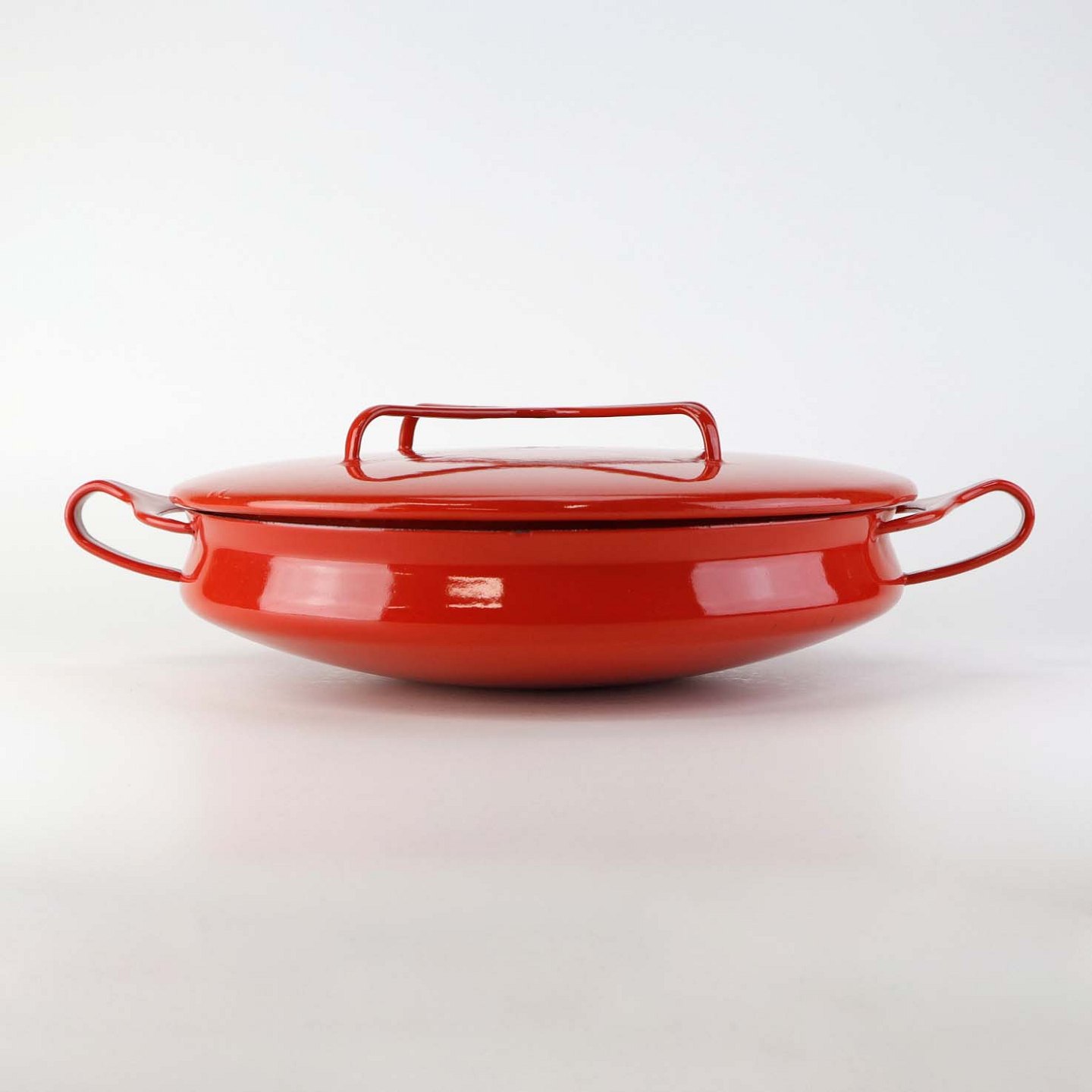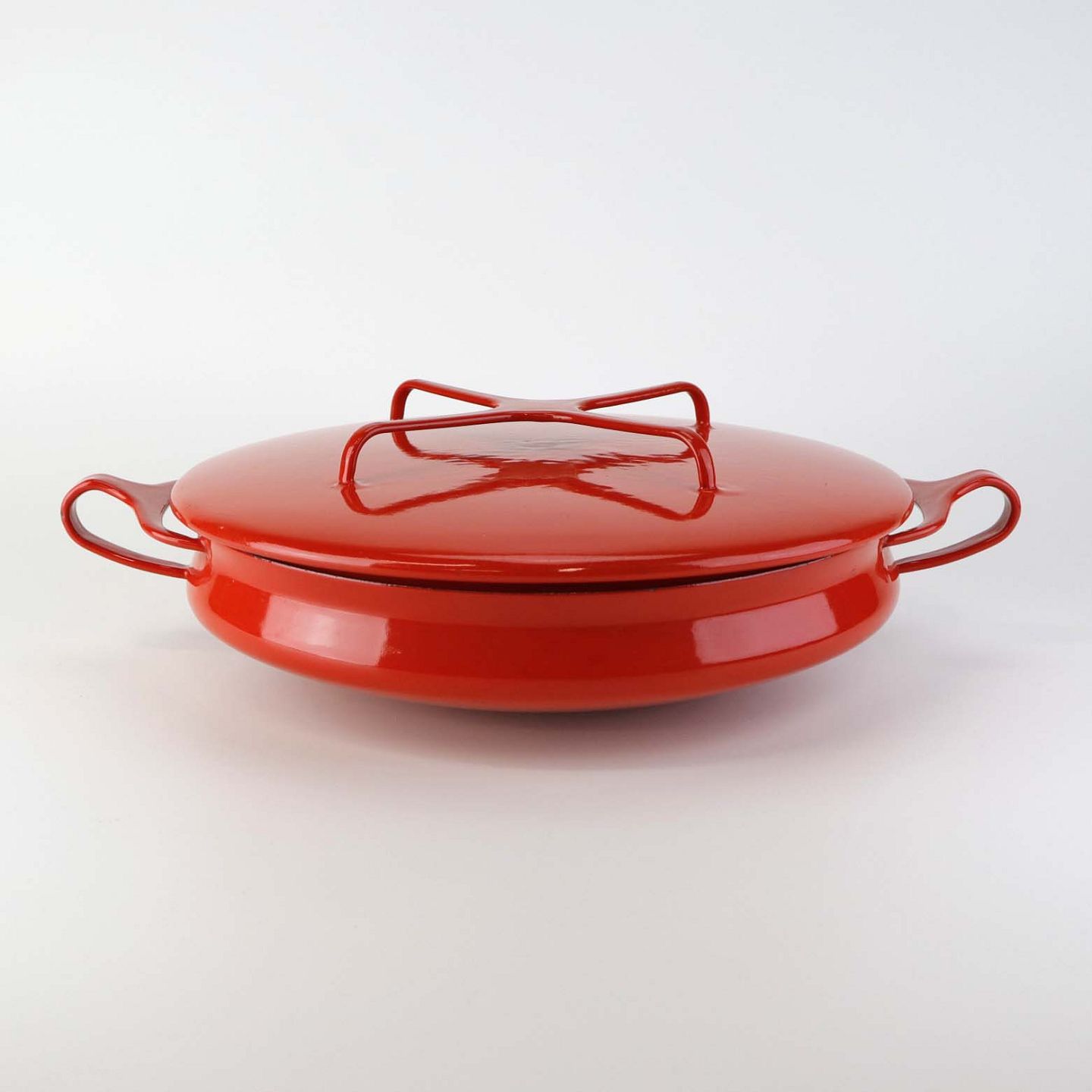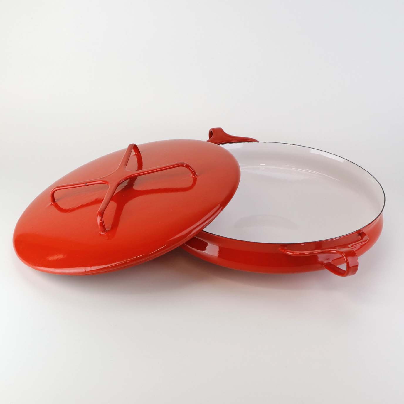 Kasserolle med låg fra serien Kobenstyle fremstillet i metal og belagt i rød og hvid emalje. Model FranceFormgiver Jens Harald Quistgaard
