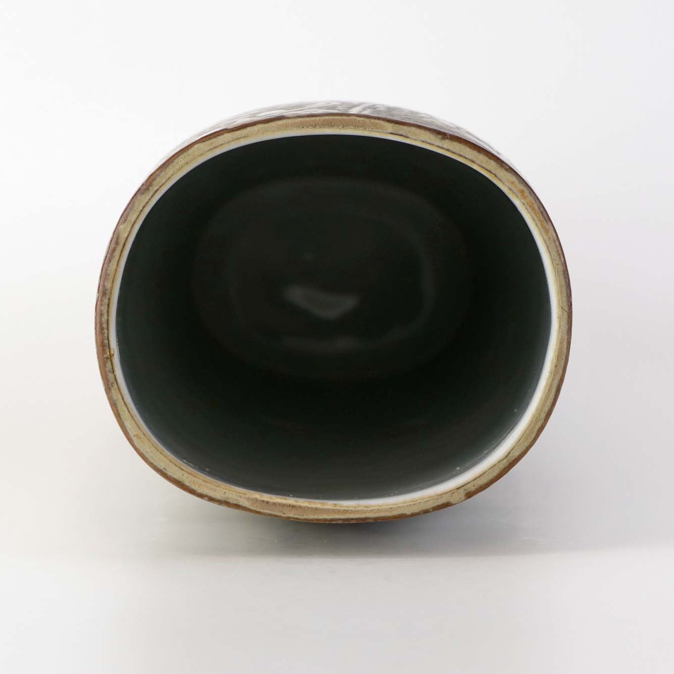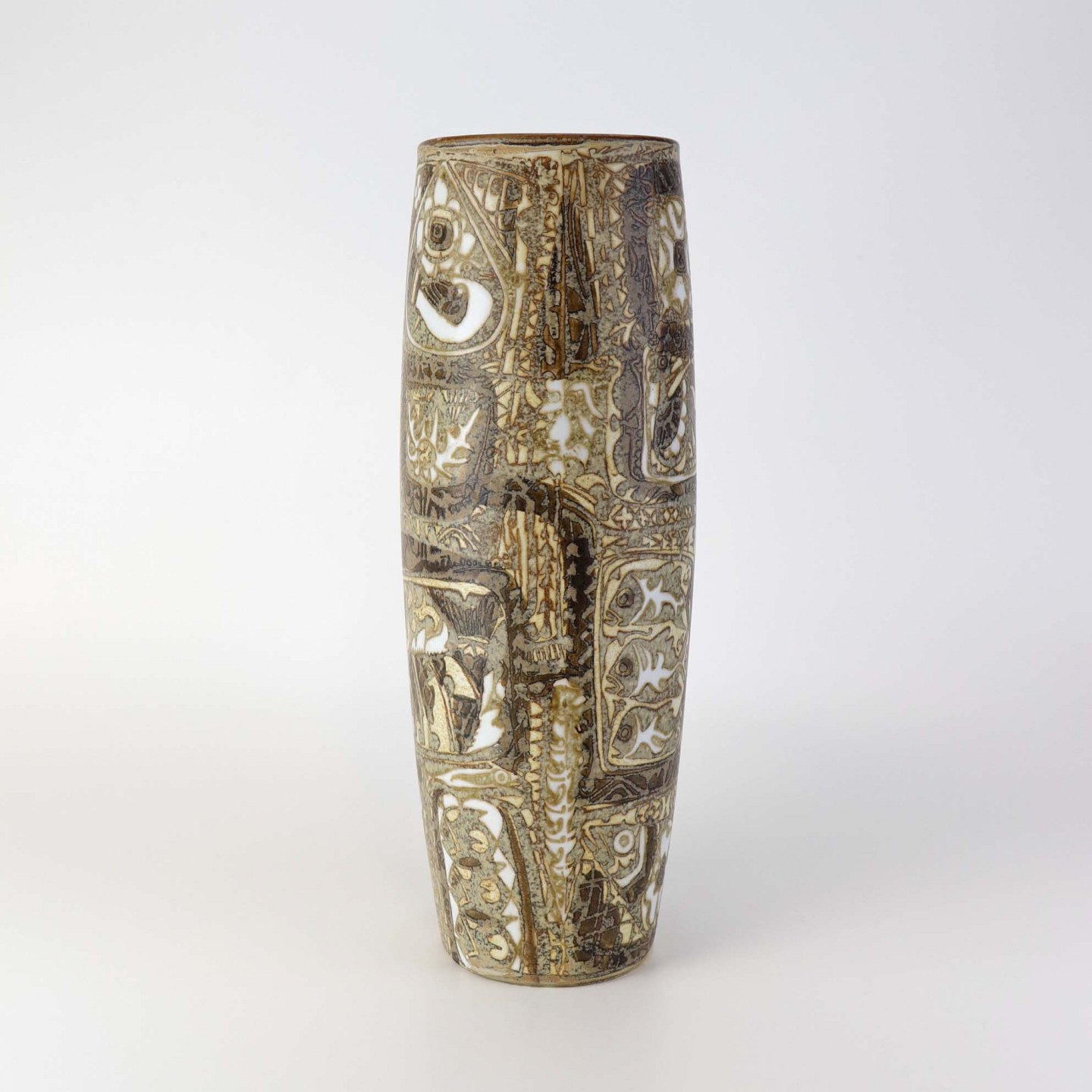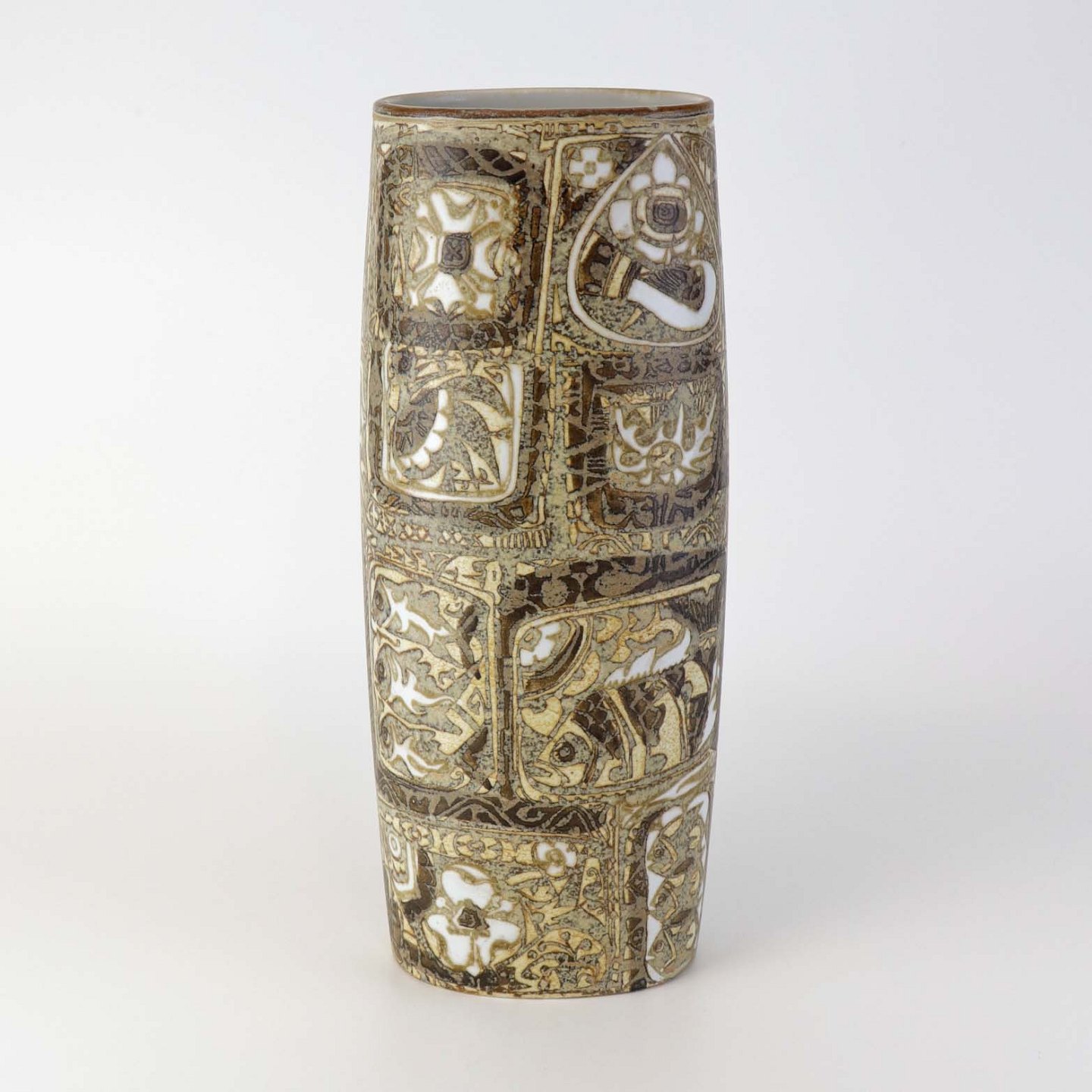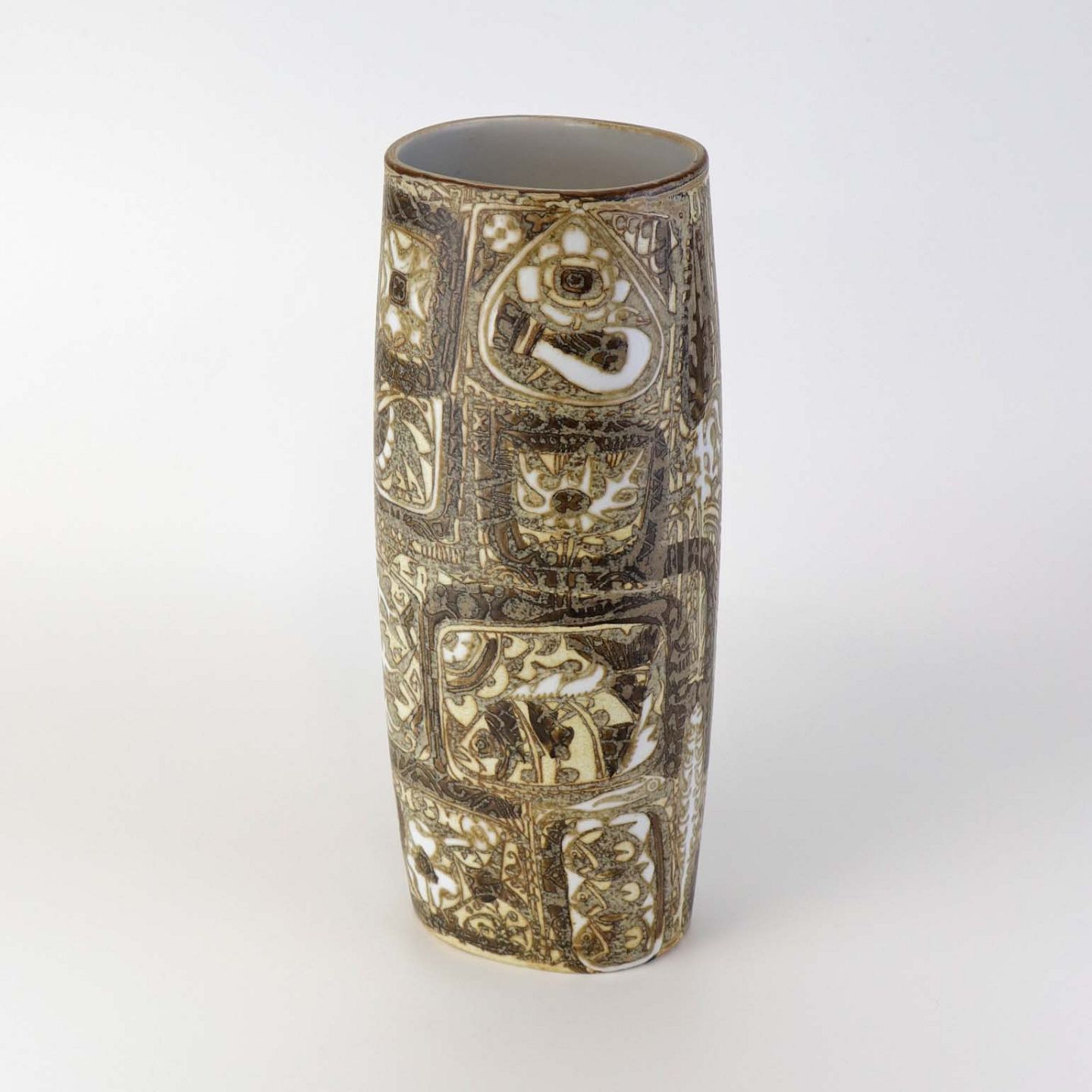Høj oval vase i fajance fra serien Baca med mønster i brune nuancer. Nr. 719/3116Formgiver Nils Thorsson
