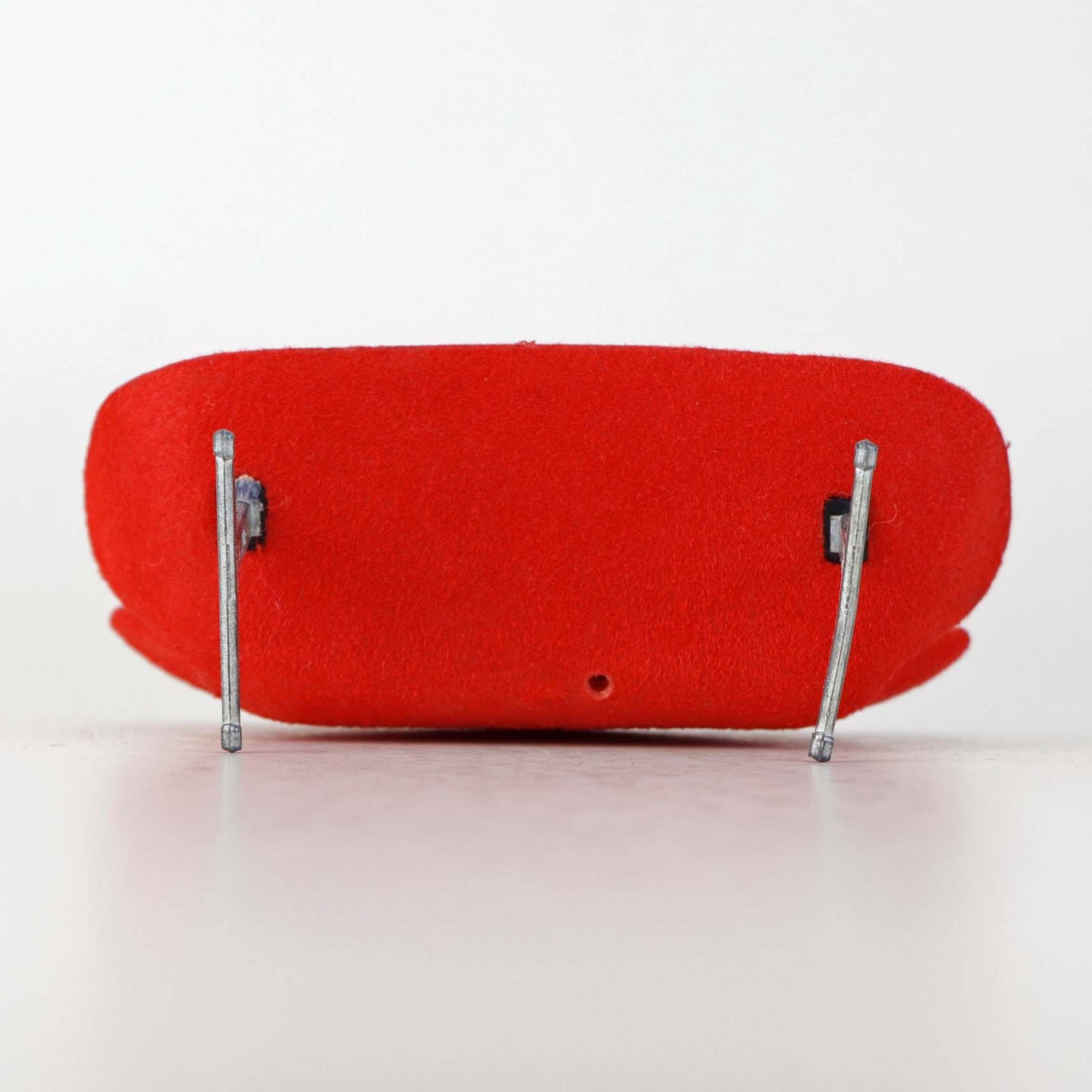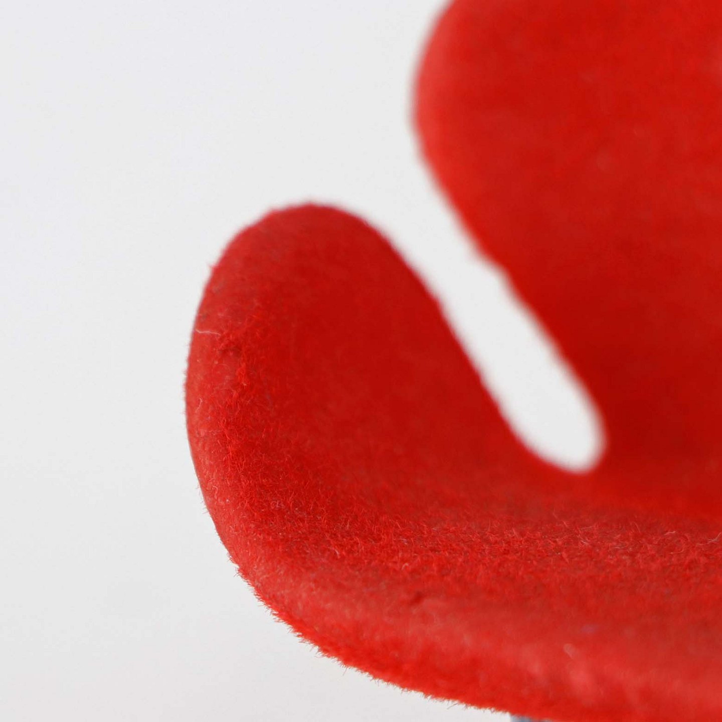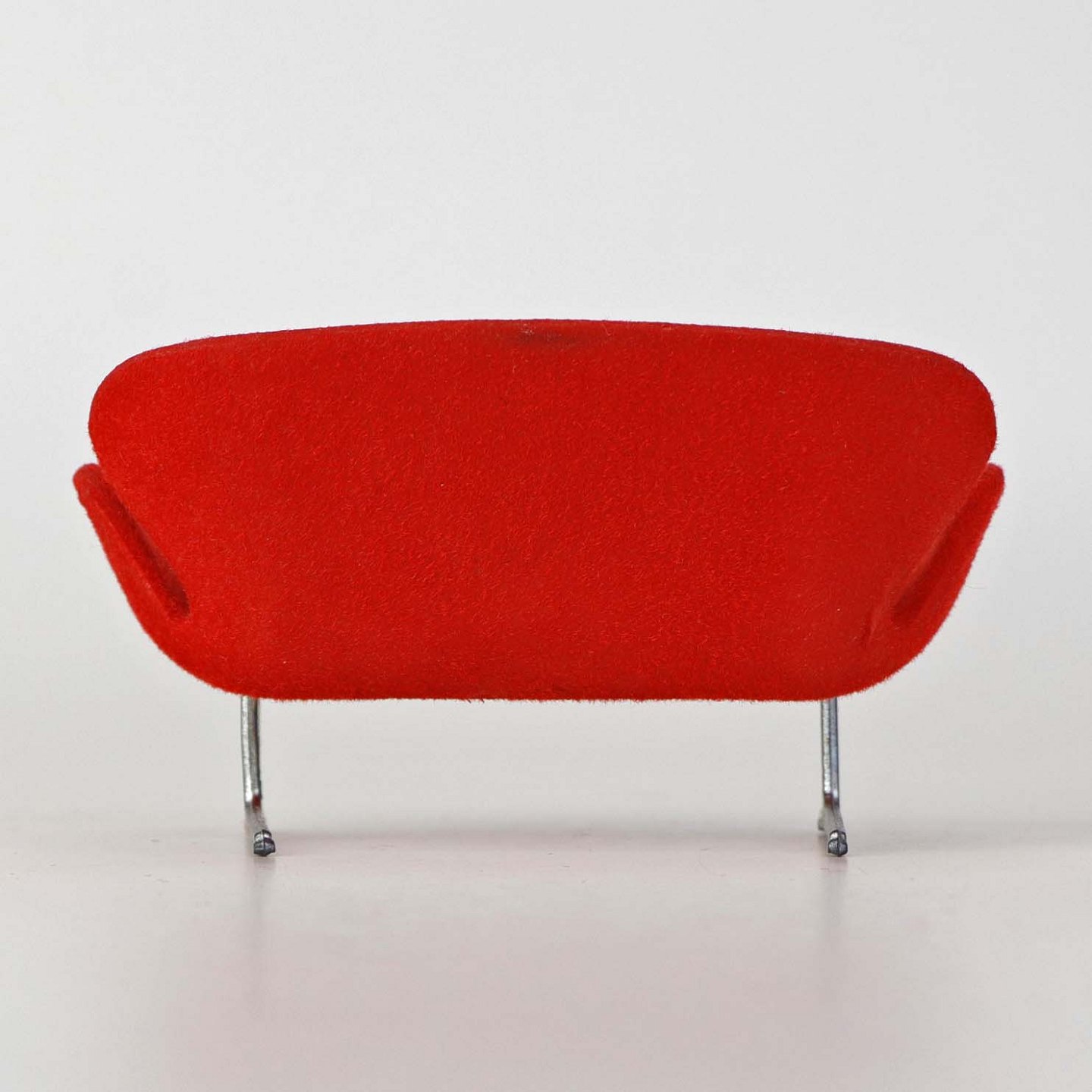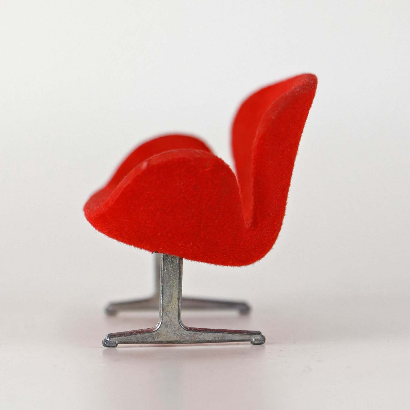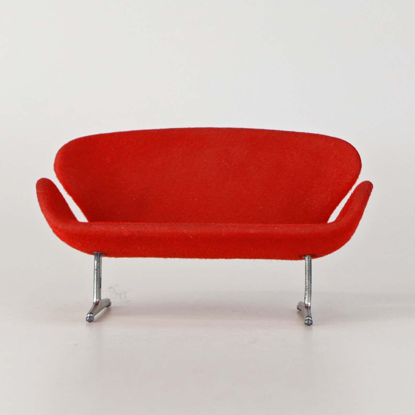 Miniature designermøbel til dukkehus med model af Arne Jacobsen's Svanesofa i rød farve med stel i metal.Design Arne Jacobsen