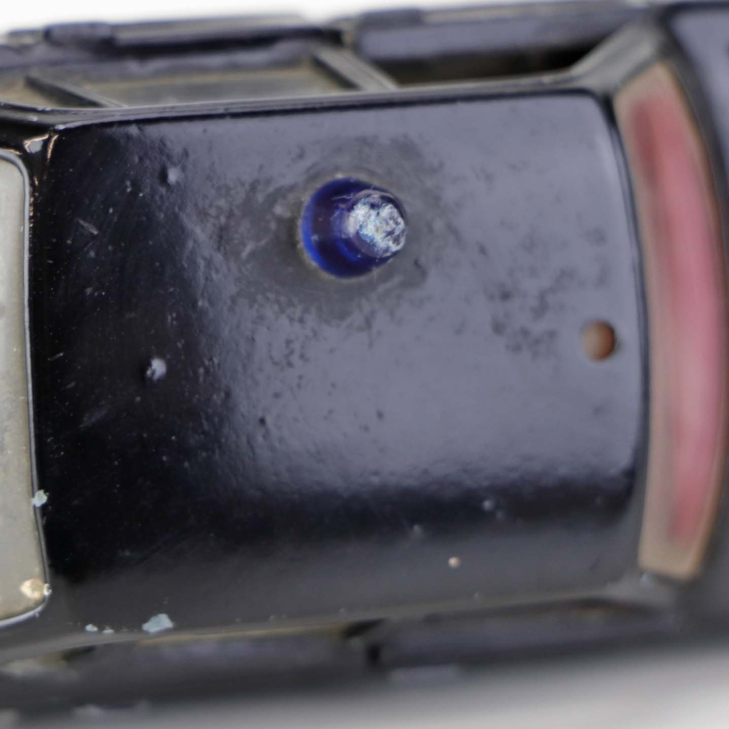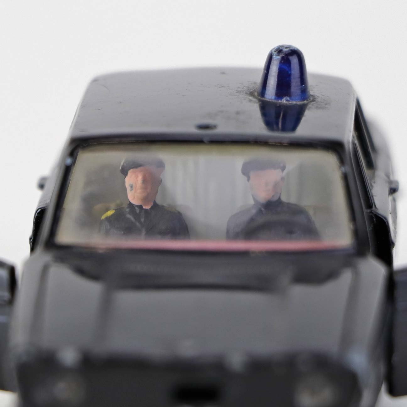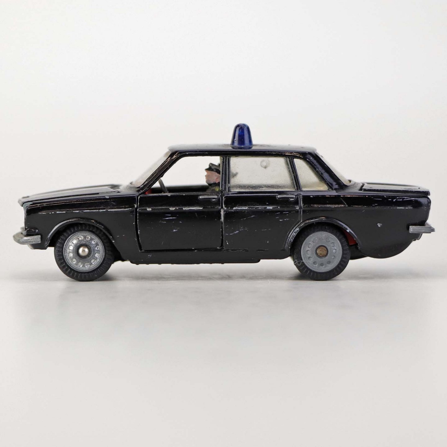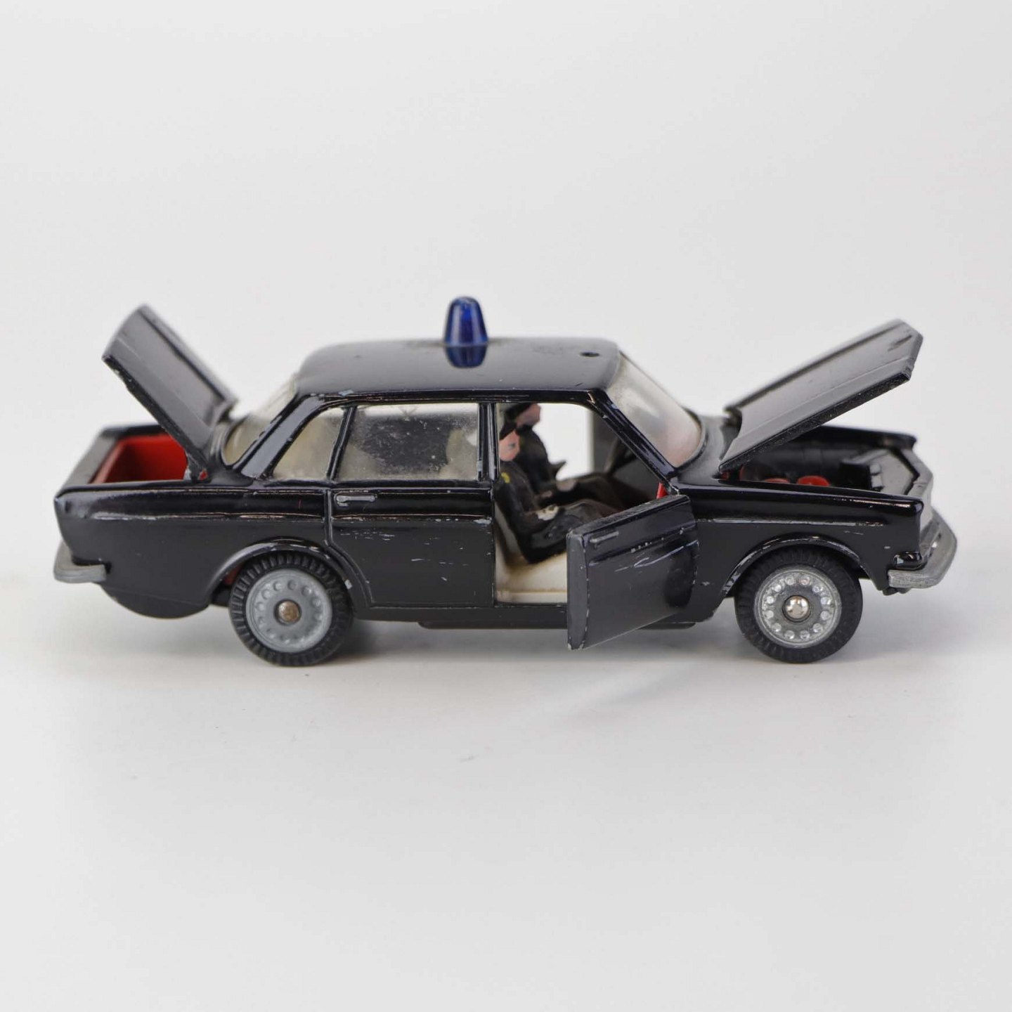 Politibil med to figurer. Legetøjsbil i sortlakeret metal med gummi hjul og blå blinklys. Model Volvo 144Producent Tekno, Denmark