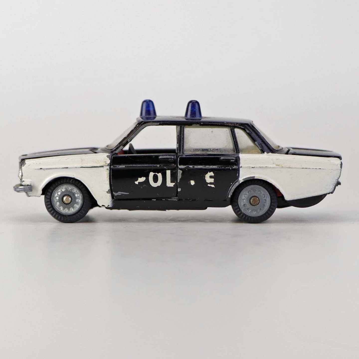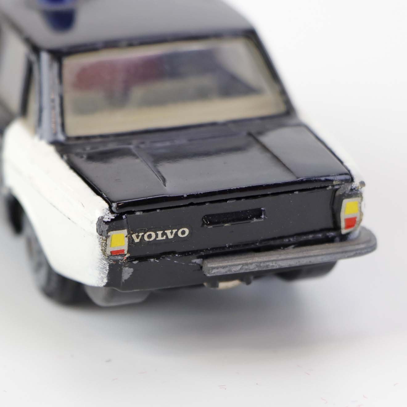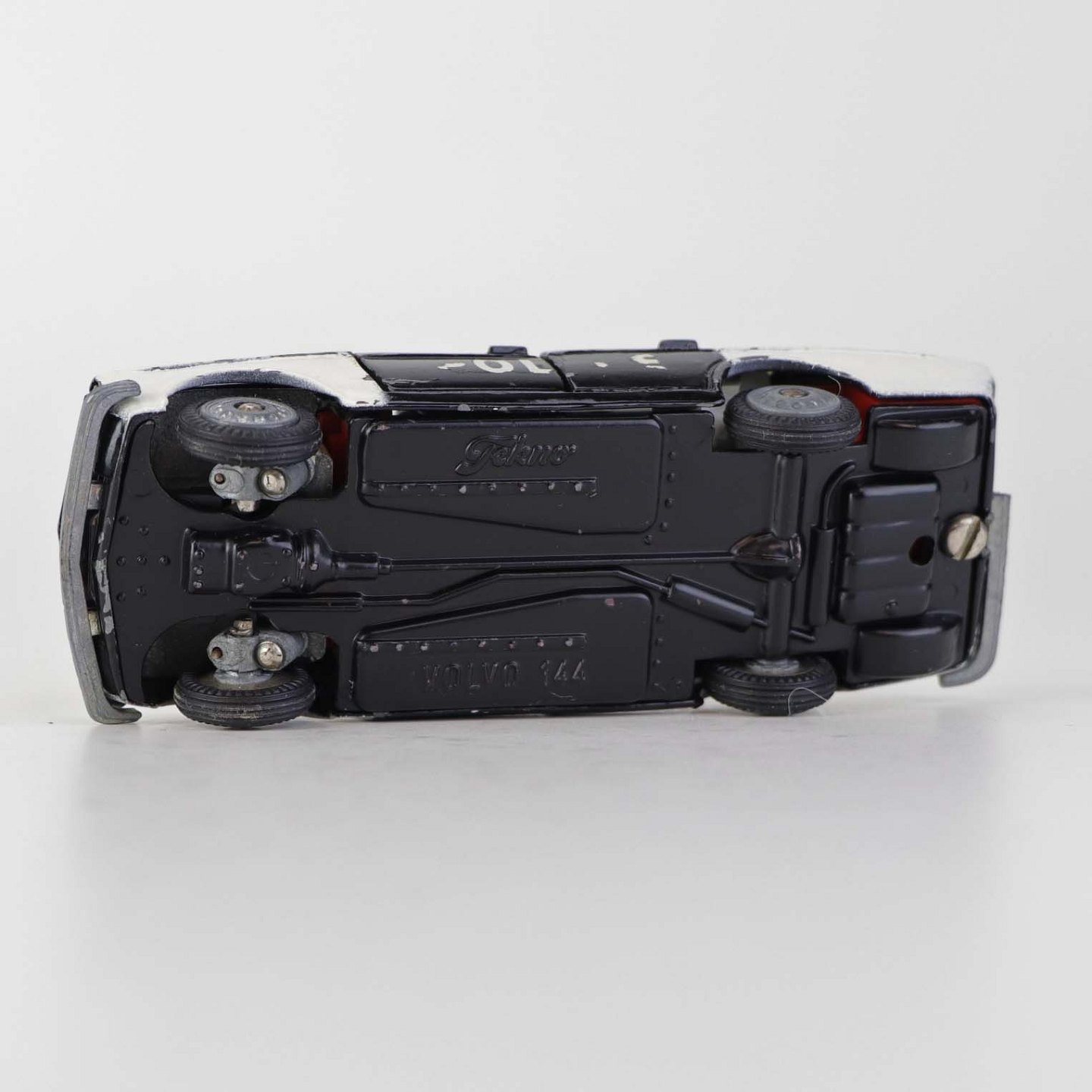 Politibil med to blinklys. Legetøjsbil i sortlakeret metal med gummi hjul og blå blinklys. Model Volvo 144Producent Tekno, Denmark