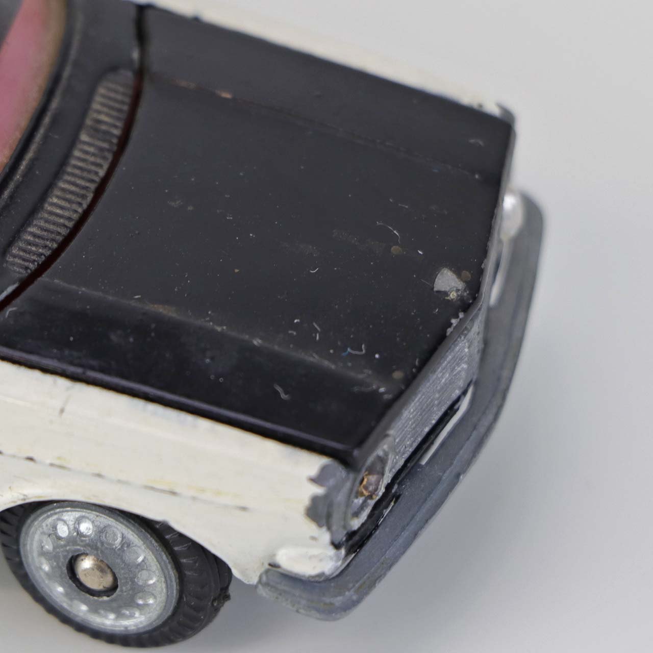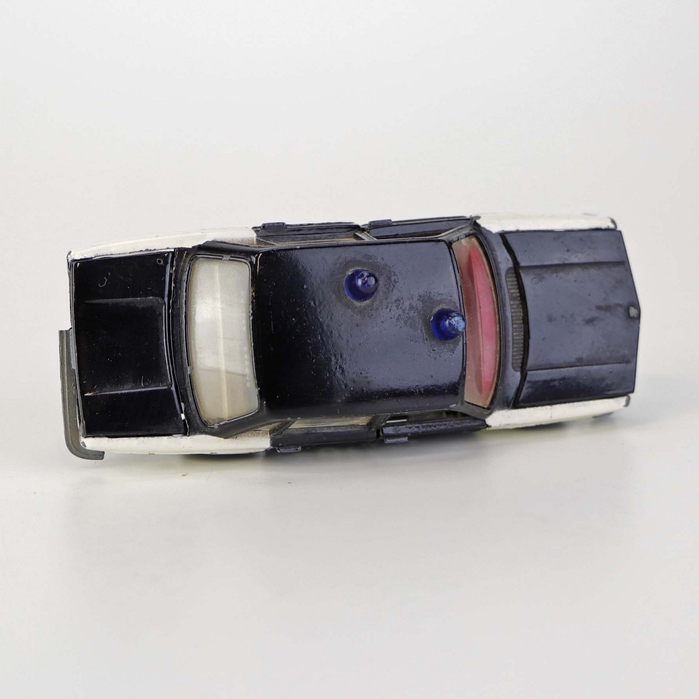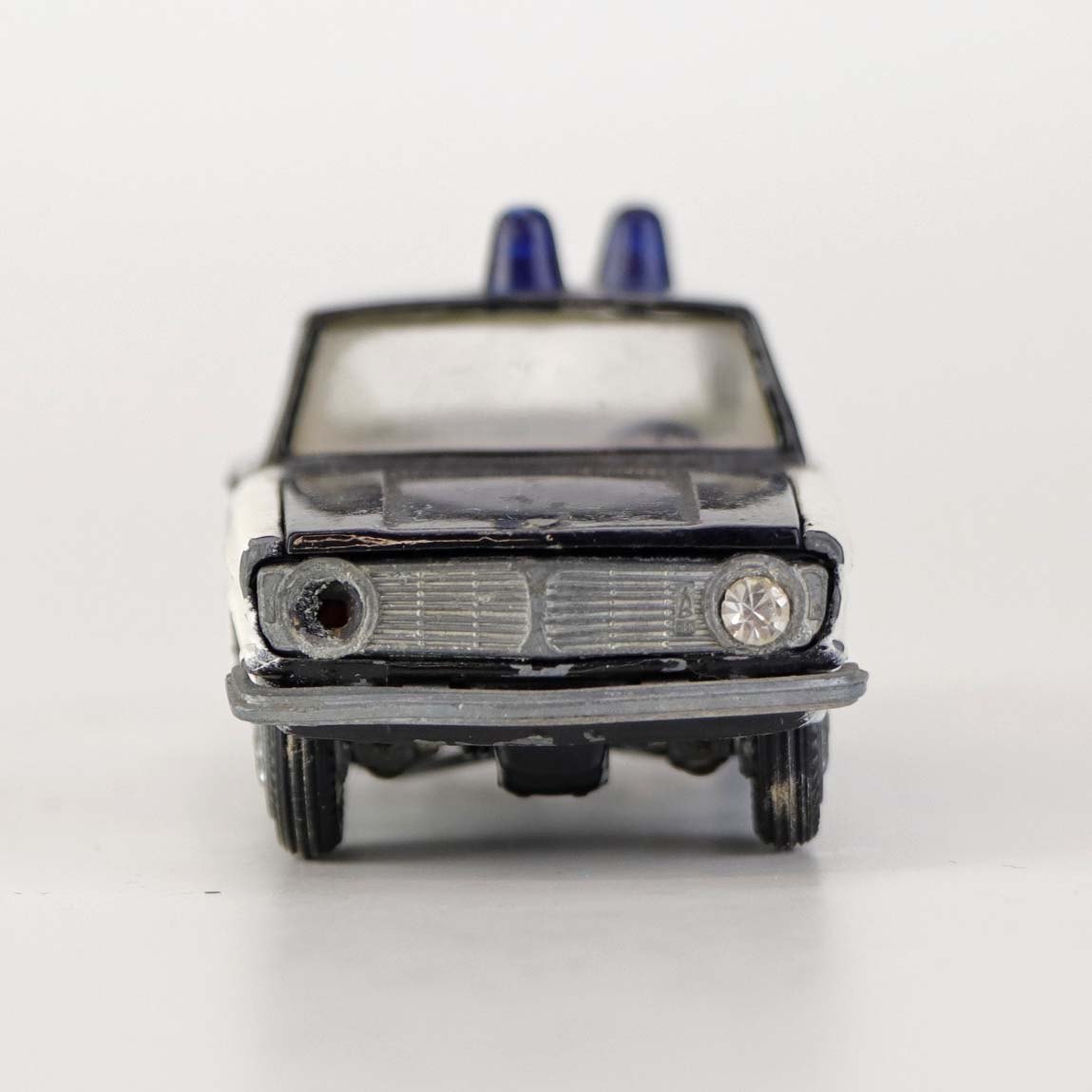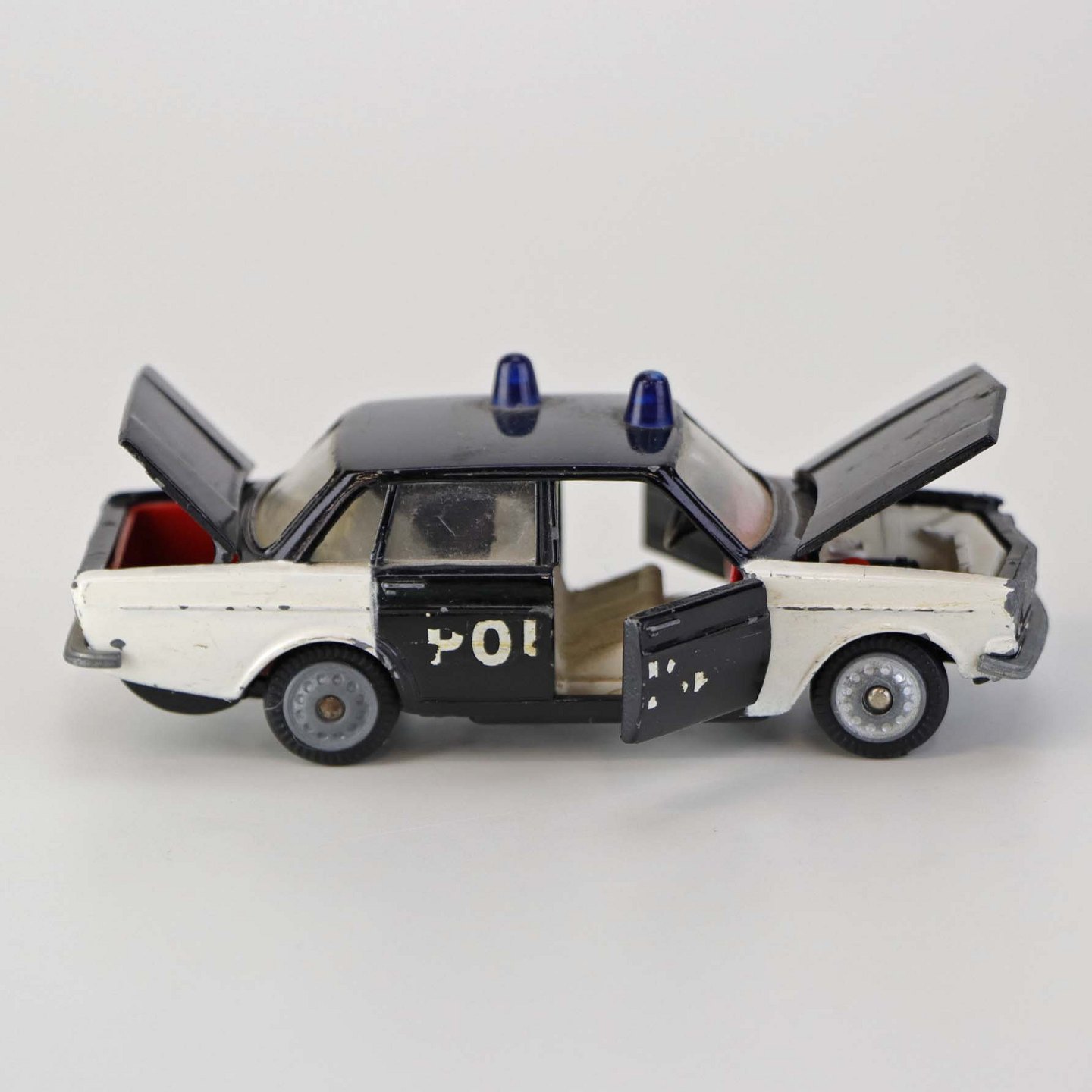 Politibil med to blinklys. Legetøjsbil i sortlakeret metal med gummi hjul og blå blinklys. Model Volvo 144Producent Tekno, Denmark