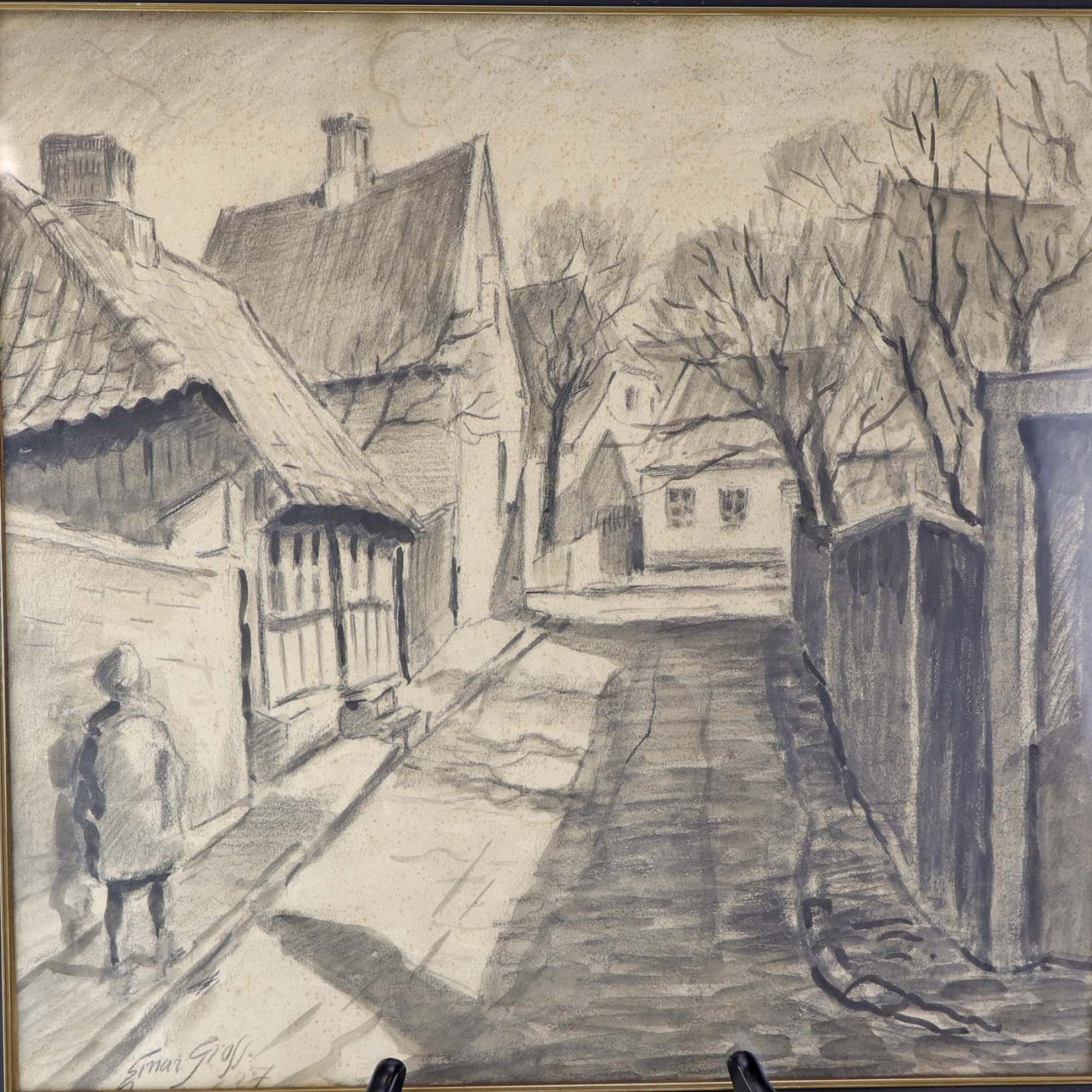 Indrammet akvarel og kultegning på papir i sortmalet træramme med bymotiv af Nellikestræde i Nørresundby fra år 1927Kunstner Ejnar Gross (1895-1962)