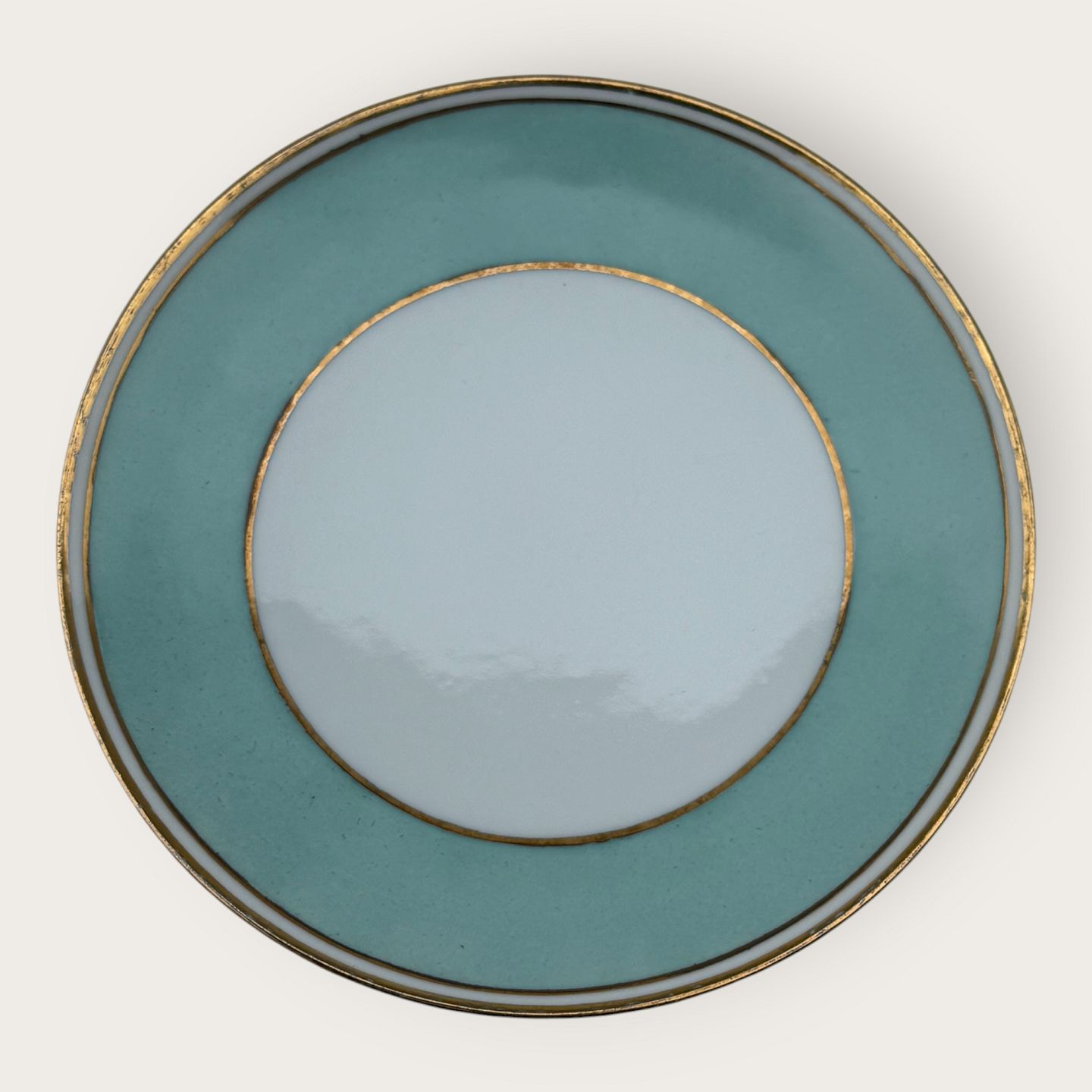 Bing & Grøndahl, Form 643 med bred turkis dekoration og guldkant, kagetallerken, diameter 15cm, 1. sortering, *pæn stand*Lager: 6