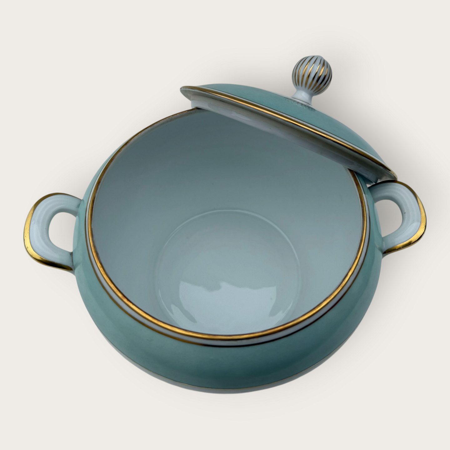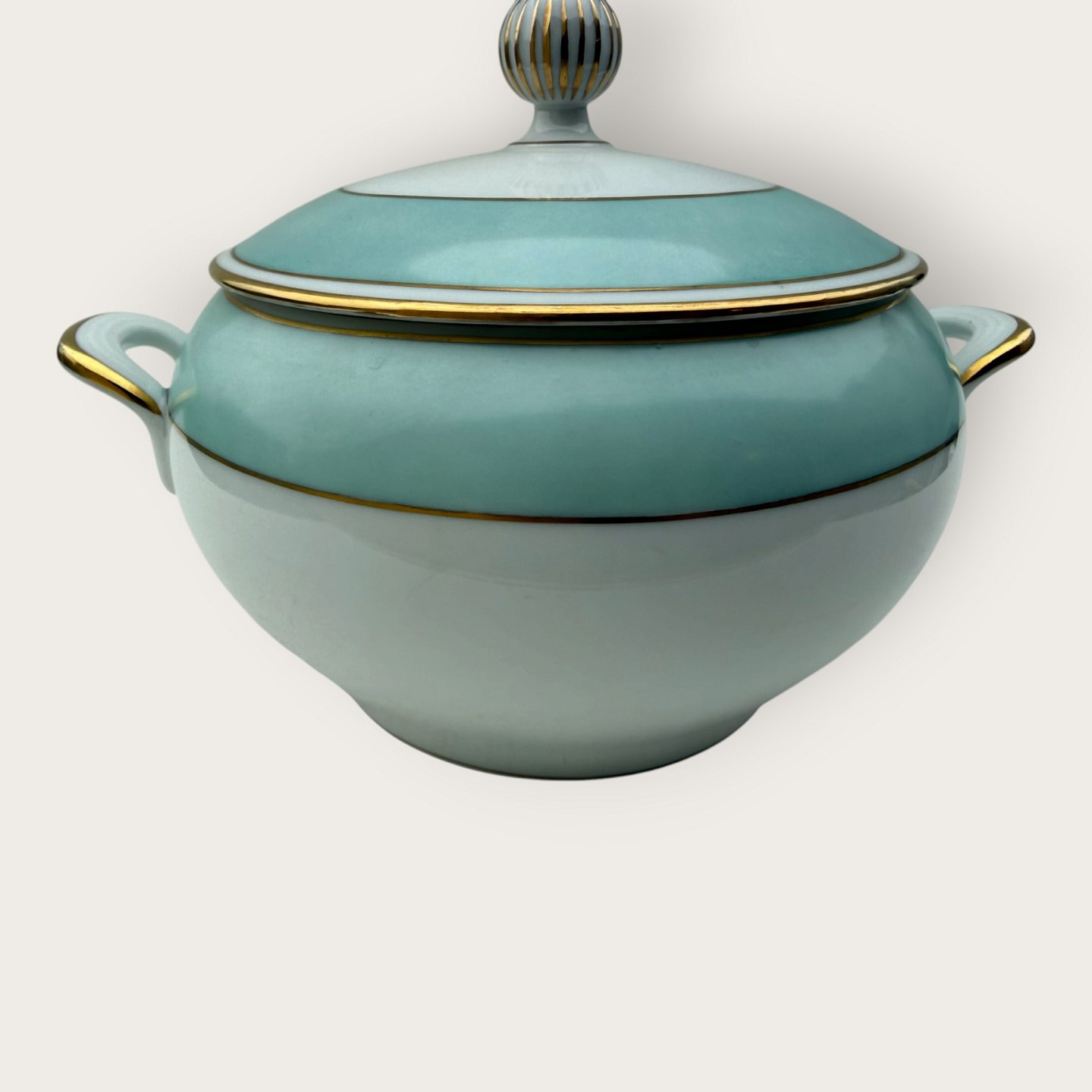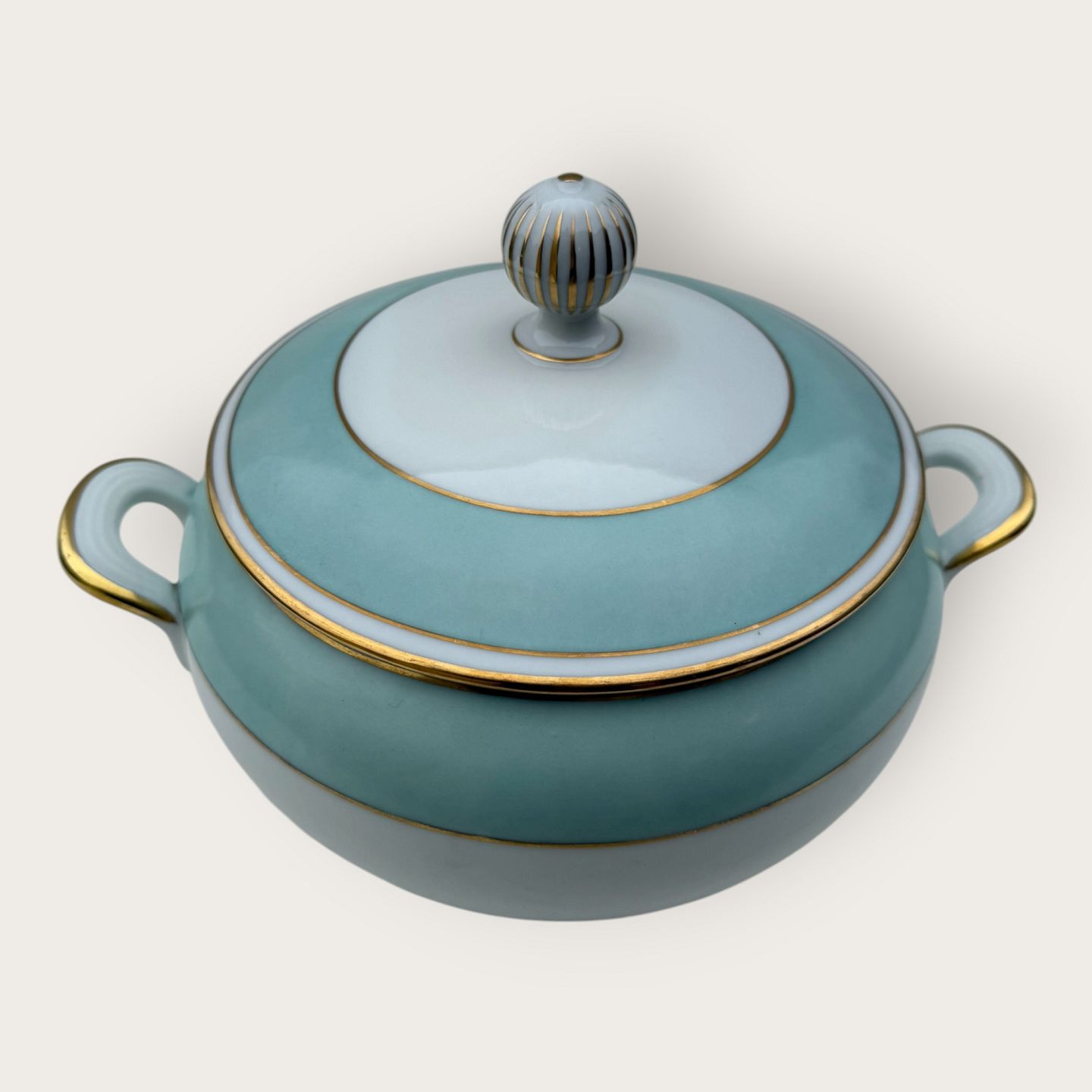 Bing & Grøndahl, Form 643 med bred turkis dekoration og guldkant, Terrin, #5, højde 17cm, bredde 26cm, 2. sortering, *pæn stand*Lager: 2