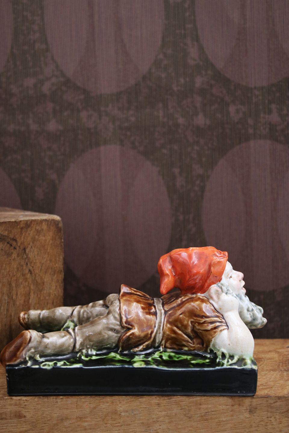 Antik , tysk keramik nisse i fin majolica glasur fra ca. 1880.H: 9cm. L: 17cm. B: 9cm.
