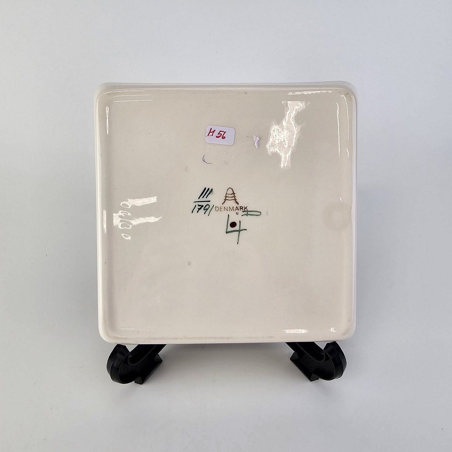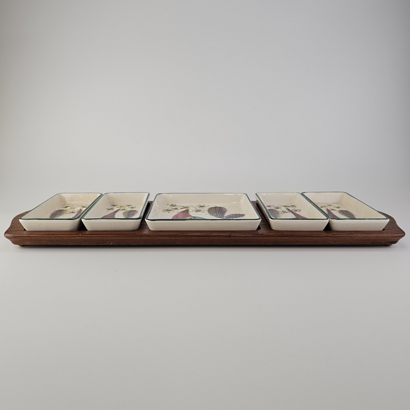Cabaret fad fra serien Tenera med bakke i teak træ og fem små, firkantede fade i fajance med dekoration af påfugleNr. 112/2193 & 113/2193