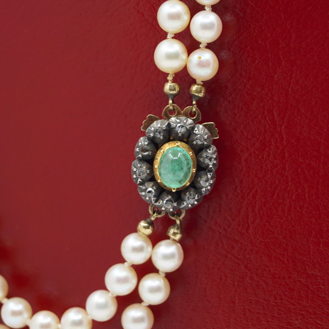 Dobbeltradet perlekæde trukket med knuder mellem perlerne. Smykkelås af 14 kt. hvidguld og guld, prydet med diamanter og smaragd.Længde på kæden 43 cm.