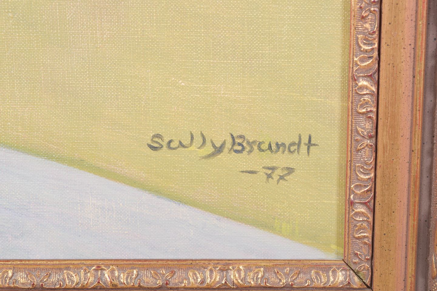 Sally Brandt, oliemaleri på lærred, skandinavisk billedkunstner.Modernistisk stilleben med frugt og glas opstillet i et roligt interiør, udført i en afdæmpet farvepalette med geometrisk opbygning. Kompositionen balancerer mellem figurativ gengivelse og stiliseret formsprog, signeret og dateret 1977.