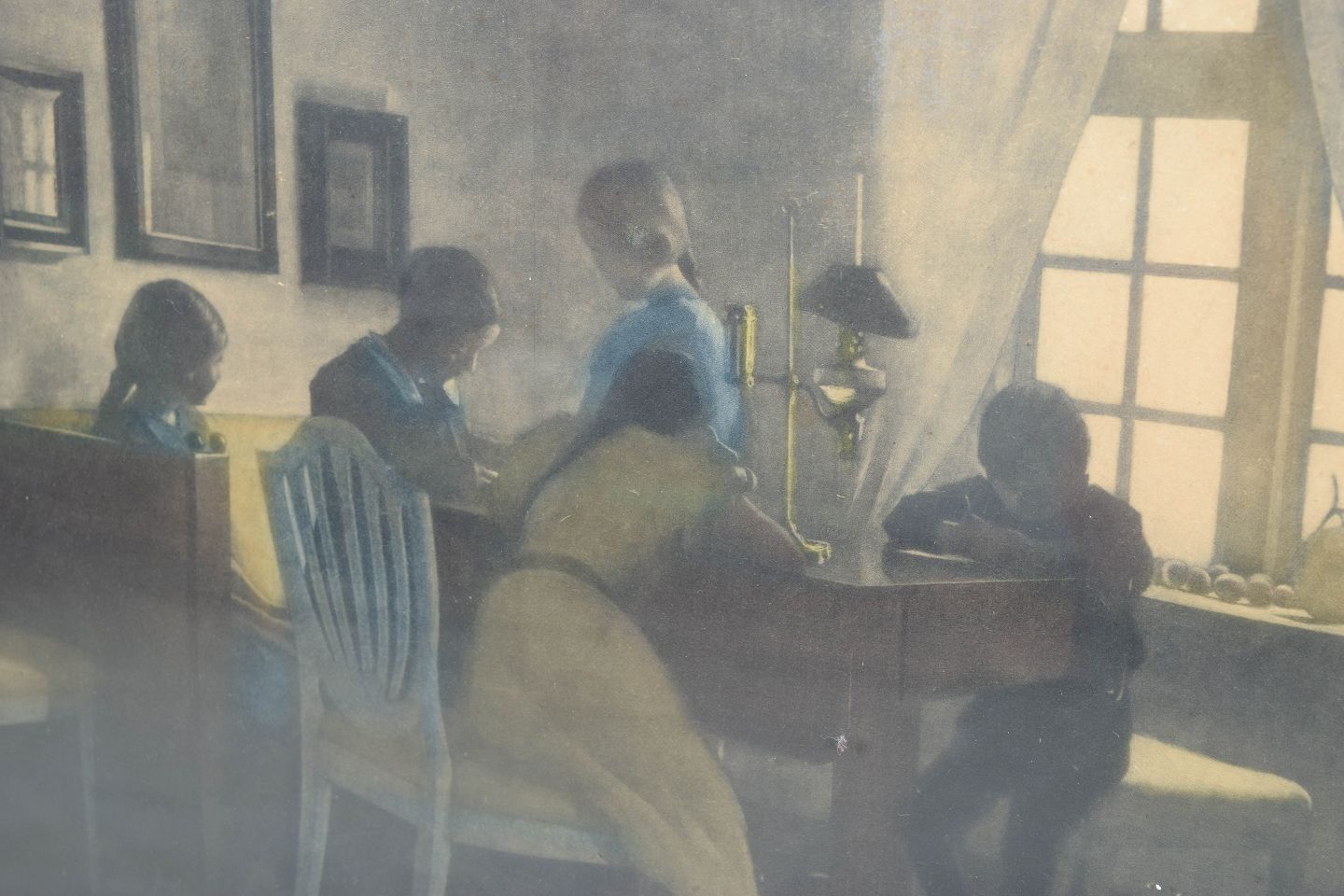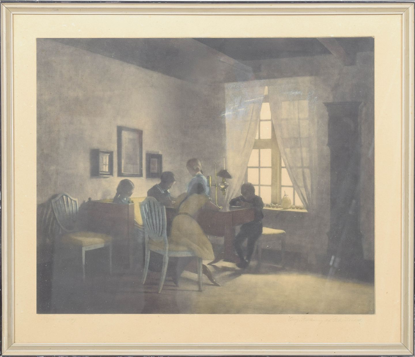Peter Ilsted, farve mezzotinte, “Regnvejrsdag”, dansk kunstner.Stille interiørscene med figurer omkring et bord i dæmpet lys, udført som mezzotinte i Ilsteds karakteristiske tonale og atmosfæriske stil. Signeret i blyant.