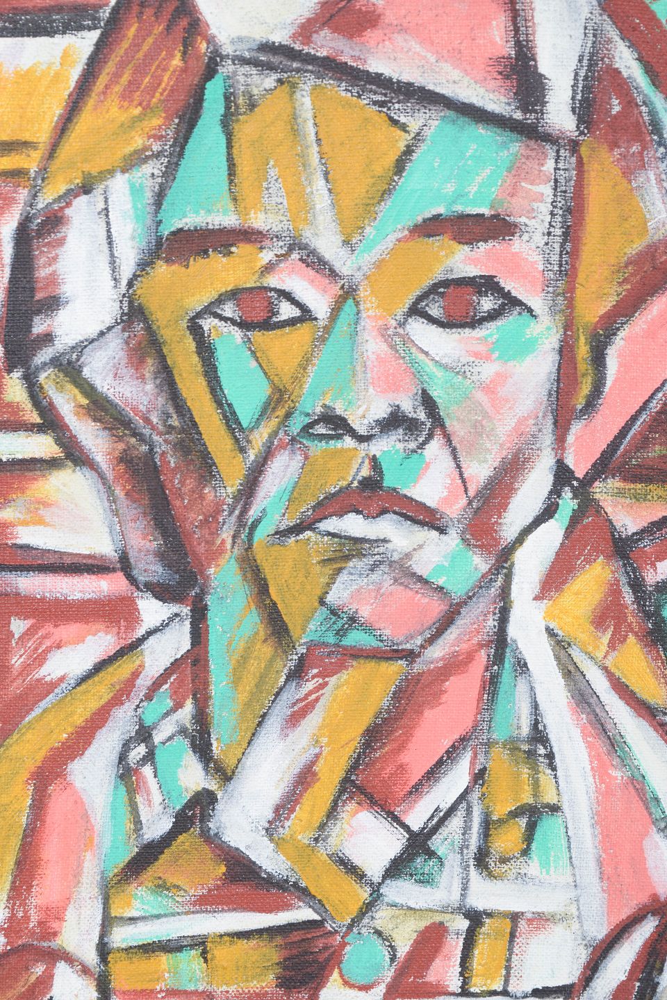 Charles Njan (født 1950), abstrakt figurkomposition, tanzaniansk kunstner.Farverig kubistisk inspireret figurkomposition med geometrisk opdelt motiv og ekspressiv penselføring, udført i olie på lærred. Usigneret.