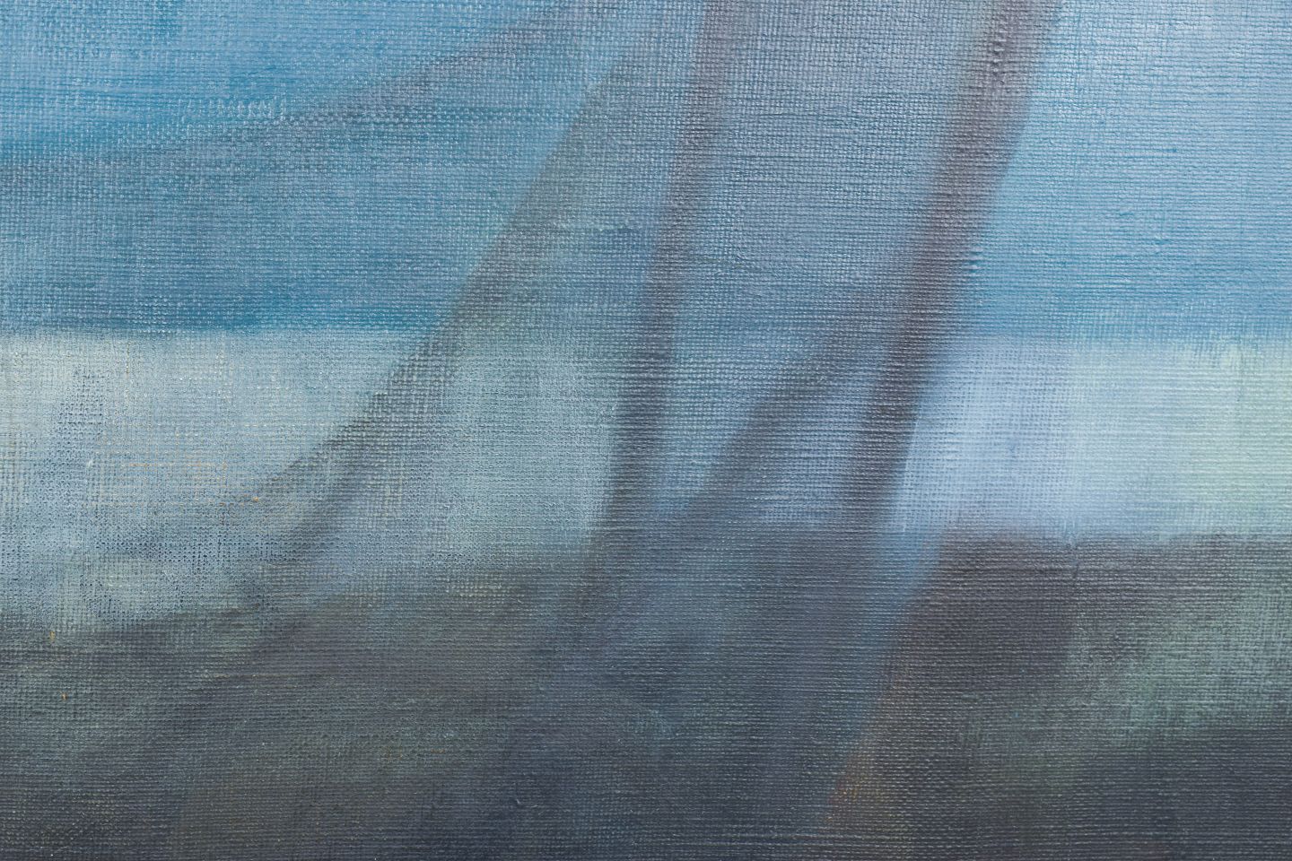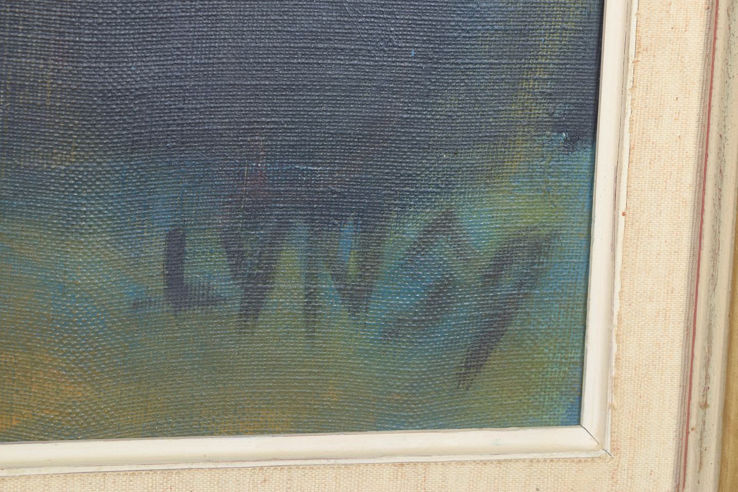 Lars Yngve Nilsson, “Svarta stenar o fiskenät”, olie på lærred, svensk kunstner.Modernistisk komposition med stiliseret landskabsmotiv, hvor mørke former og netstrukturer fremstår i en dæmpet og atmosfærisk farveholdning. Udført i olie på lærred, signeret og dateret 1959.