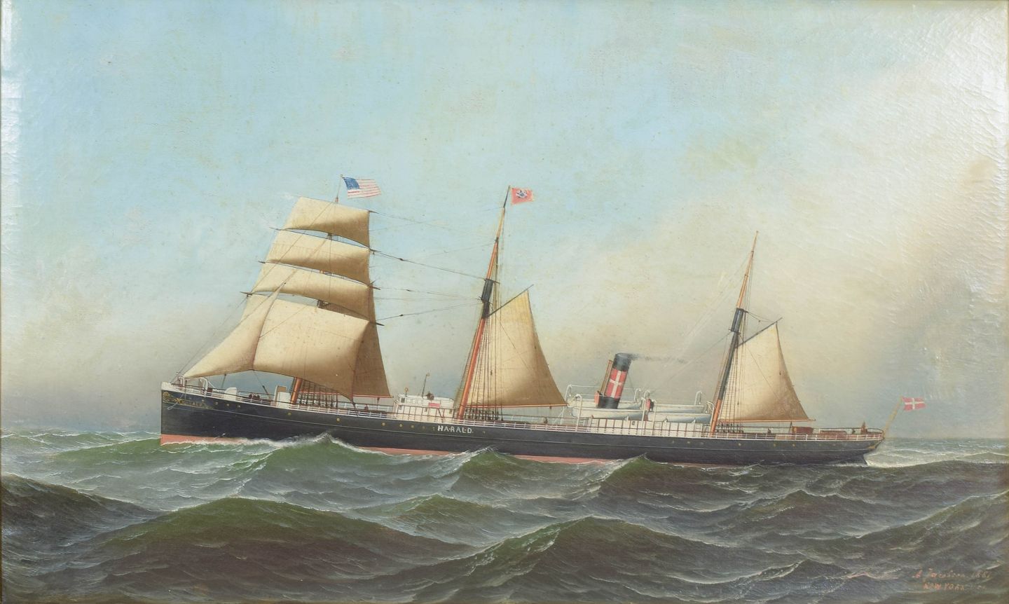 Antonio Jacobsen, marinemaleri, listet dansk-amerikansk kunstner.Detaljeret skildring af dampskib under sejl på åbent hav med bølgende sø og klar himmel. Motivet er udført med stor præcision i gengivelsen af skibets konstruktion og rigging, karakteristisk for kunstnerens maritime værker.