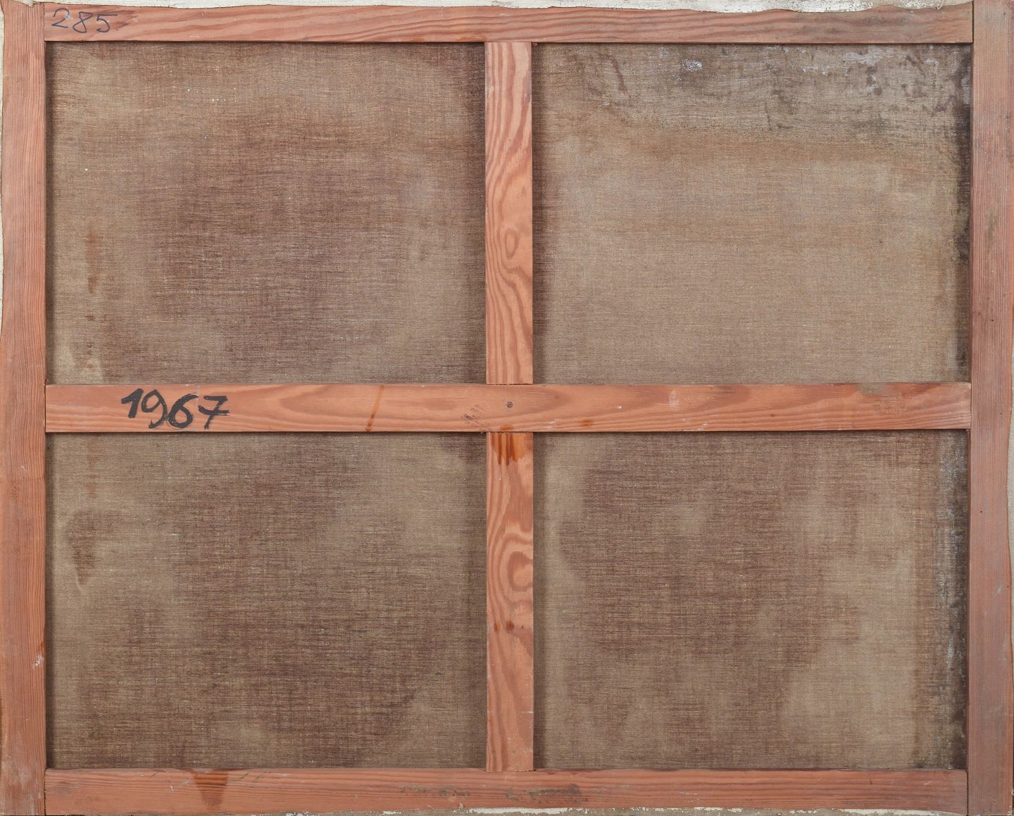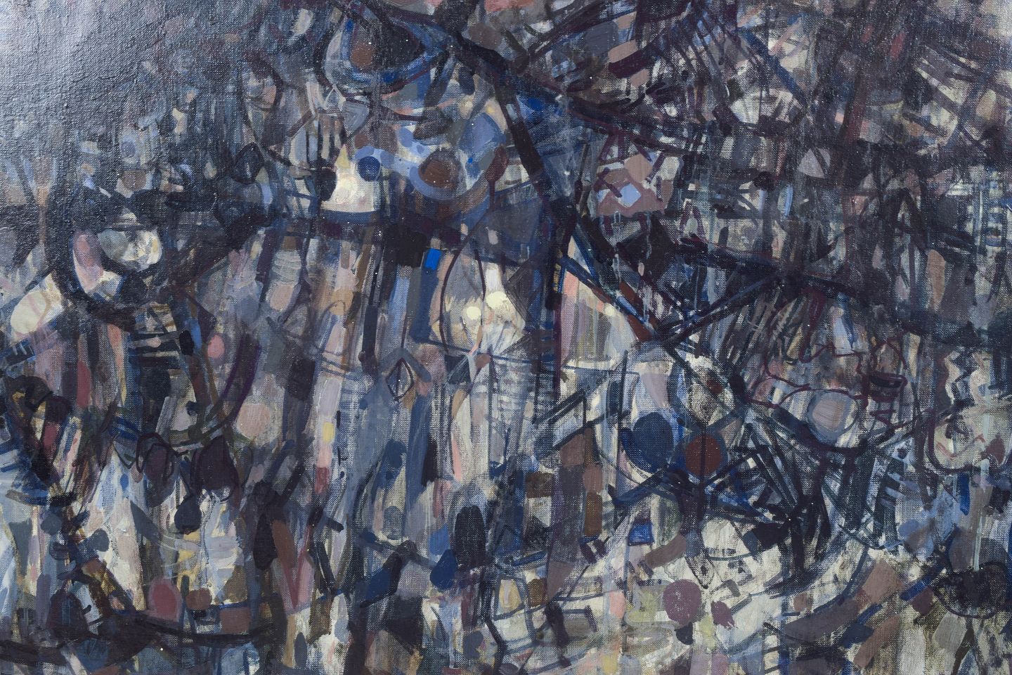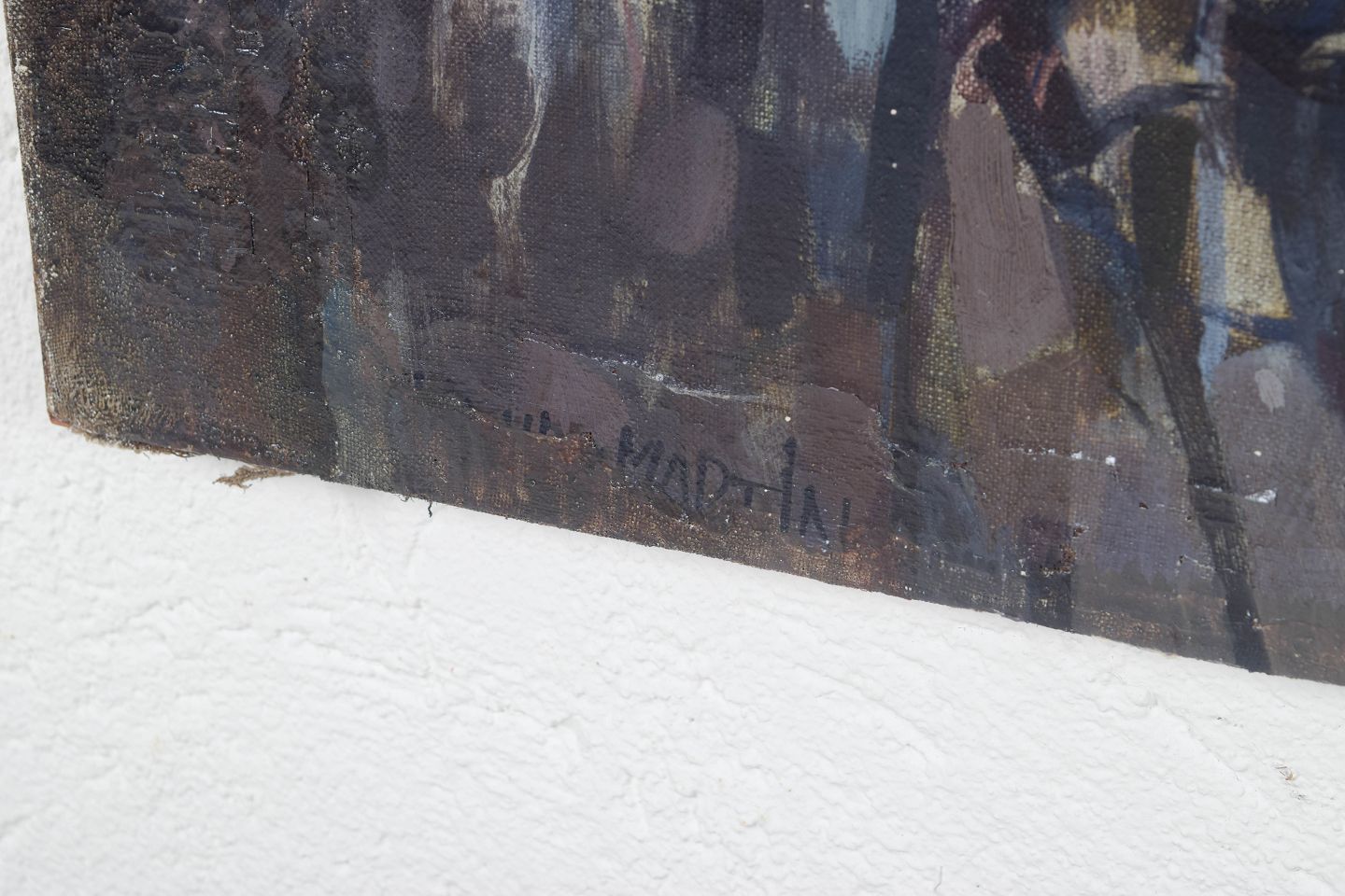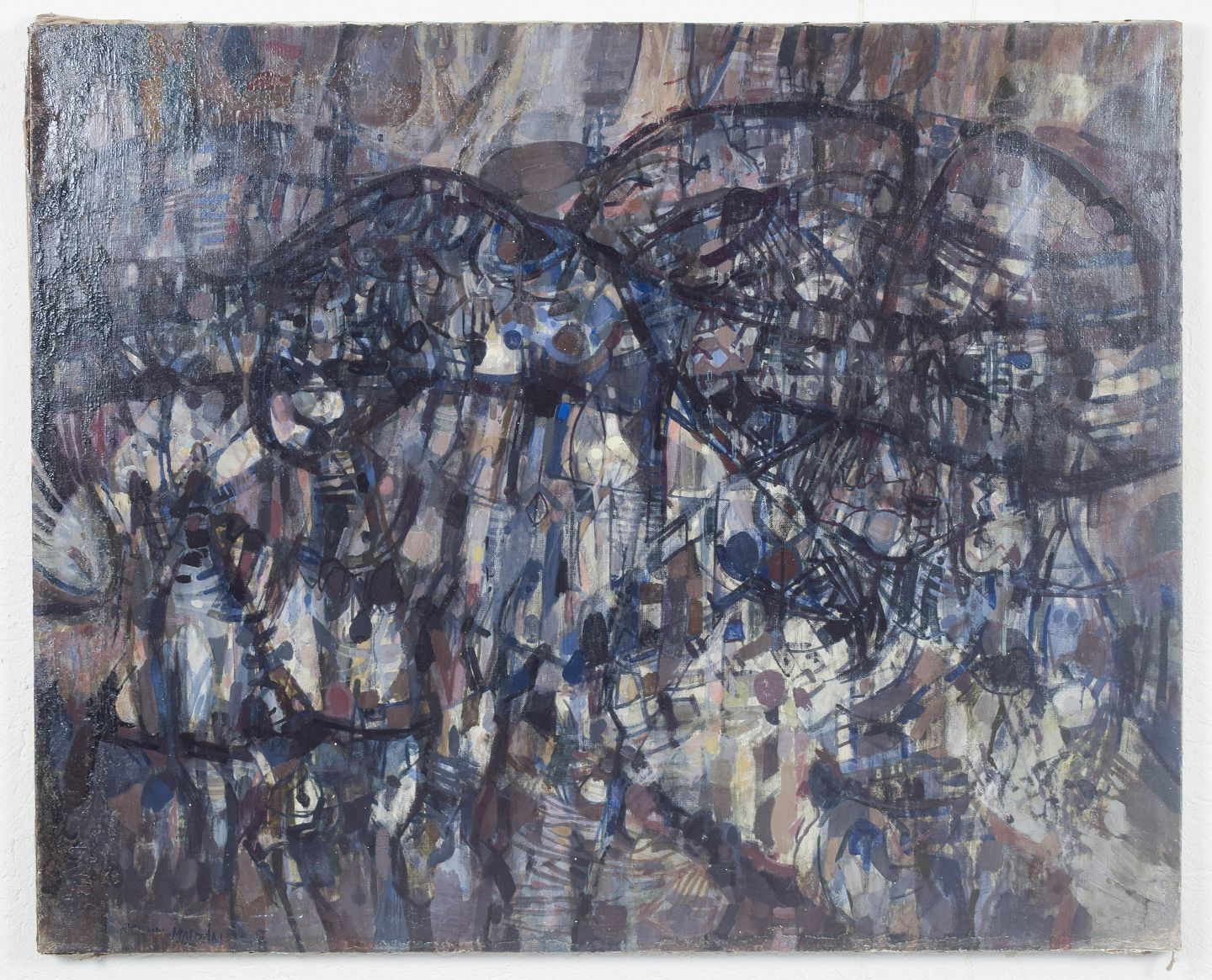 Martin, abstrakt komposition, fransk billedkunstner.Abstrakt komposition udført i en ekspressiv modernistisk stil med lagdelte penselstrøg og komplekse lineære strukturer i dæmpede blå, grå og jordfarvede nuancer. Kompositionen fremstår dynamisk med en næsten figurativ rytme i det abstrakte formsprog. Olie på lærred, signeret og dateret 1967.