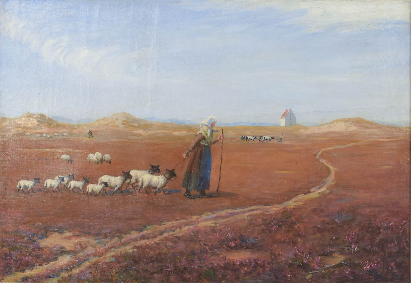 Albert Petersen, “Dyrene tages hjem”, olie på lærred, listet dansk kunstner.Naturalistisk landskabsmotiv med hyrde og fåreflok i åbent terræn, udført i en rolig og stemningsfuld farveholdning. Kompositionen afspejler landlivets rytme omkring århundredeskiftet, med fokus på lys, rum og fortælling. Signeret.