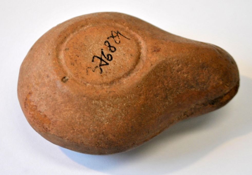 Antik romersk olielampe. Oldtid. Rødler. Med dekorationer på oversiden. L.: 8 cm.Emne nummer: 29178