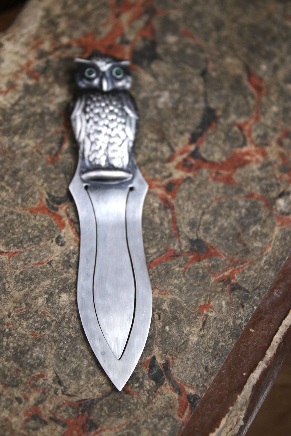 Gammelt bogmærke i sølv i form af en lille ugle med grønne glas øjne. Stemplet 830s. Længde: 8,6cm.Emne nummer: Bogmærke sølv nr.2