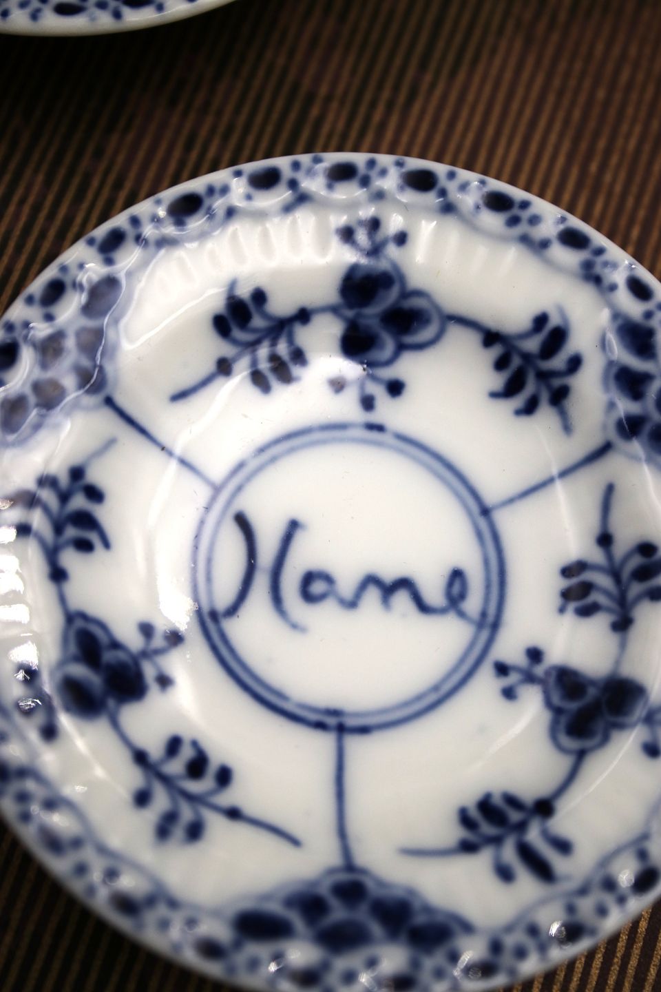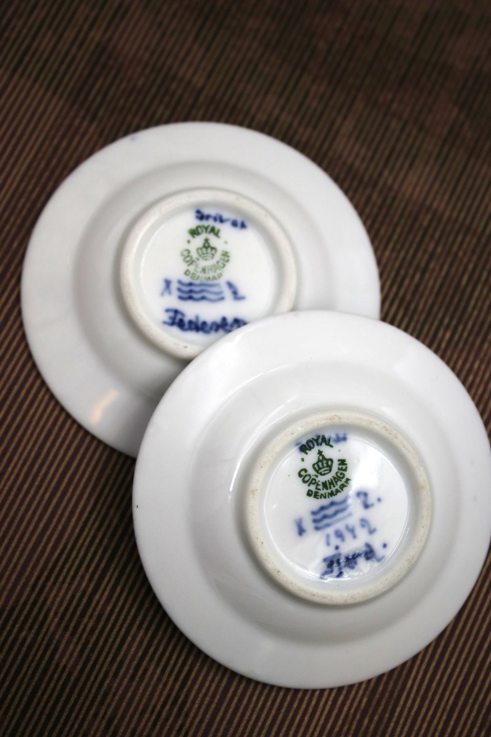 2 stk. gamle Musselmalet Halvblonde små assietter fra Royal Copenhagen , med datering og stemplet 1942. Dia.: 7,3cm.1.sortering. ( privatmalet af ansat med teksten i midten af asietten