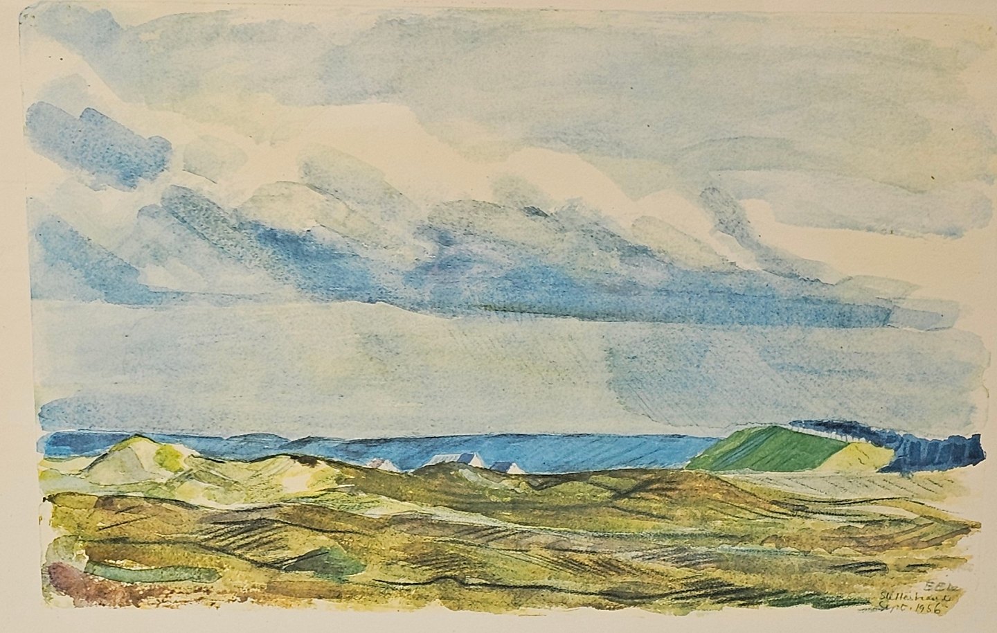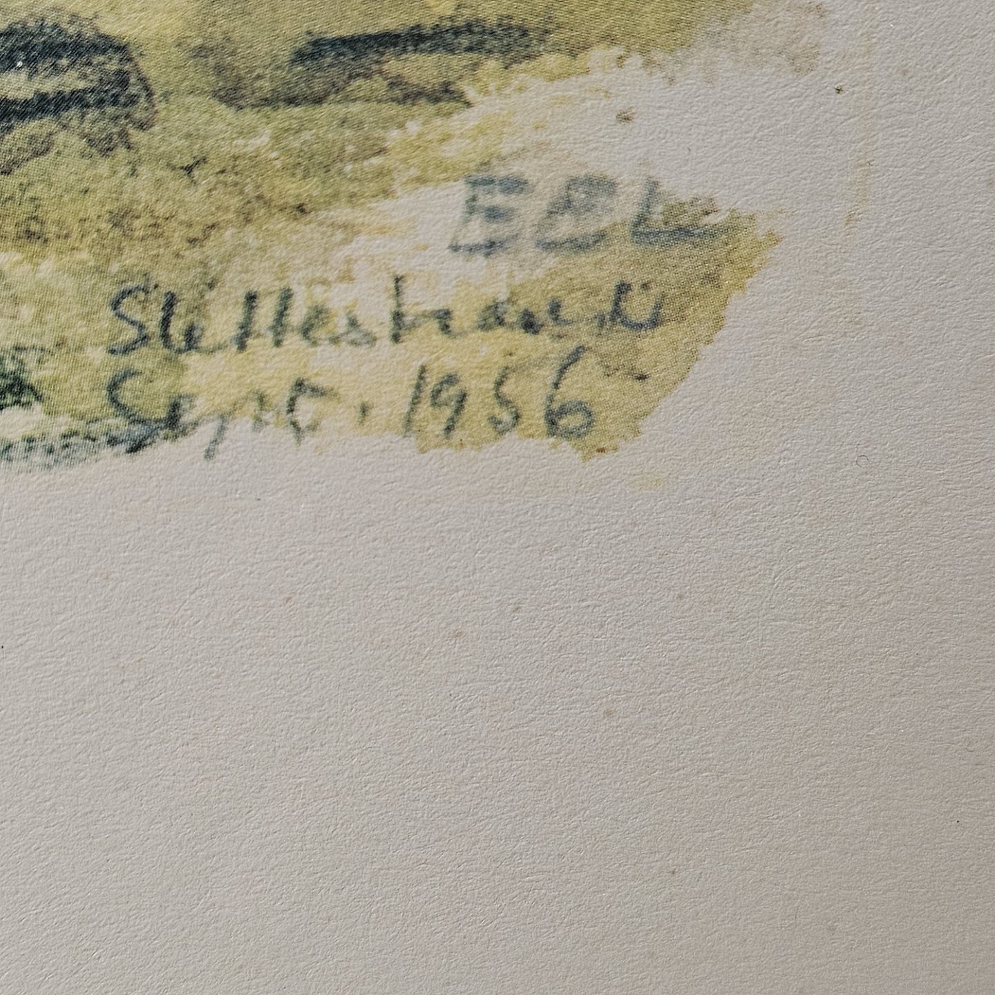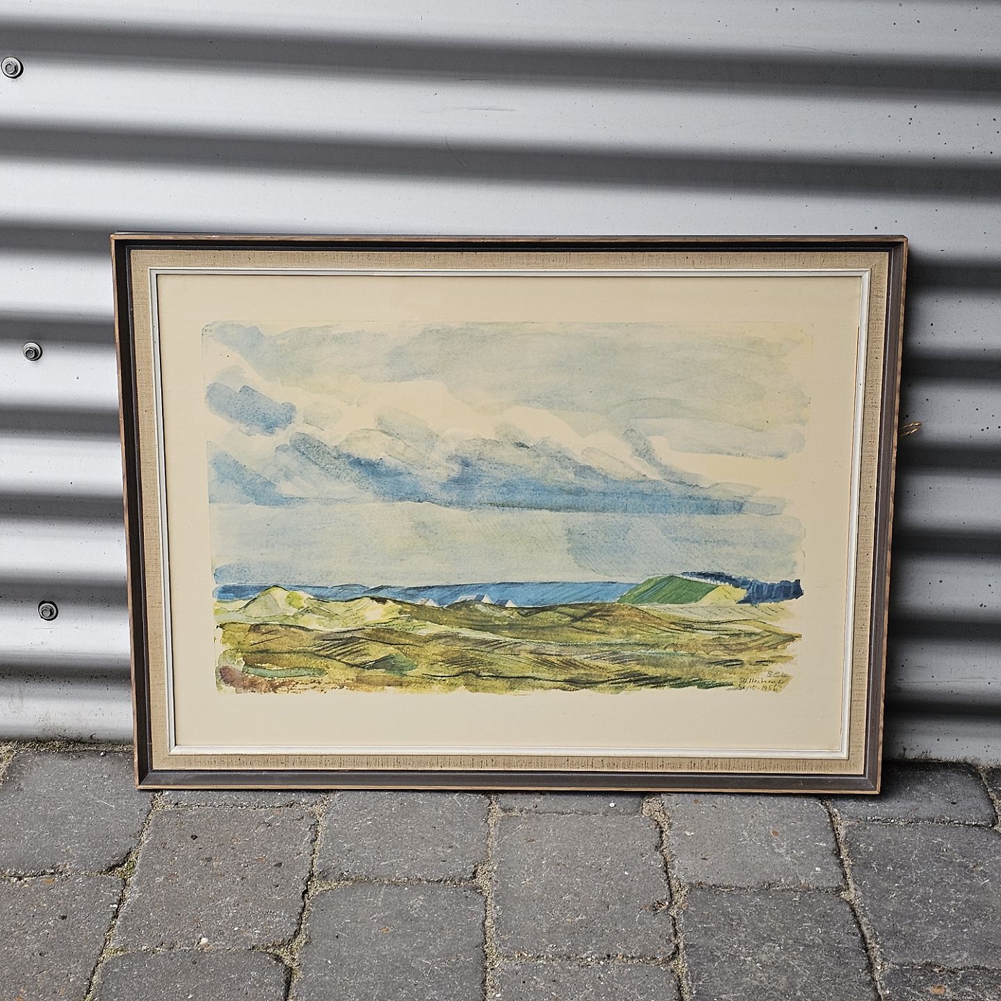 Akvarel maleri på papir med motiv af Slettestrand. Monteret i sortmalet træramme, dateret 1956Kunstner ukendt, signeret EEL
