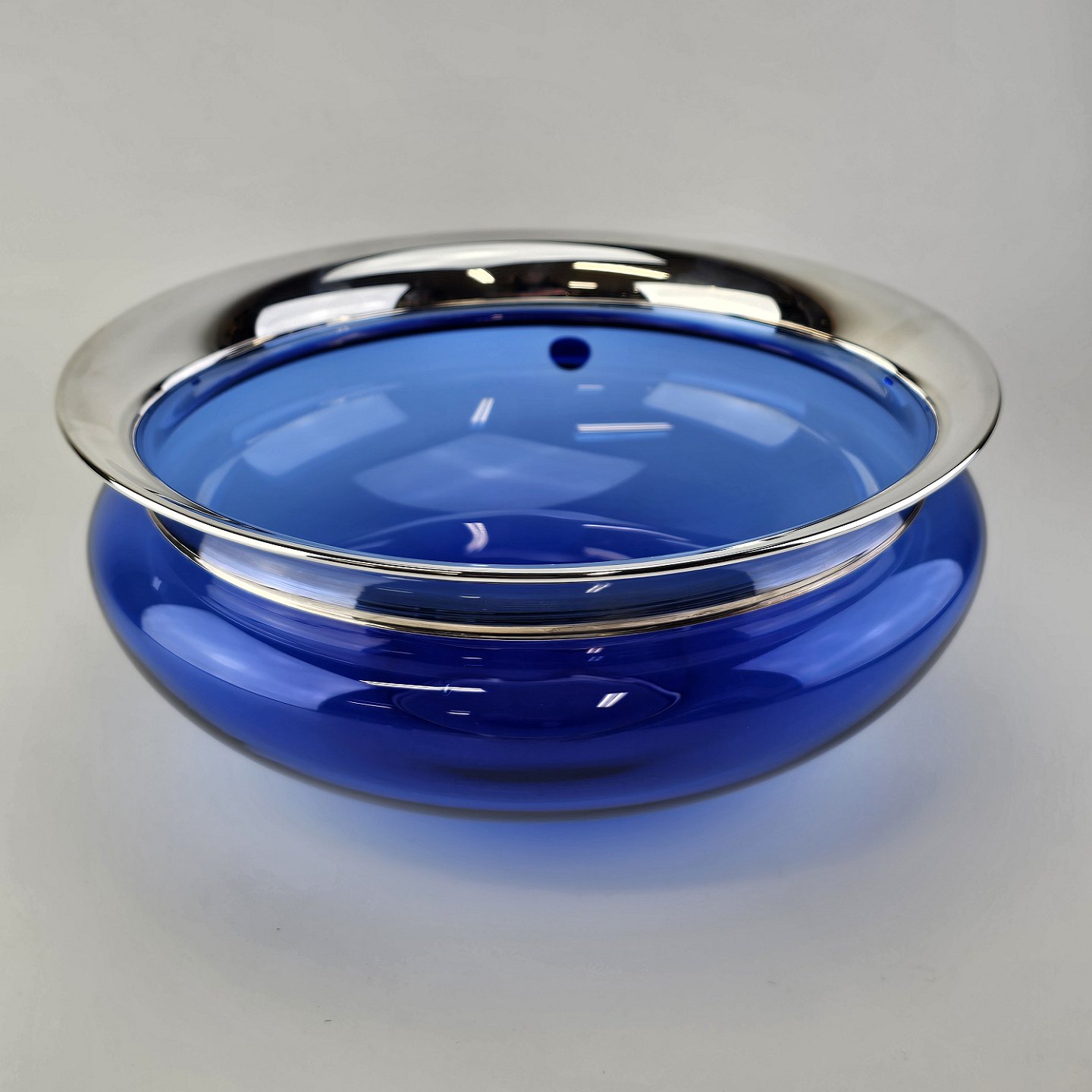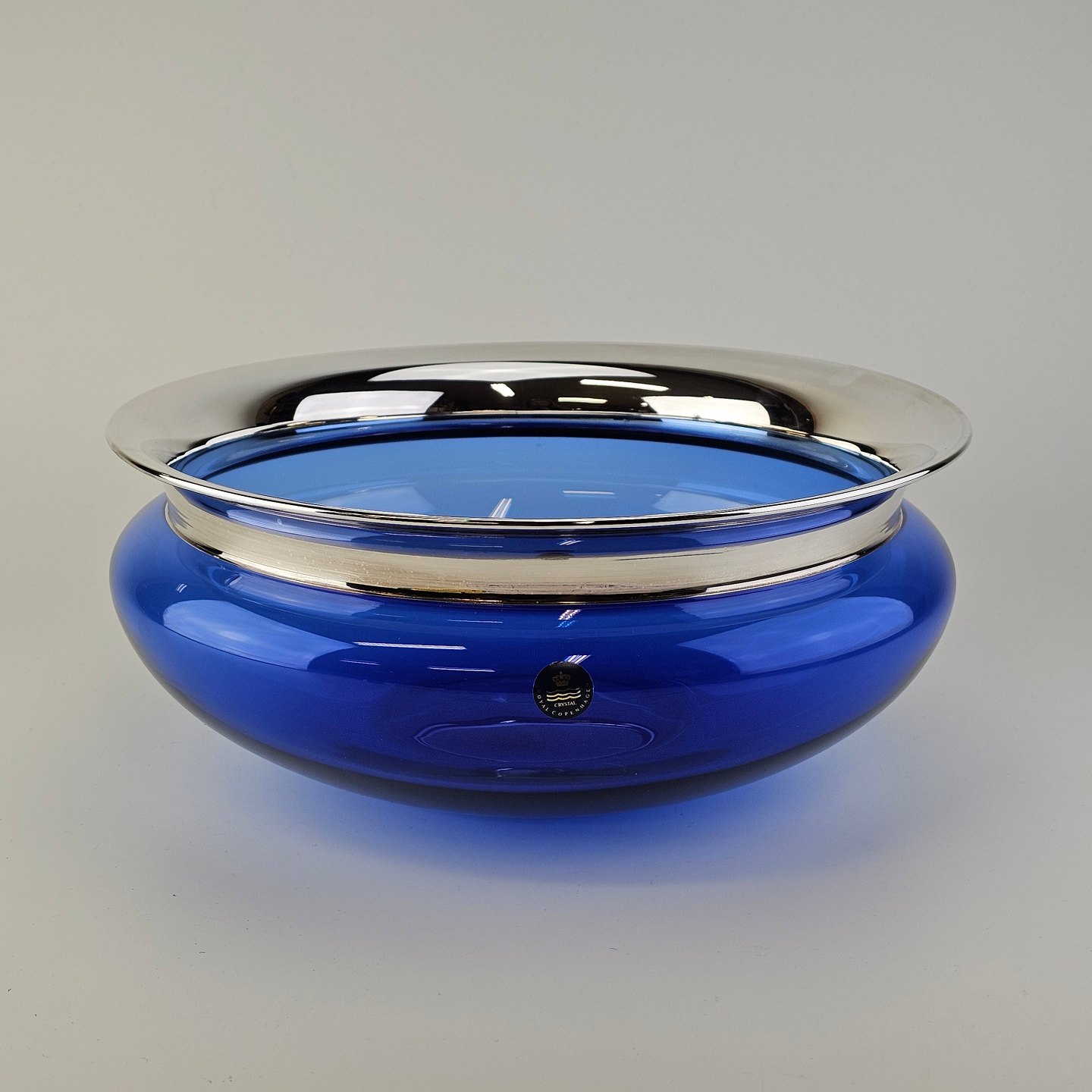 Mundblæst skål i blåt krystalglas med kant dyppet i sølv, fra serien Saturn