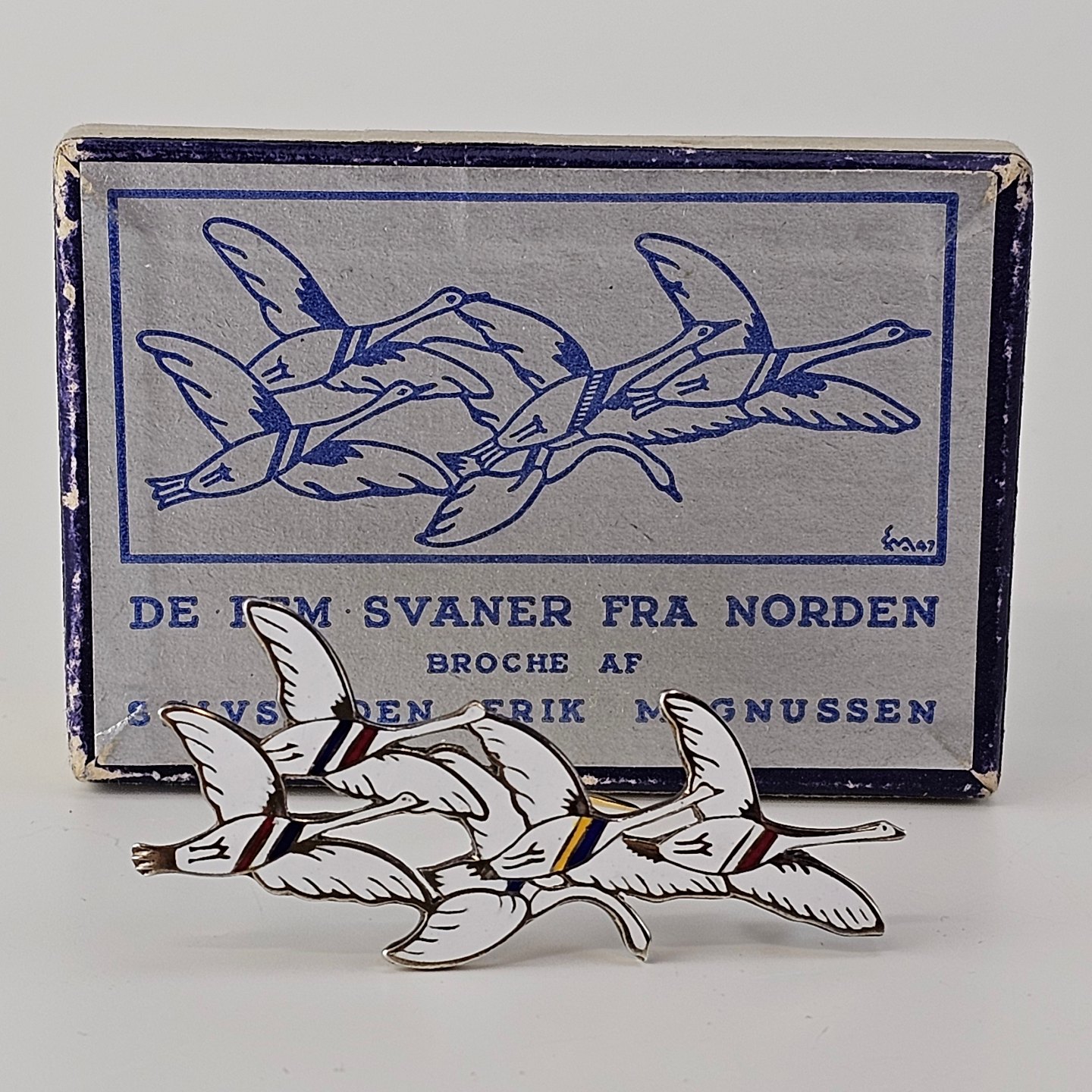 Broche i sterling sølv og emalje med motiv af fem svaner dekoreret med farver for de fem nordiske landeInklusiv original kasse, sjældent
