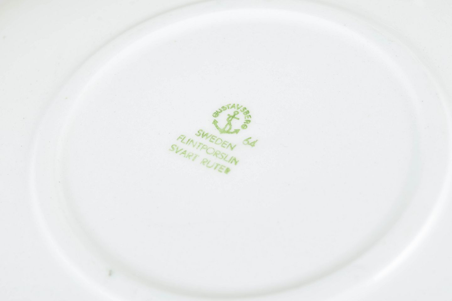 Karin Björquist for Gustavsberg, frokosttallerkener “Svart Ruter”, sæt af seks.Sæt bestående af seks små frokosttallerkener i porcelæn med karakteristisk sort rudemønster, udført i et enkelt og funktionelt formsprog fra perioden.