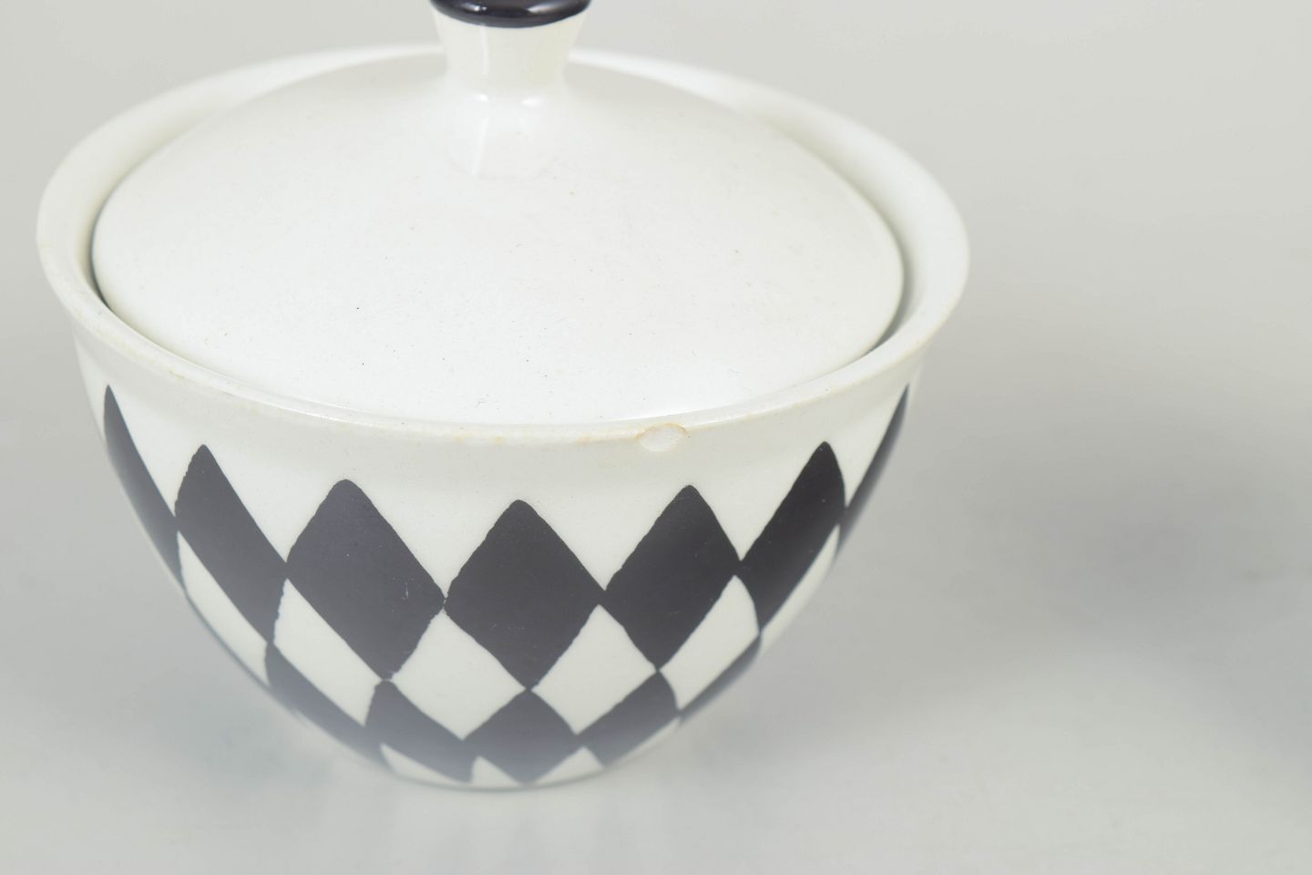 Karin Björquist for Gustavsberg, creamer set “Svart Ruter”.Set consisting of lidded sugar bowl and creamer in porcelain with a distinctive black diamond pattern, designed in a simple and functional style typical of the period.