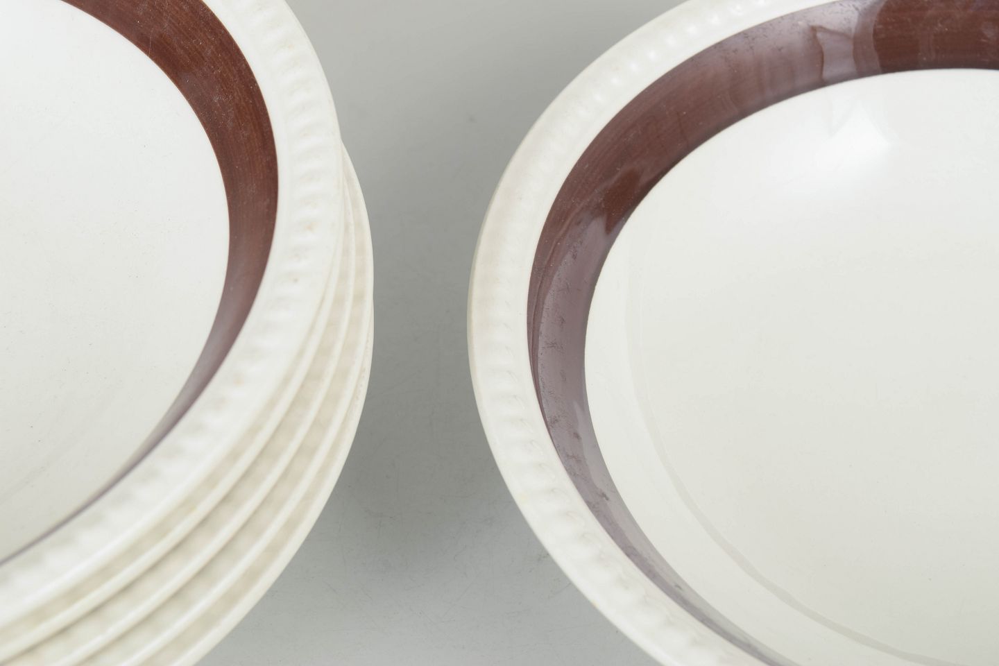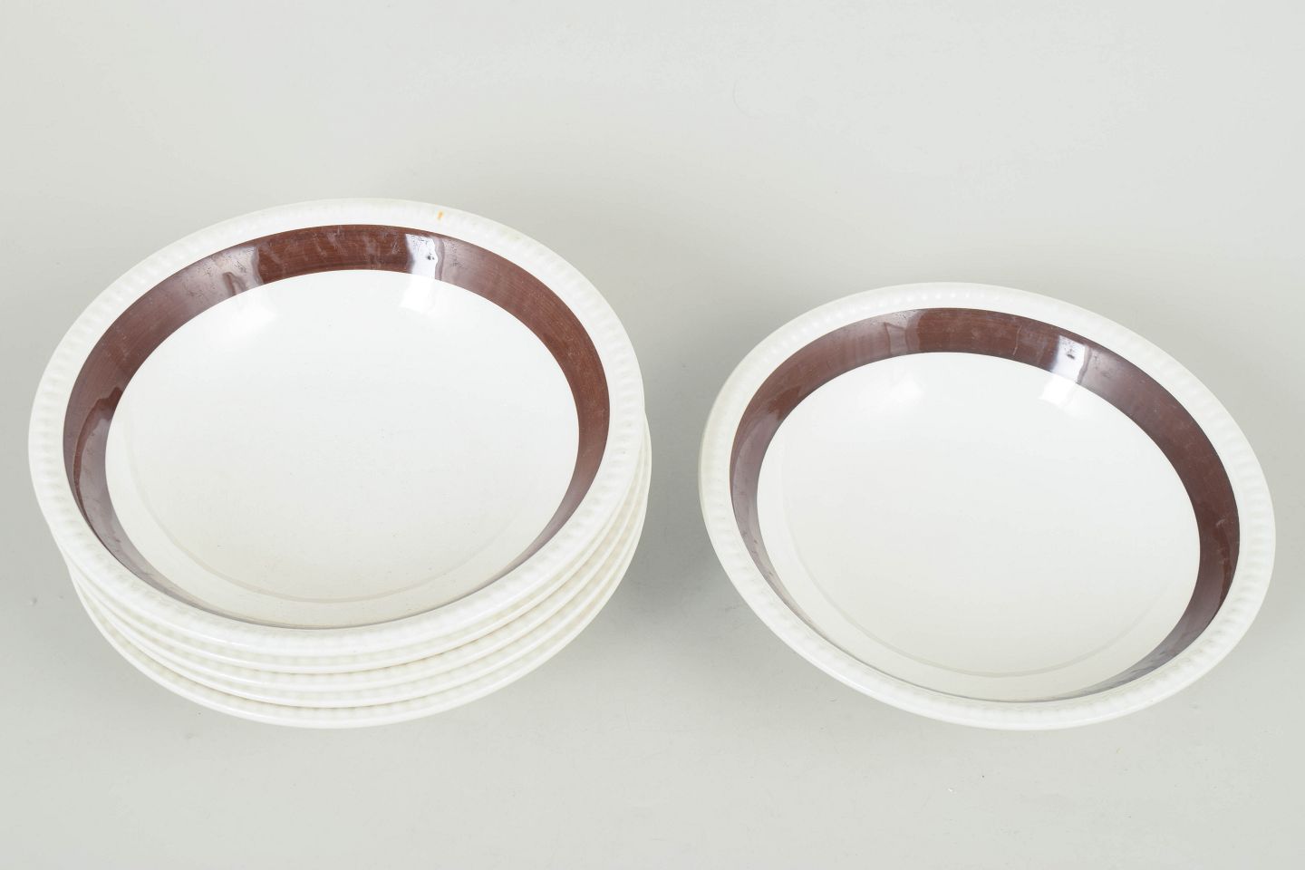 Gefle "Malta", sæt af seks dybe tallerkener.Klassisk retro stel i porcelæn med brun randdekoration på hvid bund, karakteristisk for skandinavisk bordservice fra midten af det 20. århundrede.